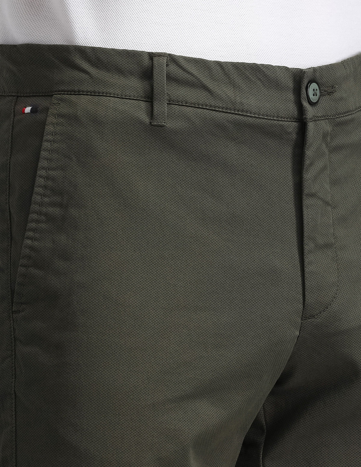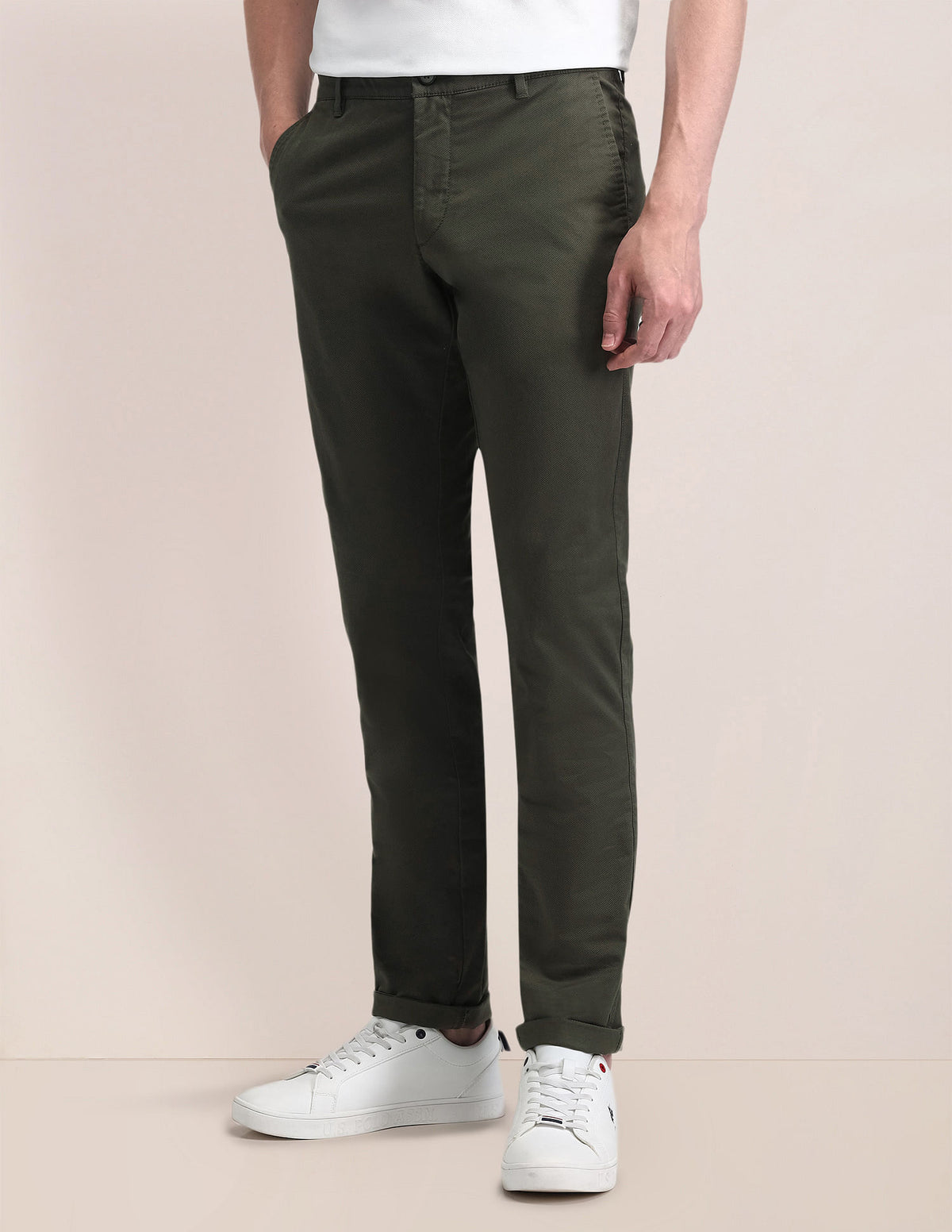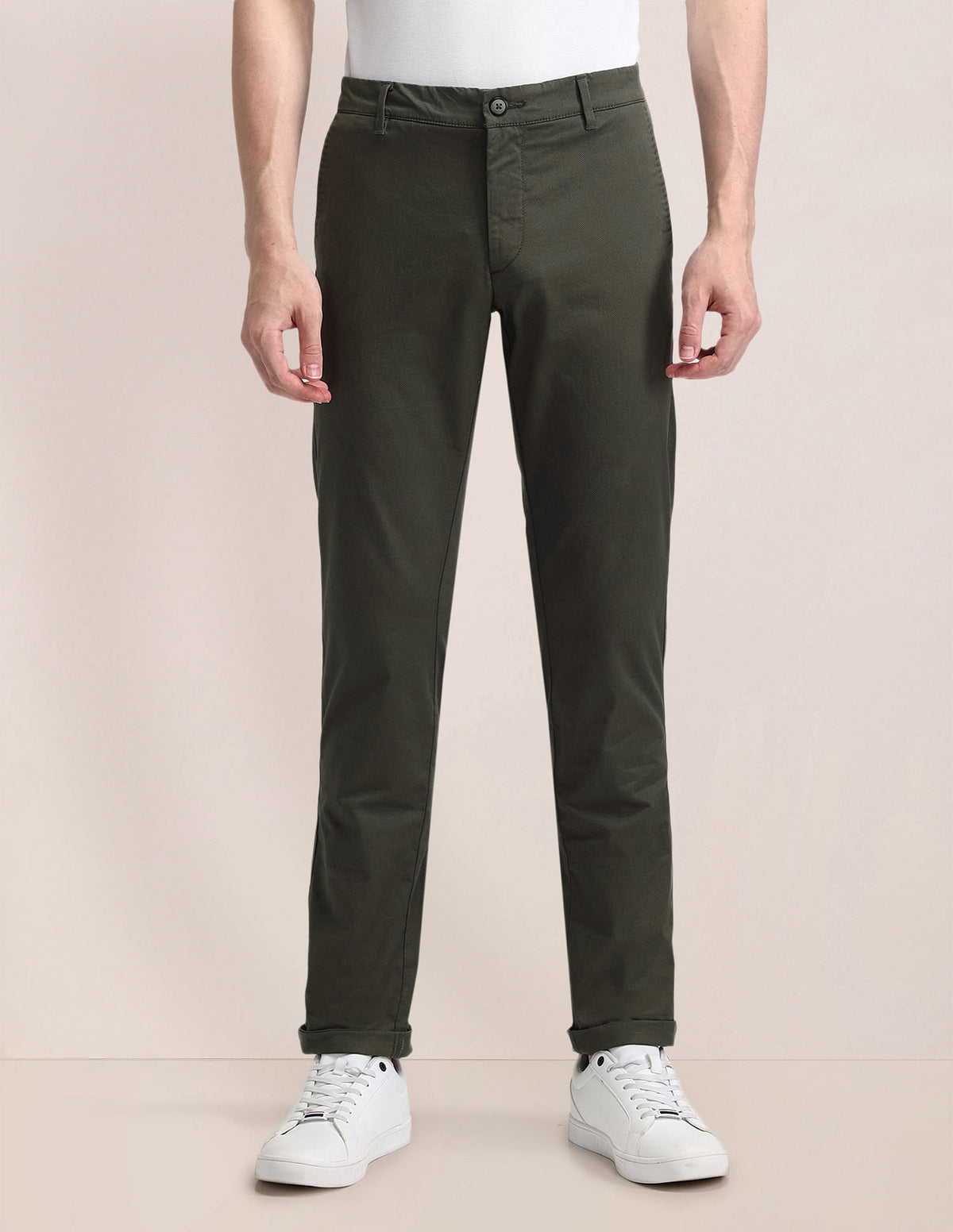 | Mid-rise waist | Button and zip fly closure | Four pockets | Flat front | Solid pattern | Slim fit