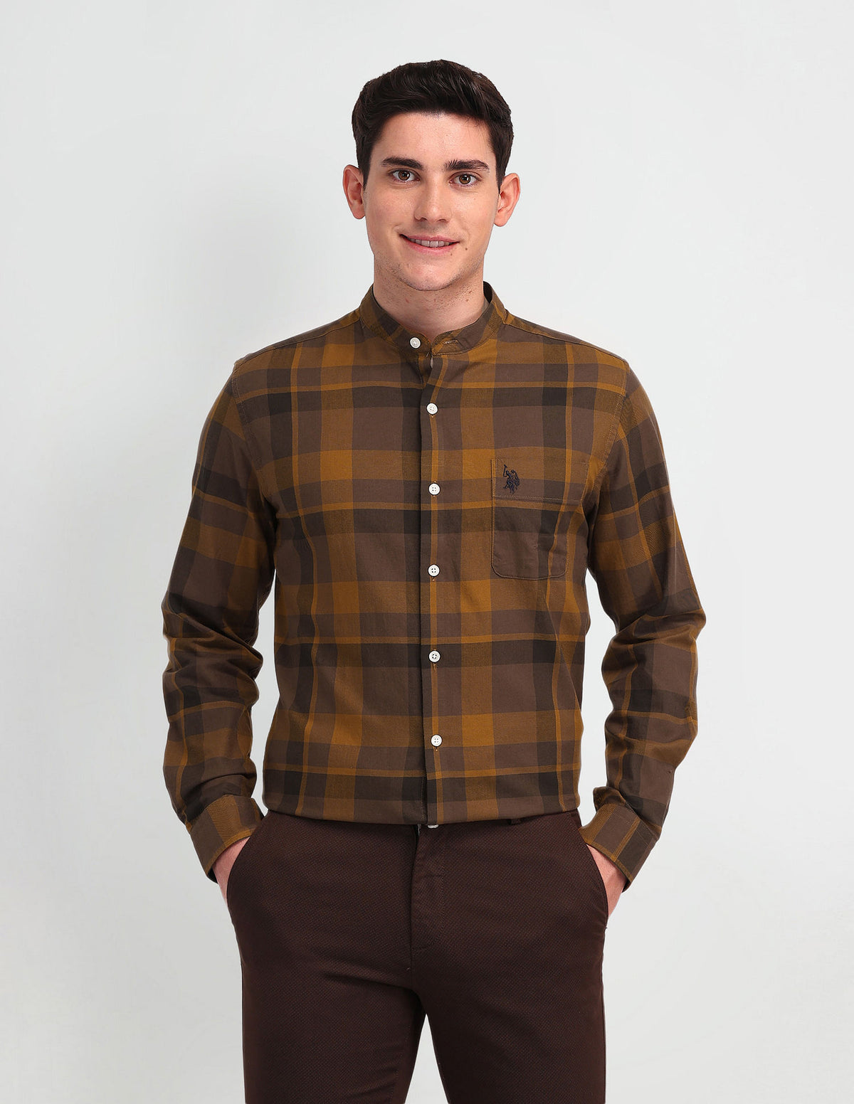 | Mandarin collar | Logo at chest | Full button placket | Long sleeves with rounded cuffs | Curved hemline | Vertical striped pattern | Twill weave | Slim fit |
