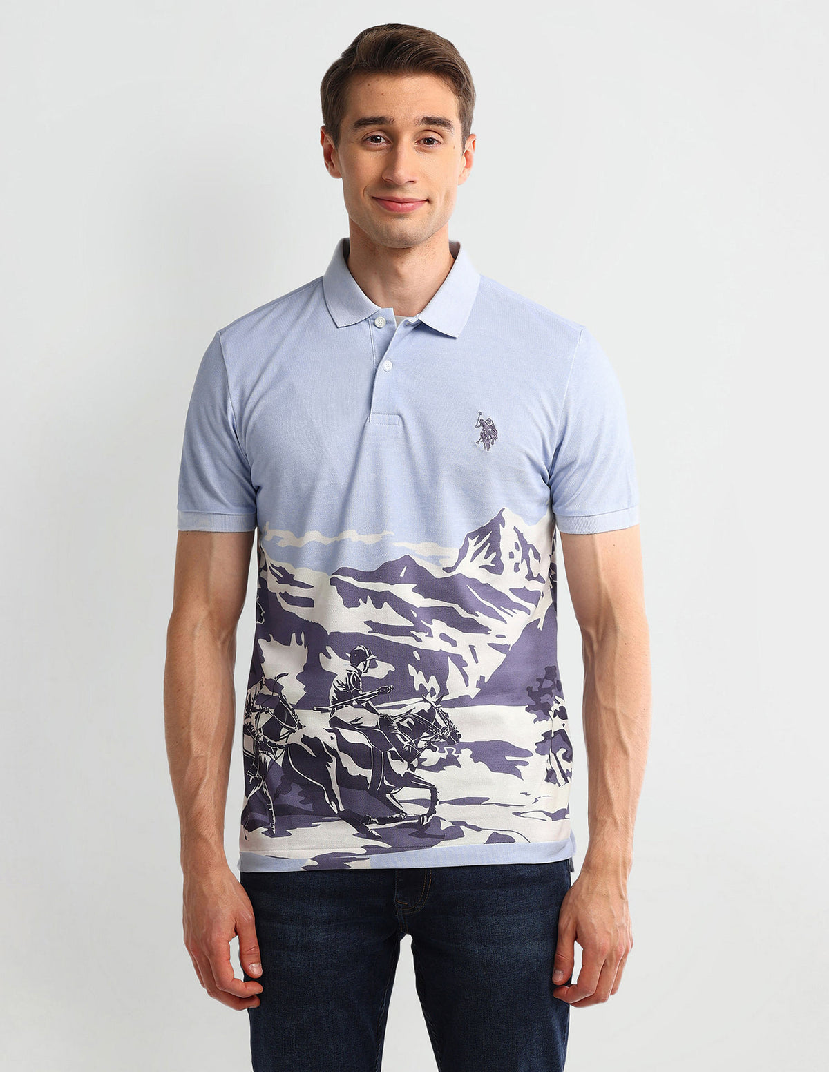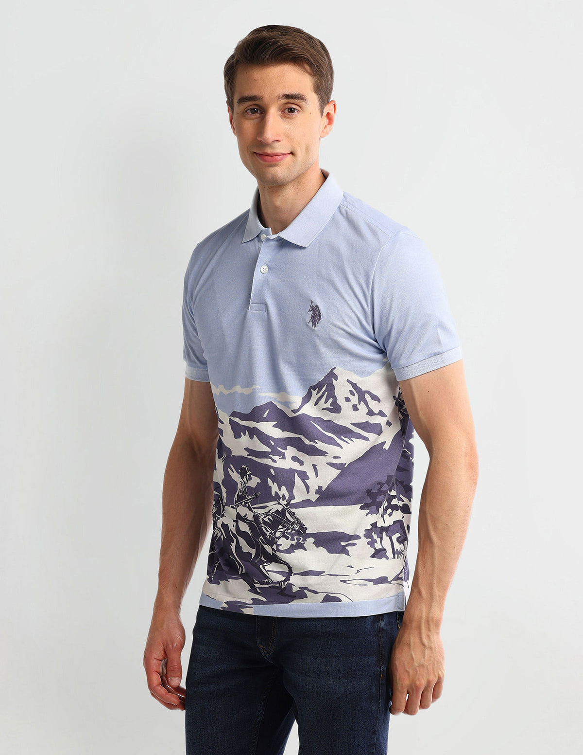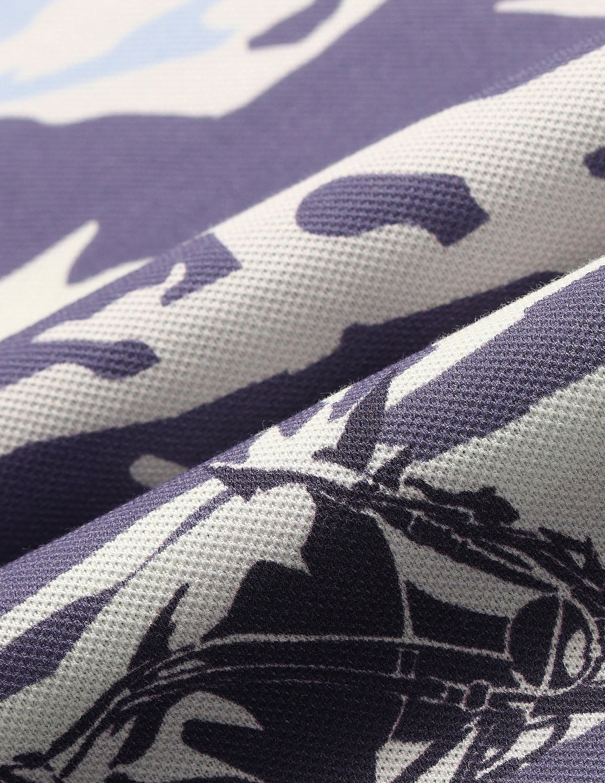Polo collar | Short button placket | Short sleeves | Ribbed collar and sleeve hems | Uneven vented hem | Graphic printed pattern| Muscle fit |