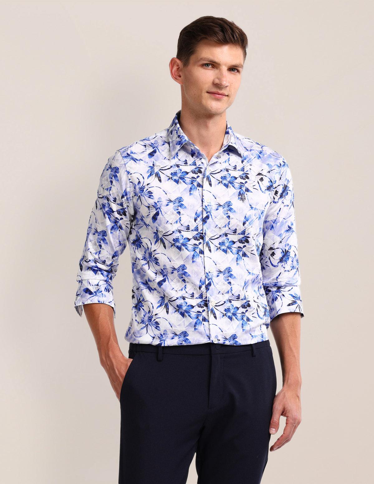 Story: Embrace casual elegance with this blue floral shirt, featuring a modern spread neckline and a relaxed floral pattern.