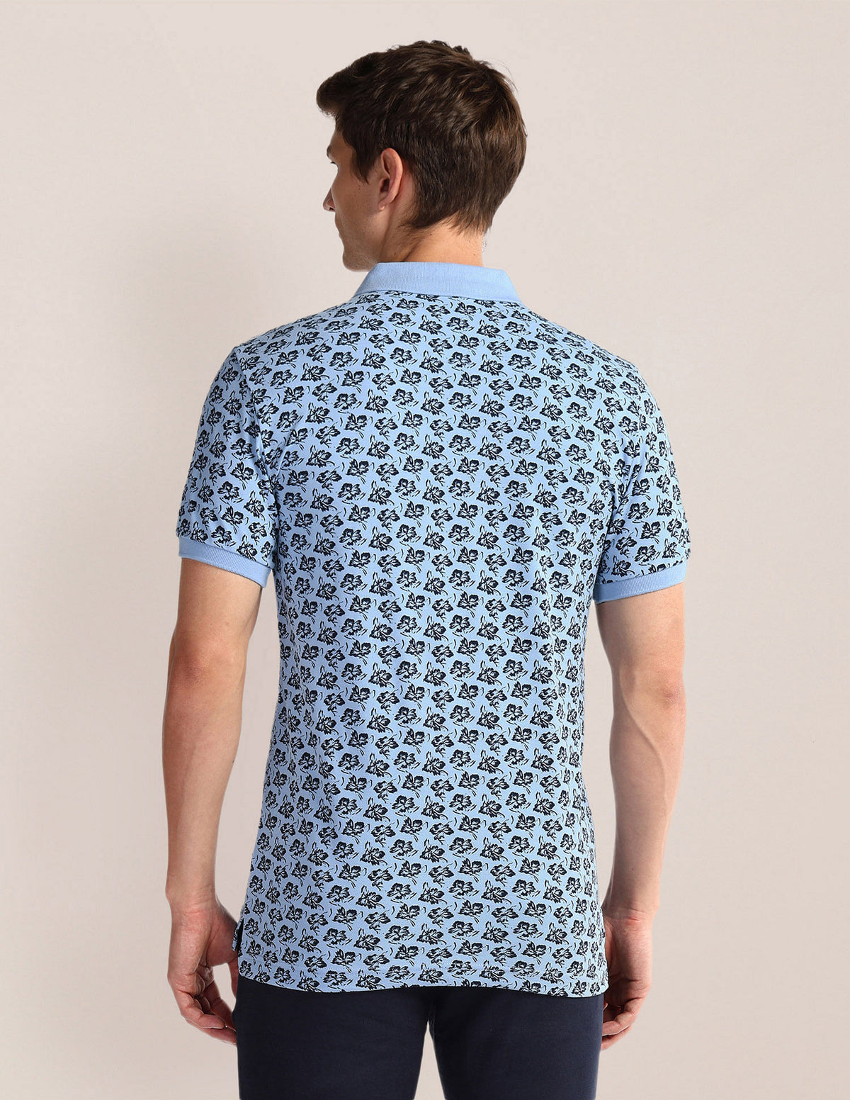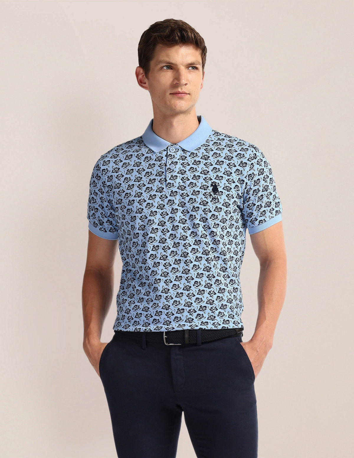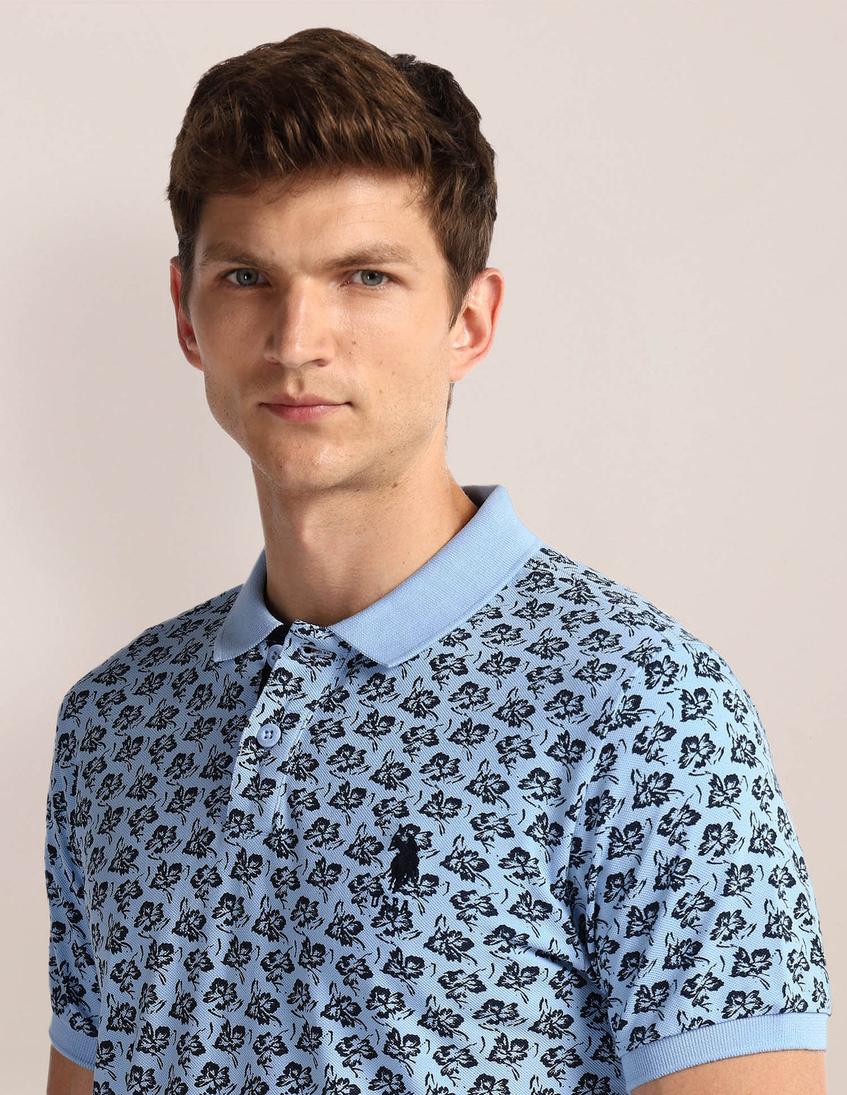 | Polo collar | Logo at chest | Short button placket | Short sleeves | Ribbed collar and sleeve hems | Vented hemline | Floral printed pattern | Knitted | Slim fit