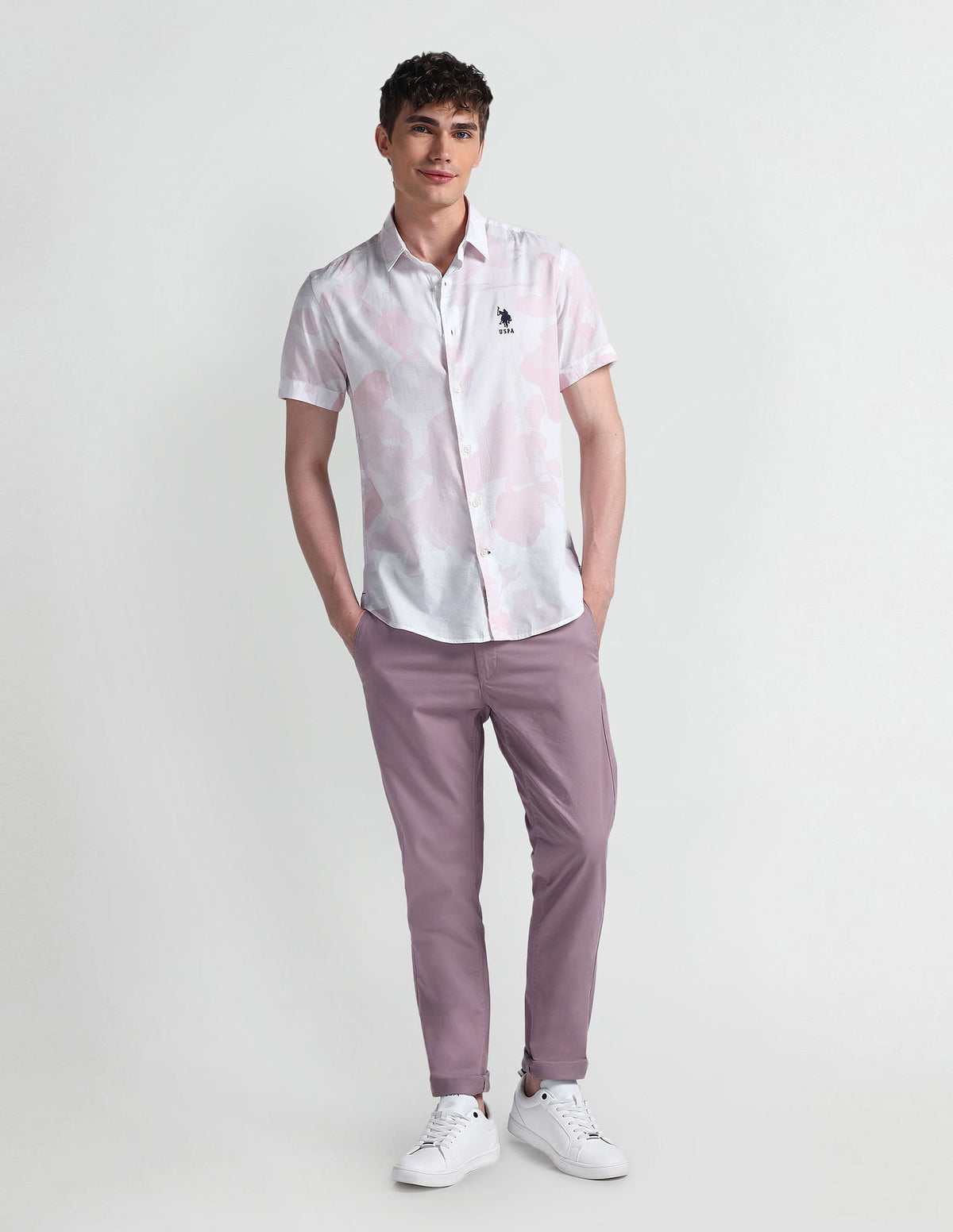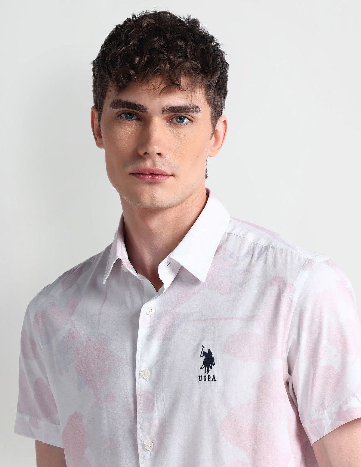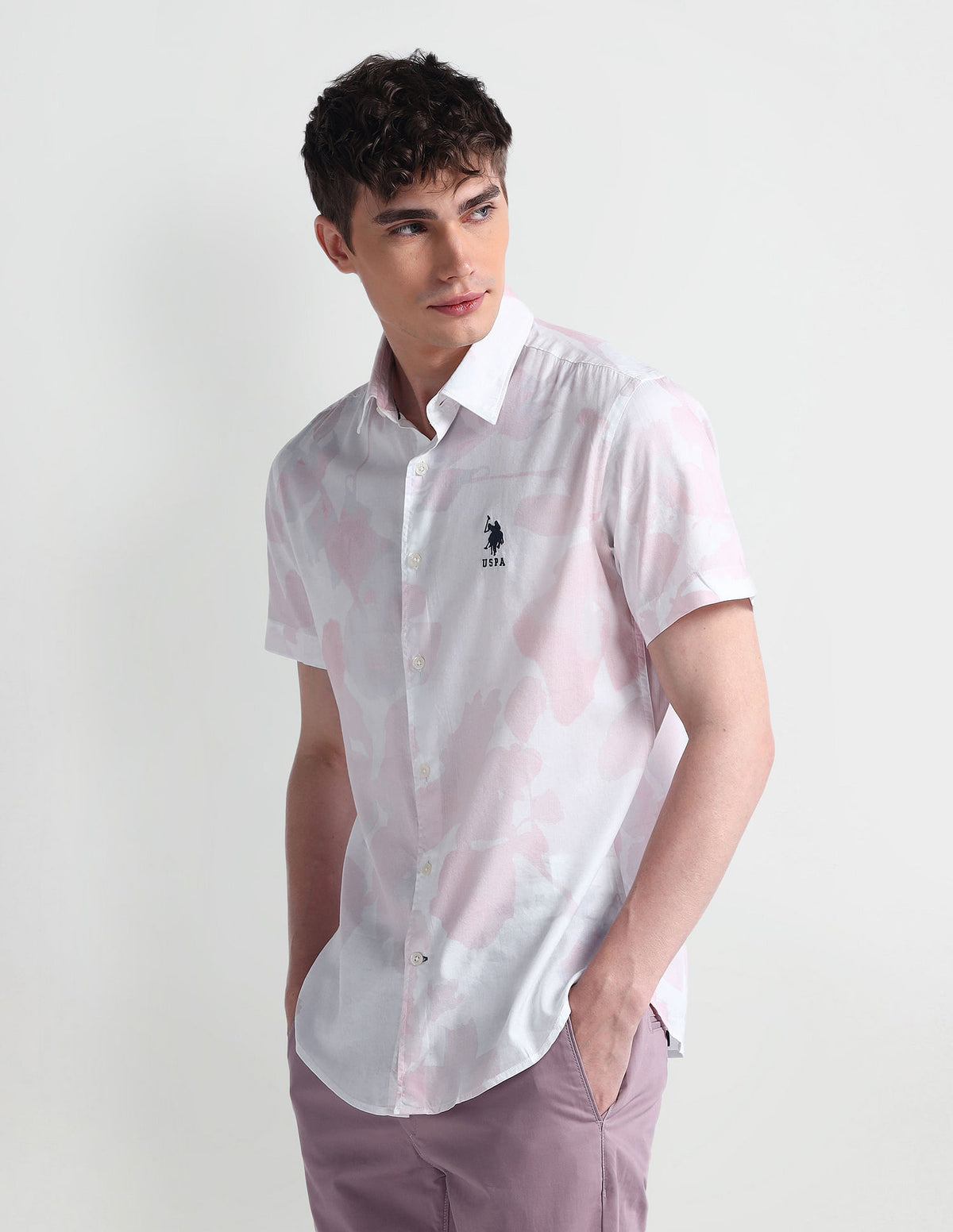 | Semi-cutaway collar | Logo at chest | Full button placket | Short sleeves | Curved hemline | Floral printed pattern | Regular weave | Slim fit