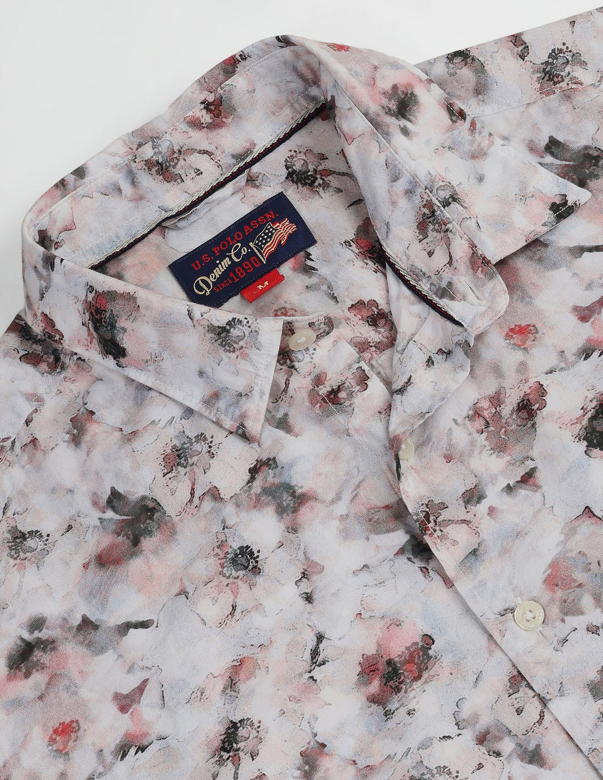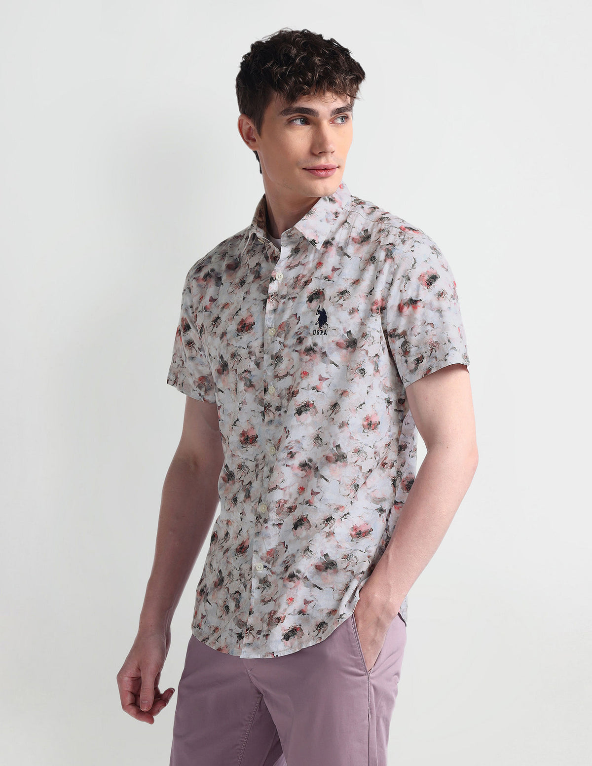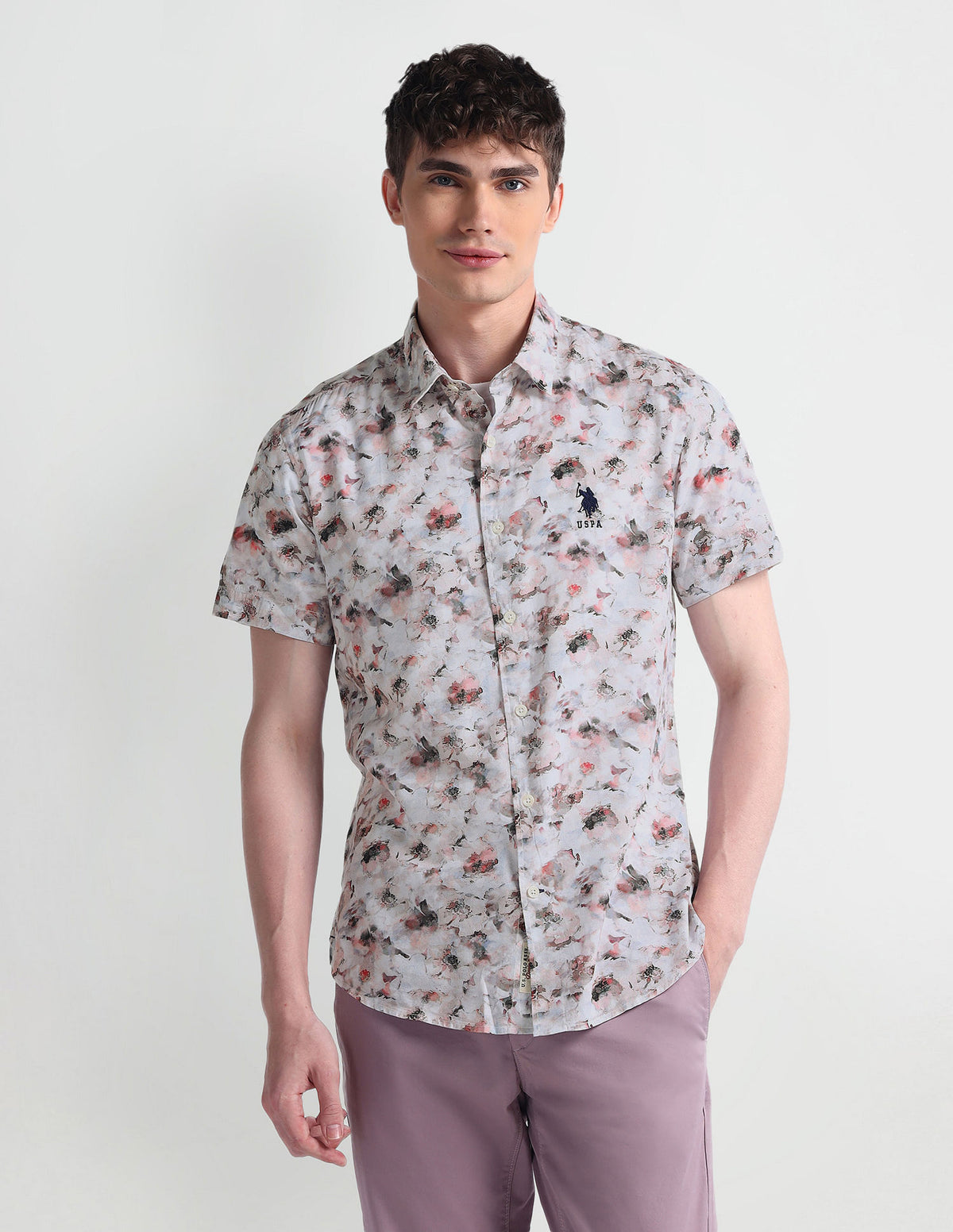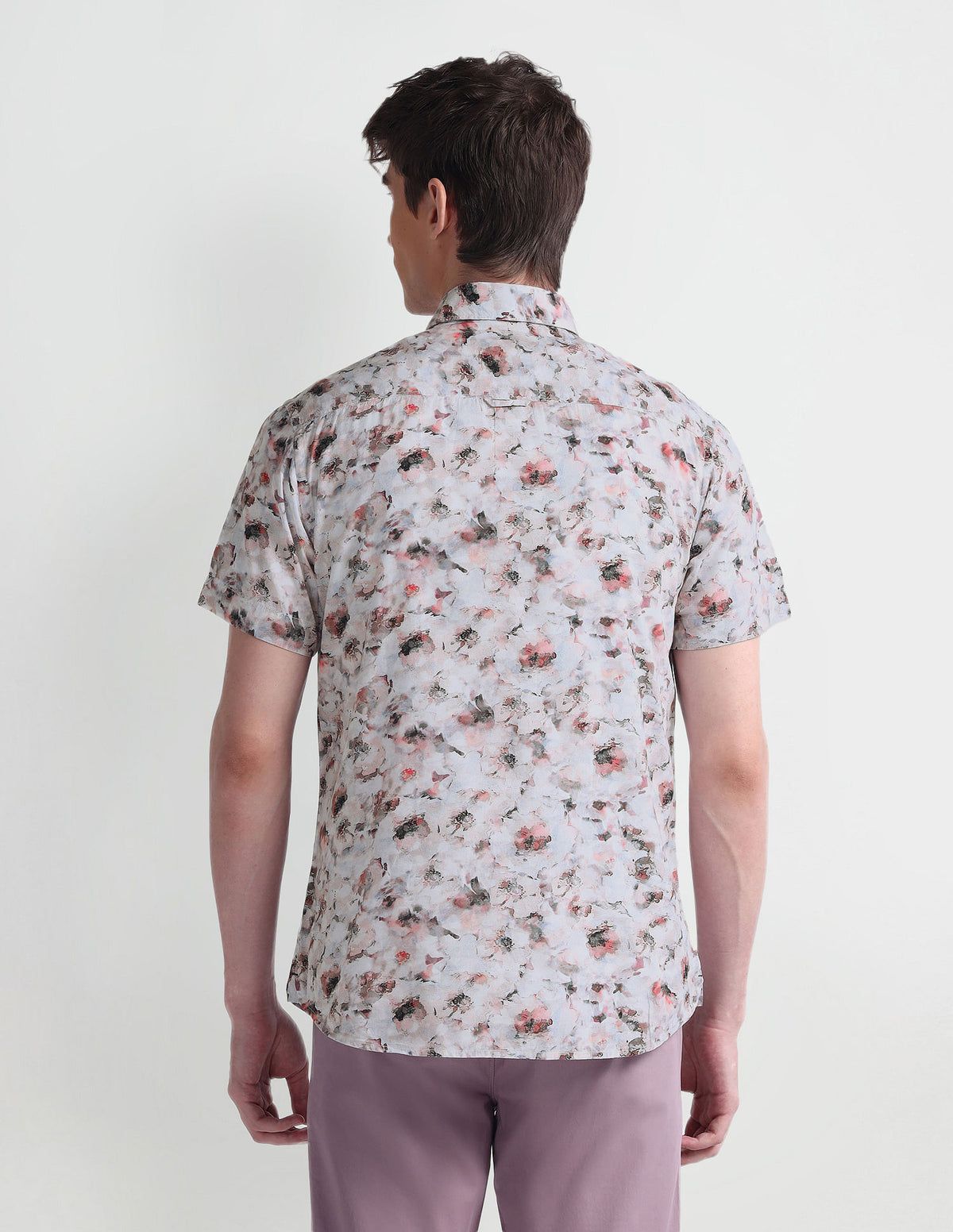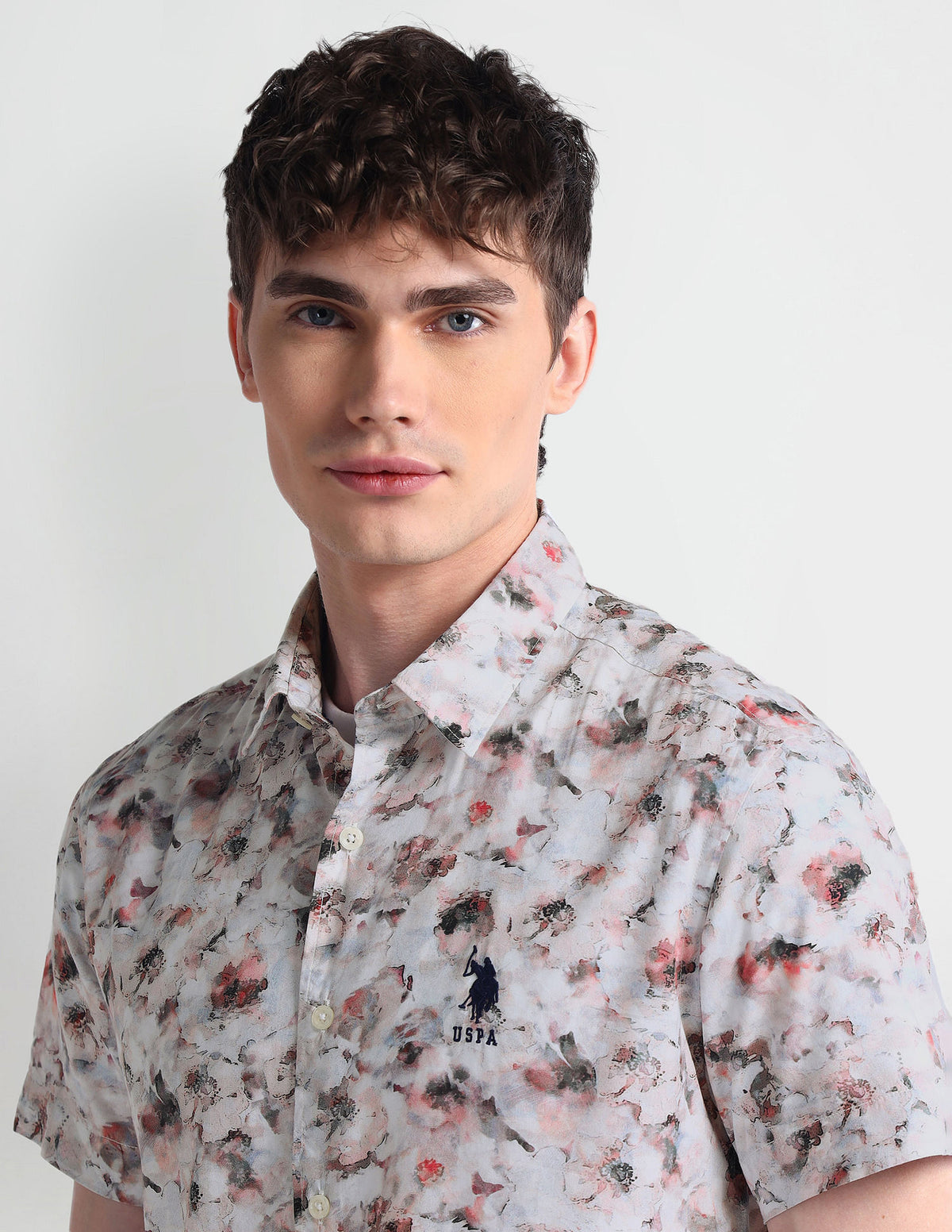 | Semi-cutaway collar | Logo at chest | Full button placket | Short sleeves | Curved hemline | Floral printed pattern | Regular weave | Slim fit