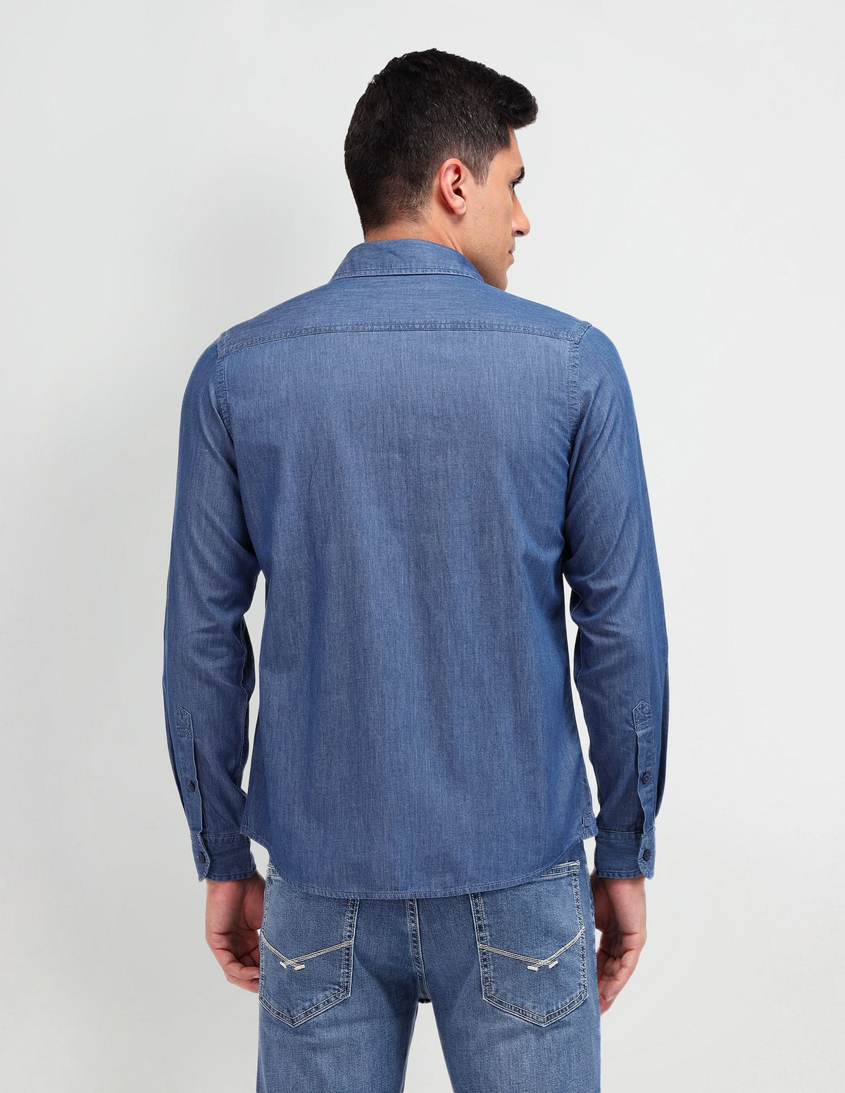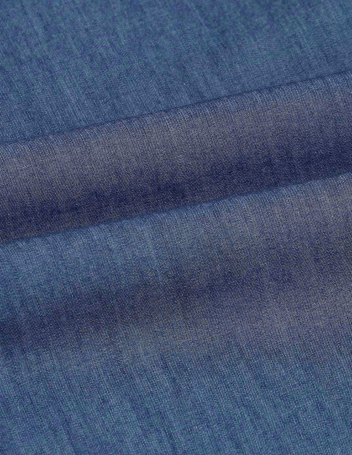 | Spread collar | Embroidered logo at chest | Full button placket | Long sleeves with rounded cuffs | Curved hemline | Heathered pattern | Chambray weave | Slim fit |