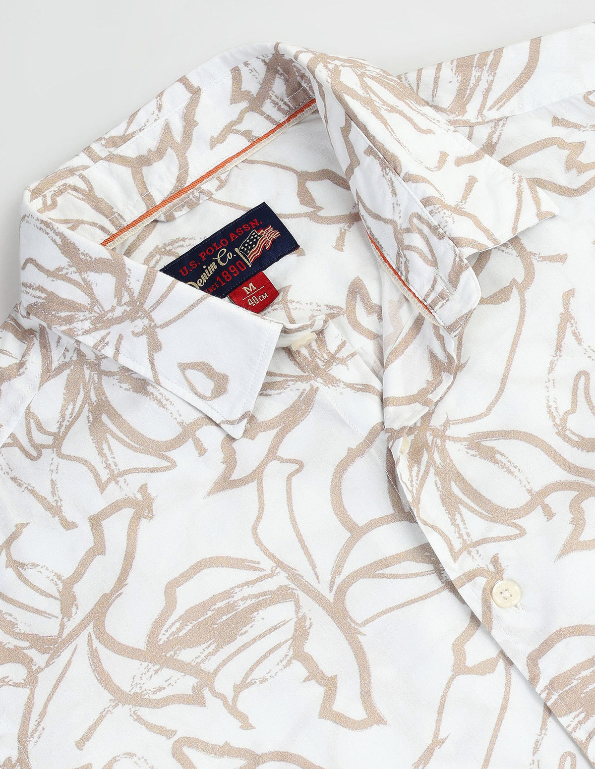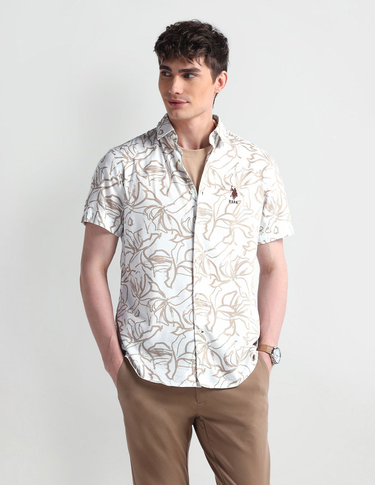 | Semi-cutaway collar | Logo at chest | Full button placket | Short sleeves | Curved hemline | Floral printed pattern | Regular weave | Slim fit