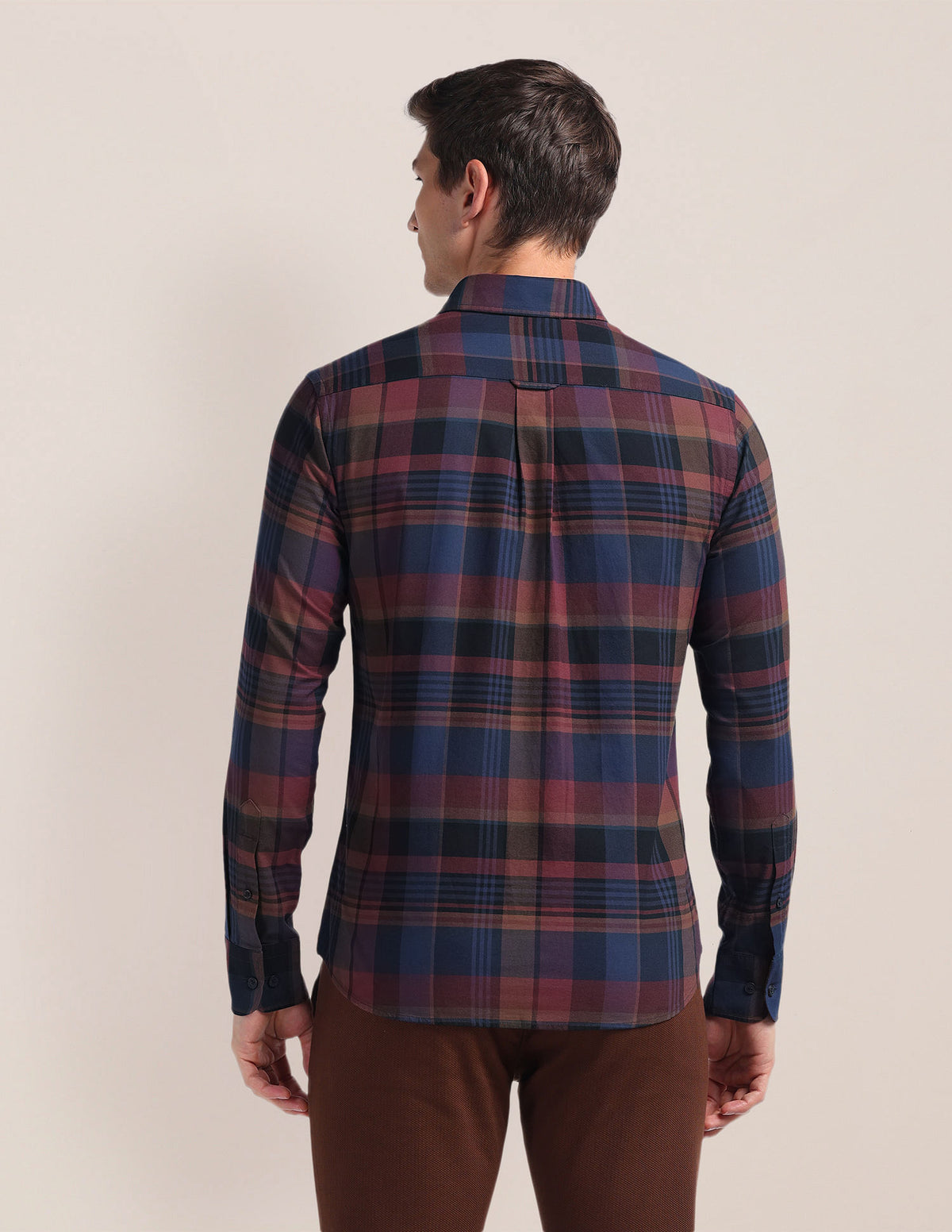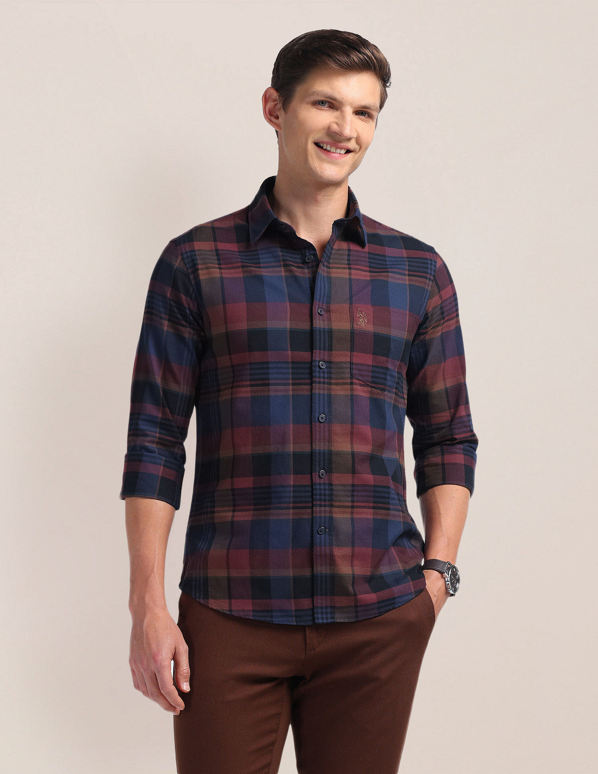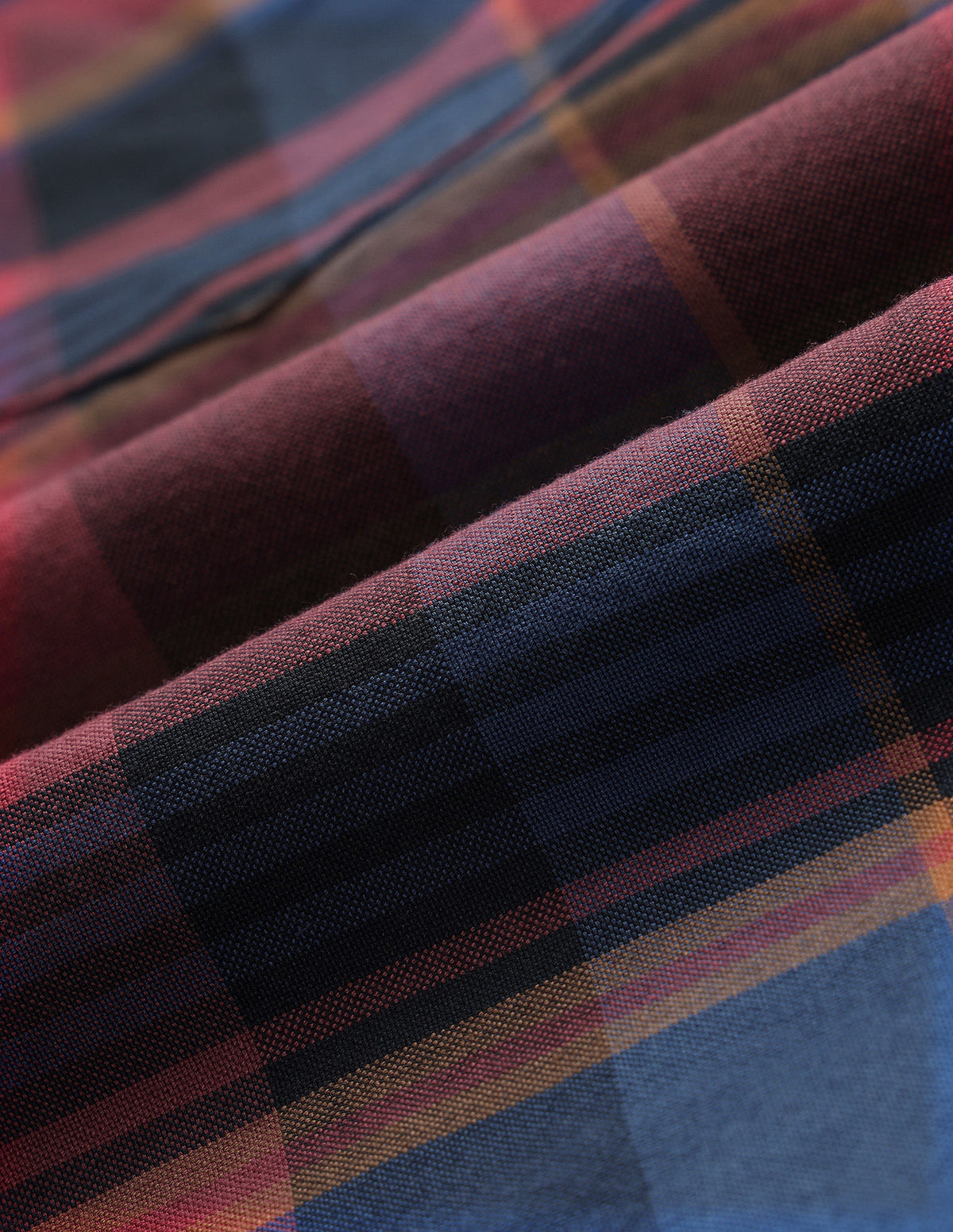 | Semi-cutaway collar | One chest patch pocket with logo | Full button placket | Long sleeves with rounded cuffs | Curved hemline | Plaid checked pattern | Regular weave | Brand fit: Tailored fit | Fit mapping: Regular fit