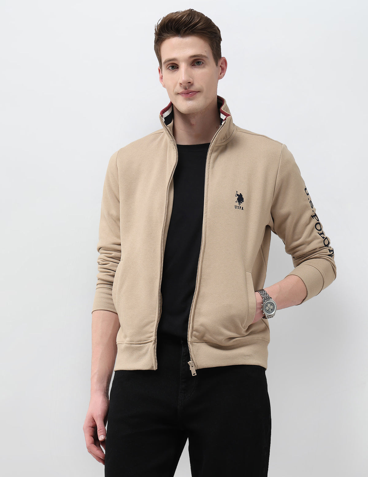 - Solid pattern with embroidered brand detail at sleeve