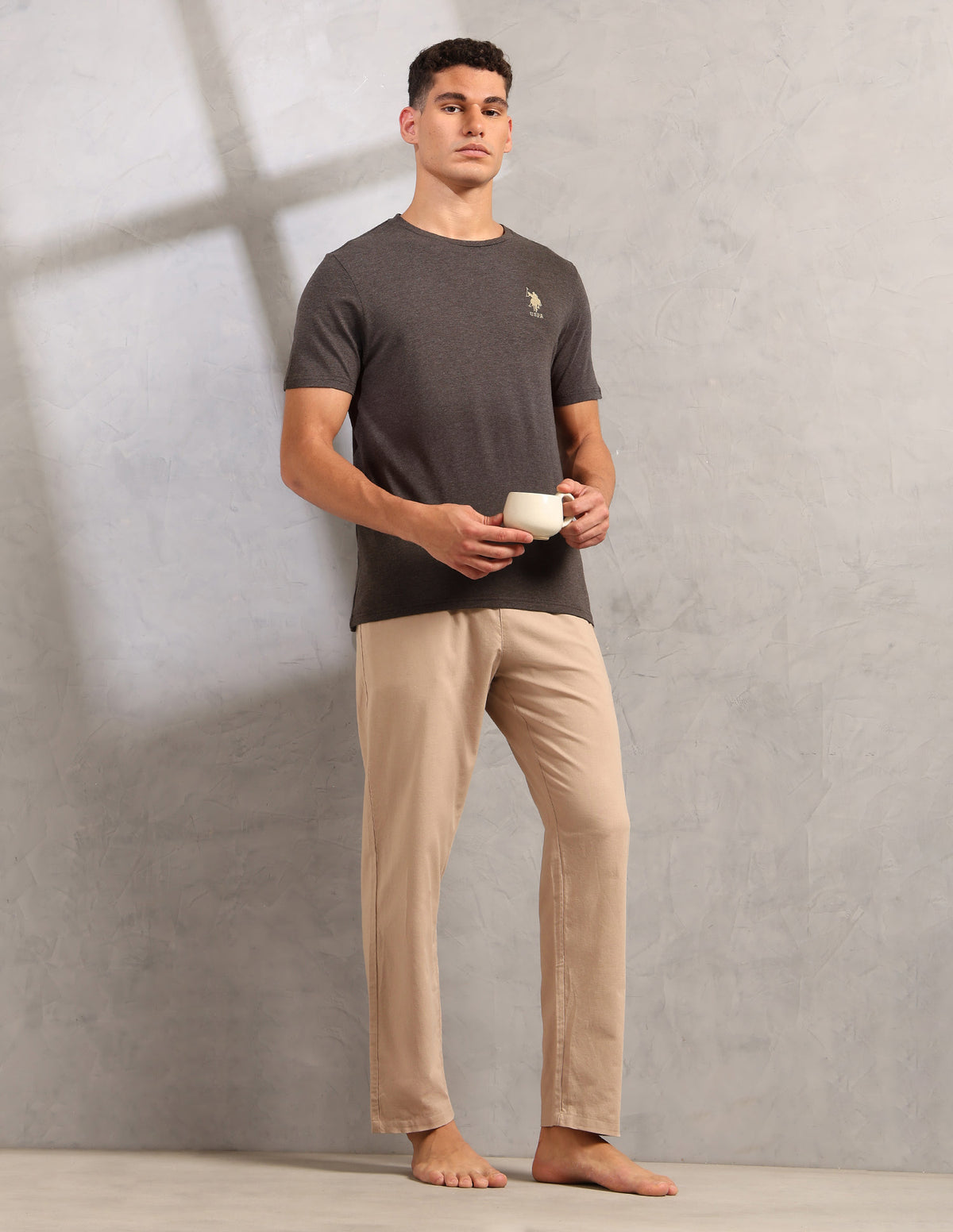 Story: Melange lounge t-shirt for men's sleep and loungewear. Enjoy a blend of style and comfort in your casual, at-home moments.