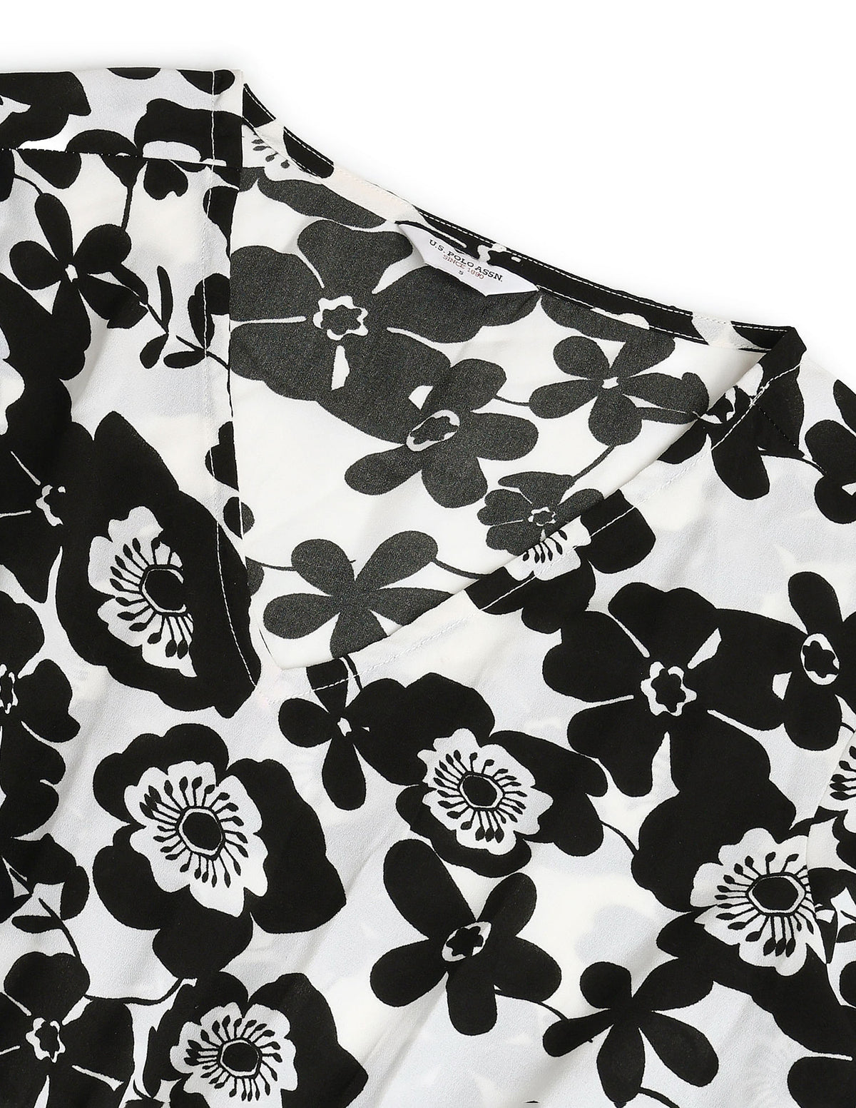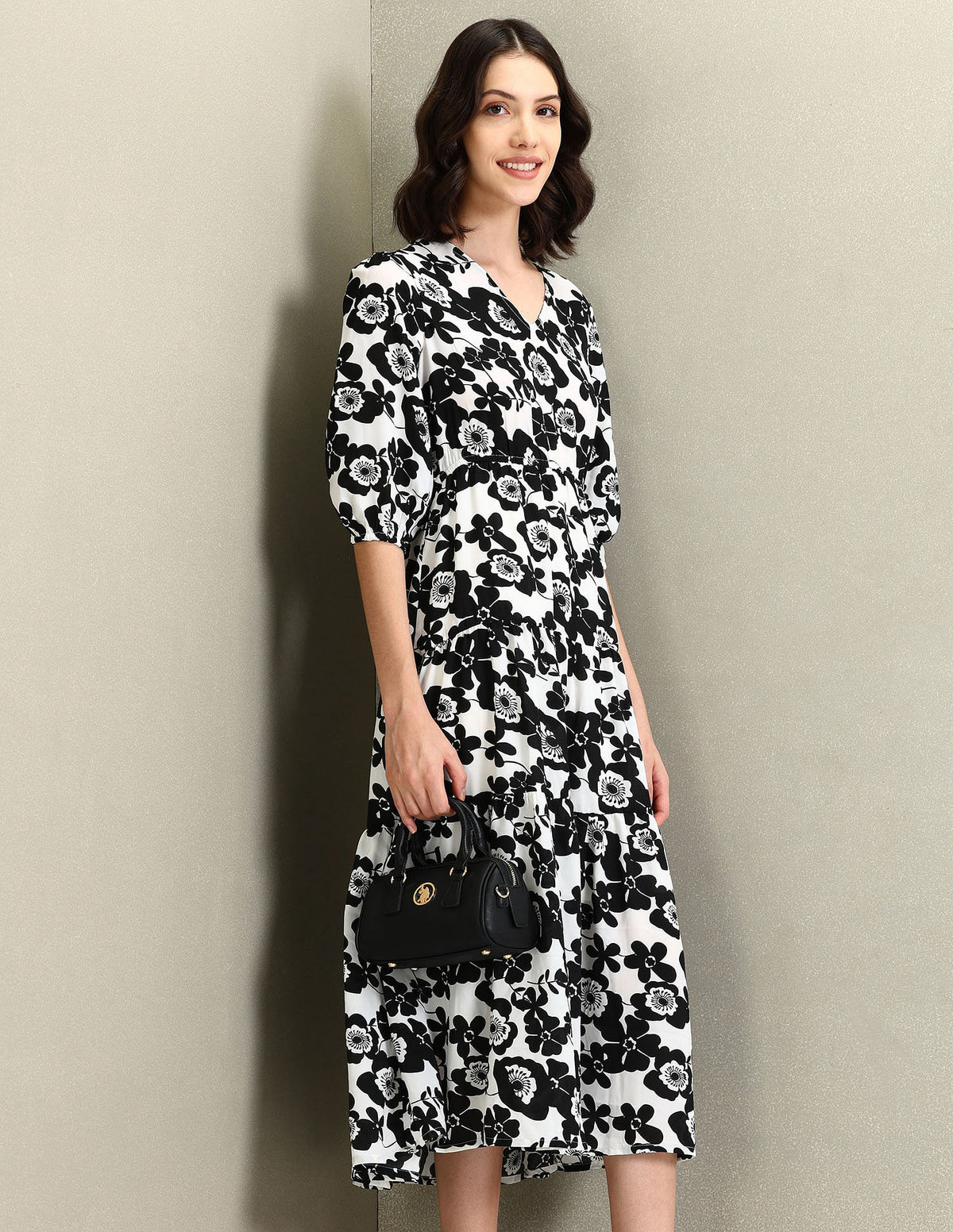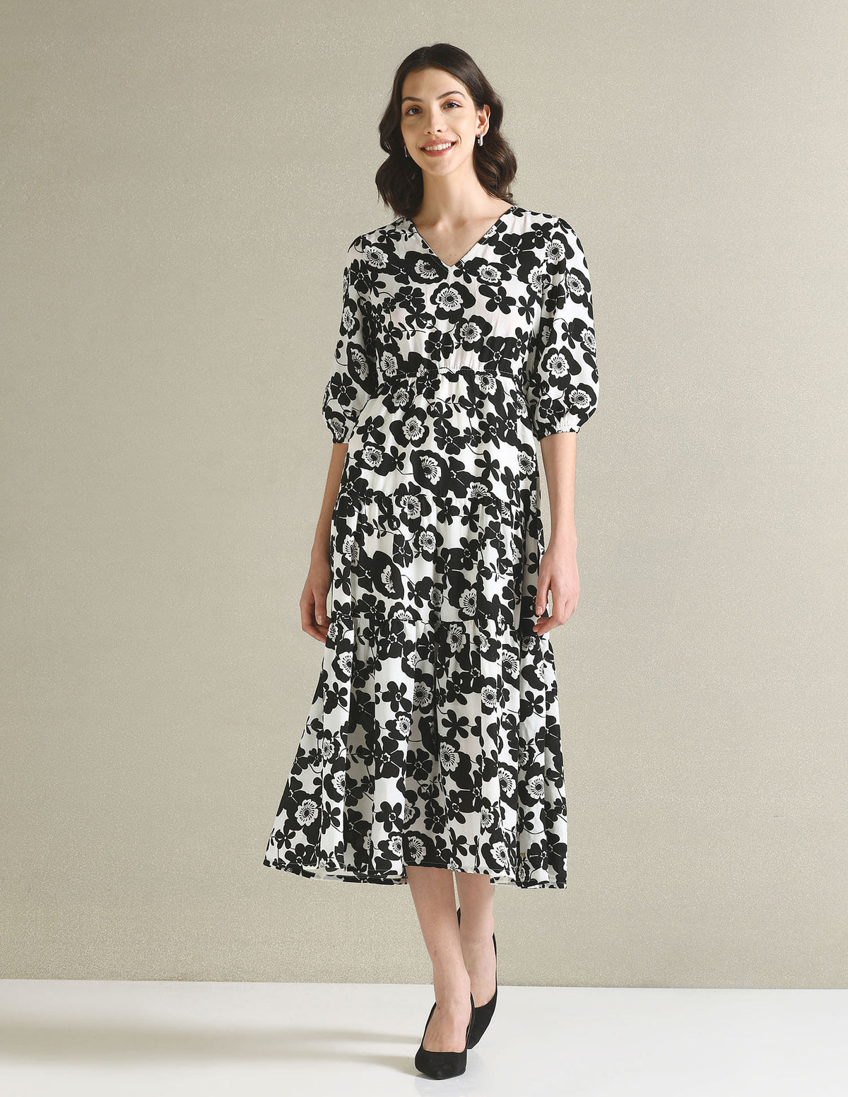 | V-neck | Three-quarter sleeves | Tie-up at waist | Flared hemline | Floral printed pattern | Regular weave | Country Of Origin - India