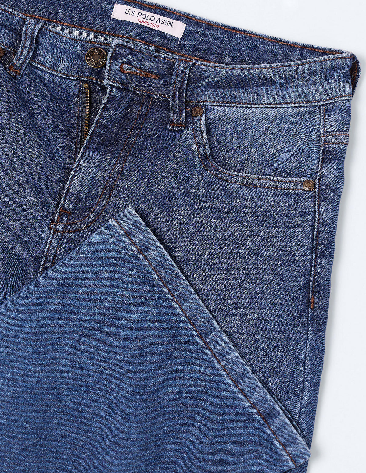 | Mid-rise waist | Button and zip fly closure | Five pockets | Stonewashed and whiskered | Denim weave | Bootcut