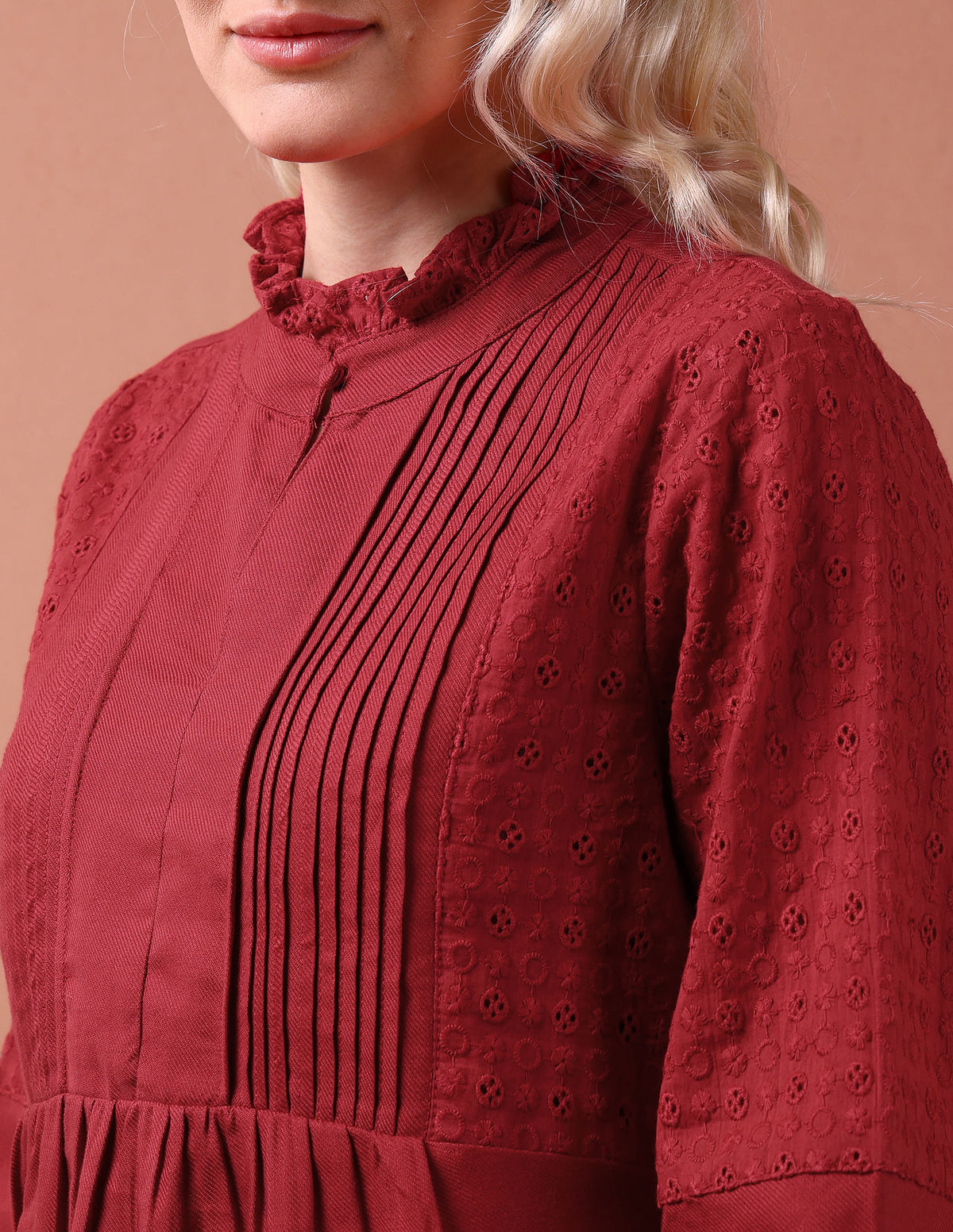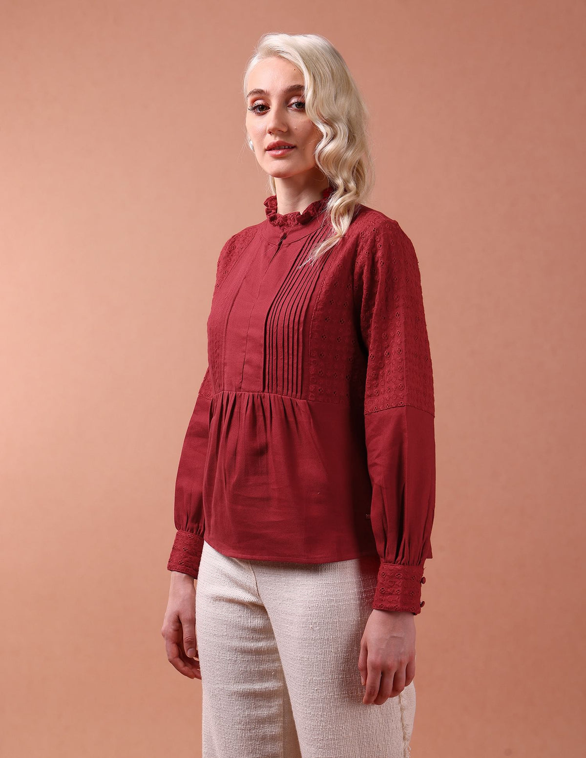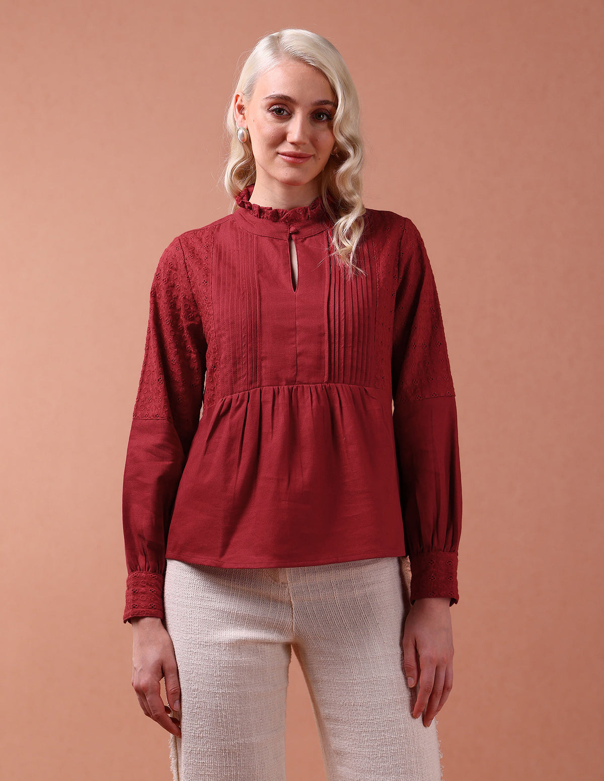 Front Pleat Ruffle Neck Top