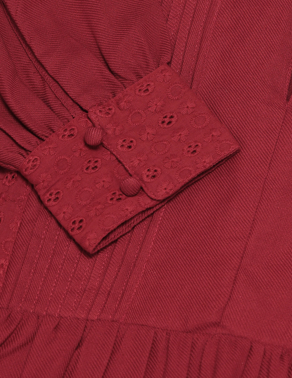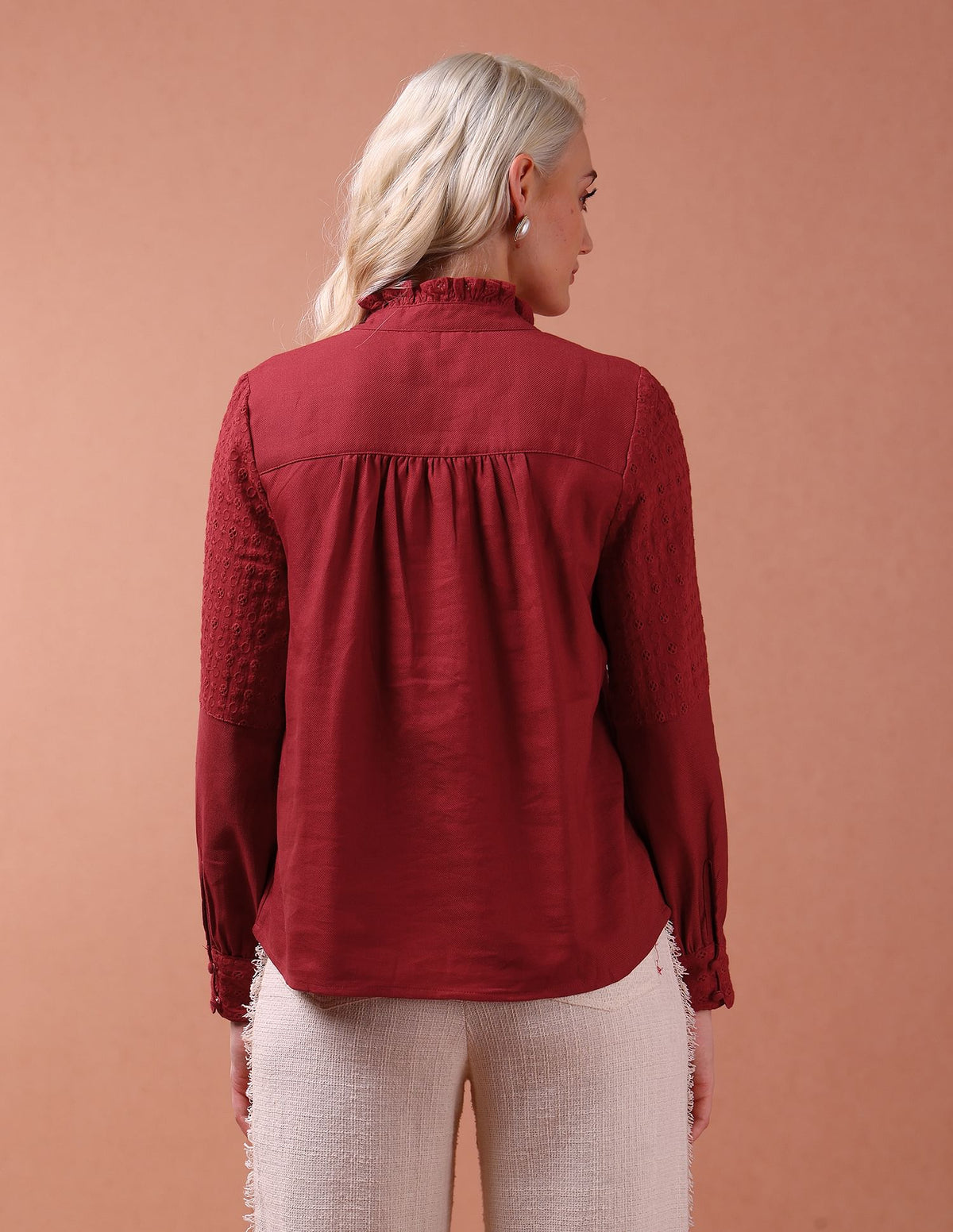 | Ruffle neck | Button and loop closure at front | Pleated detail at front | Long sleeves with buttoned cuffs | Straight hemline | Solid pattern | Woven | Regular fit |