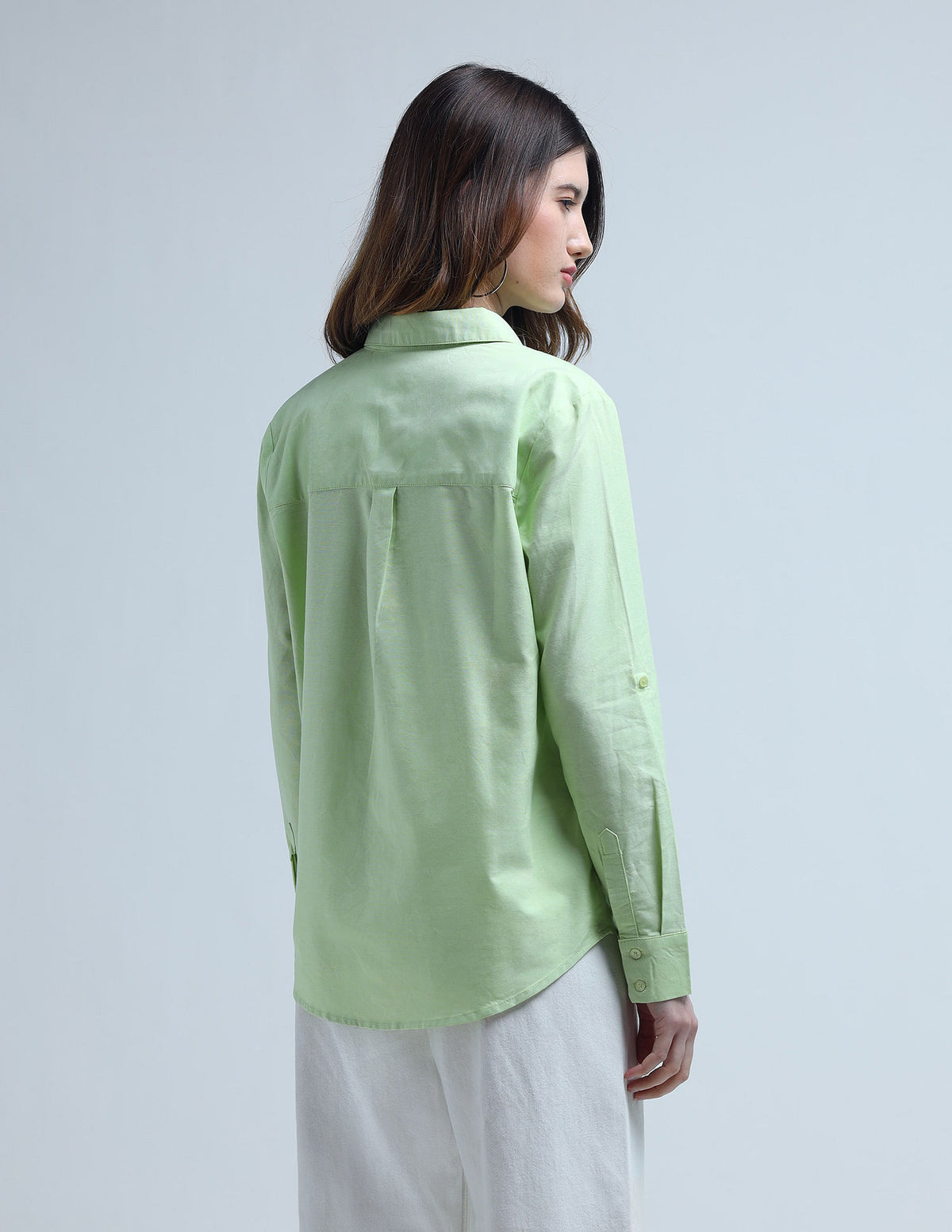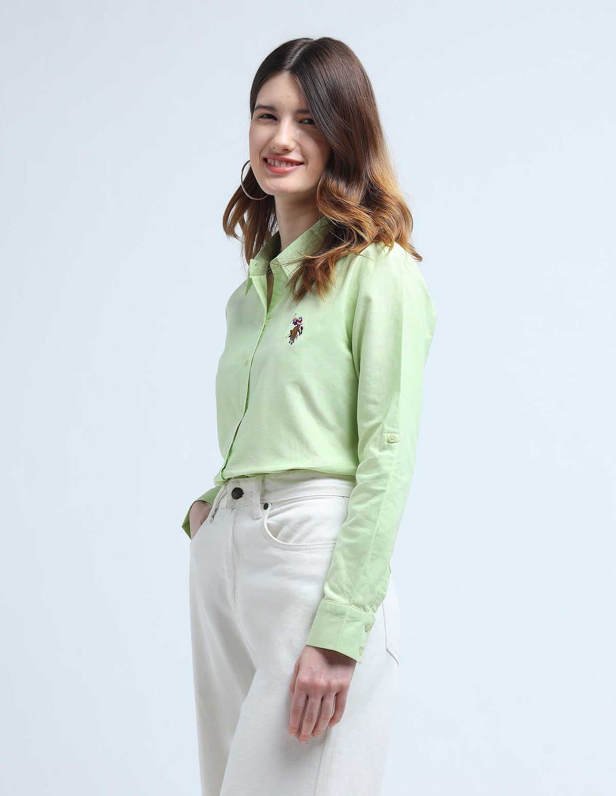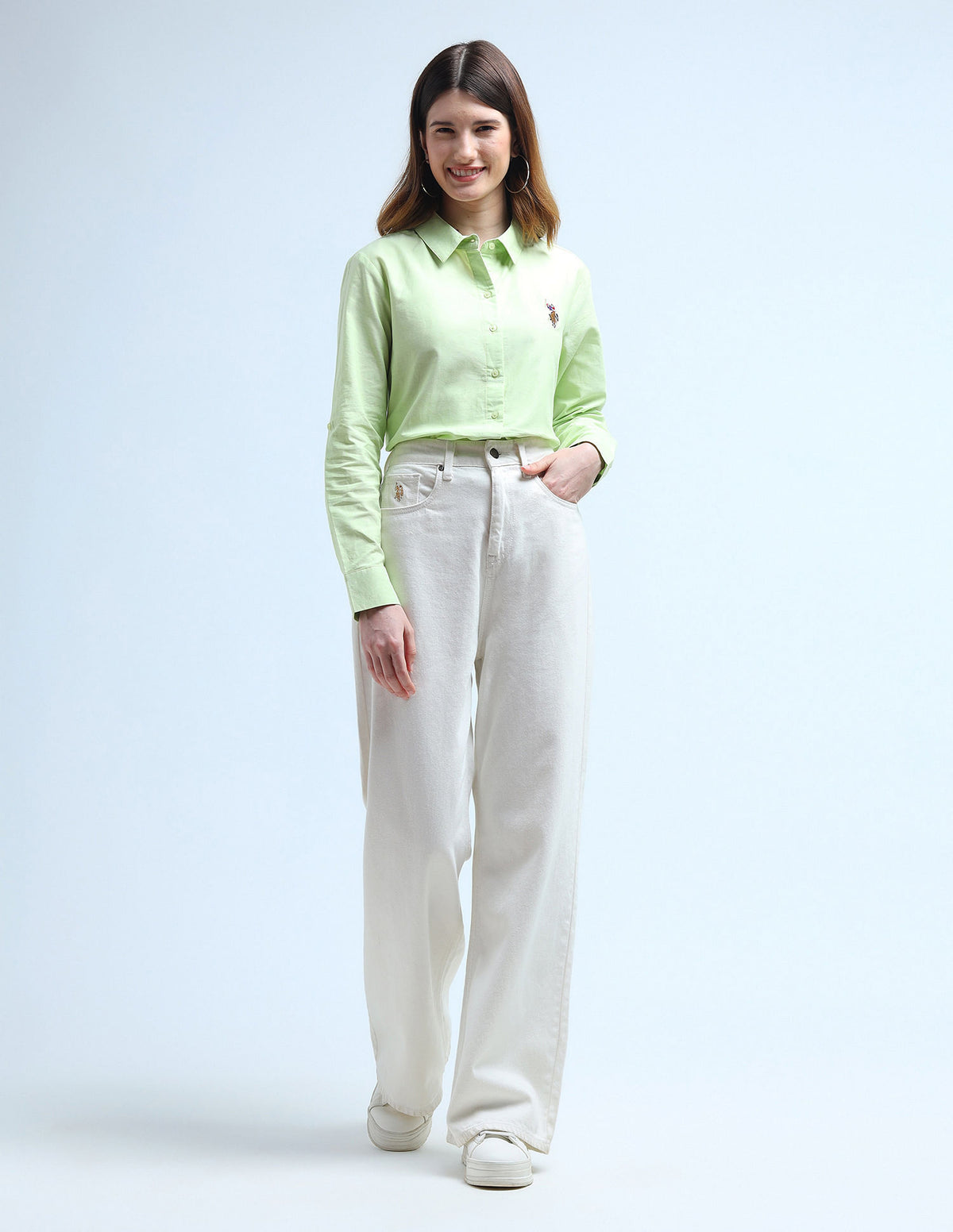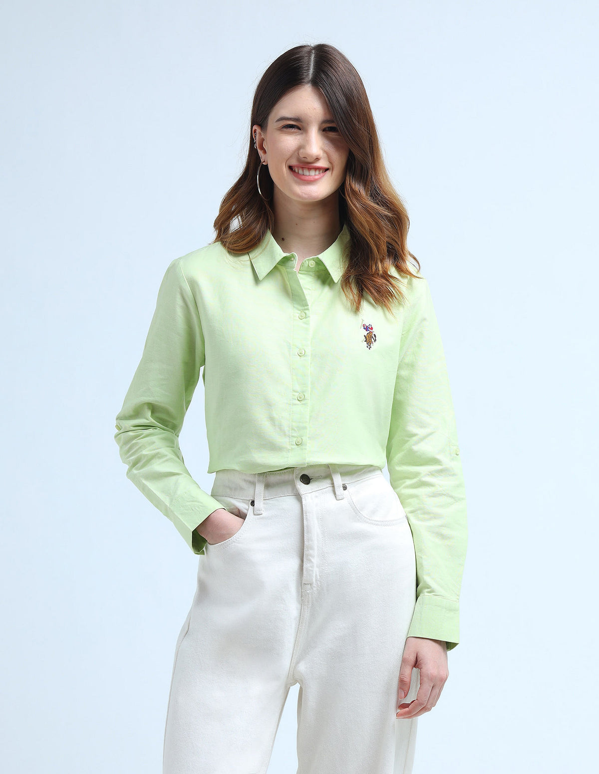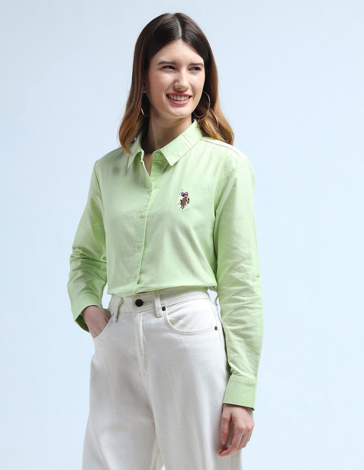 | Spread collar | Embroidered logo at chest | Full button placket | Long sleeves with barrel cuffs | Curved hemline | Solid pattern | Oxford weave | Relaxed fit