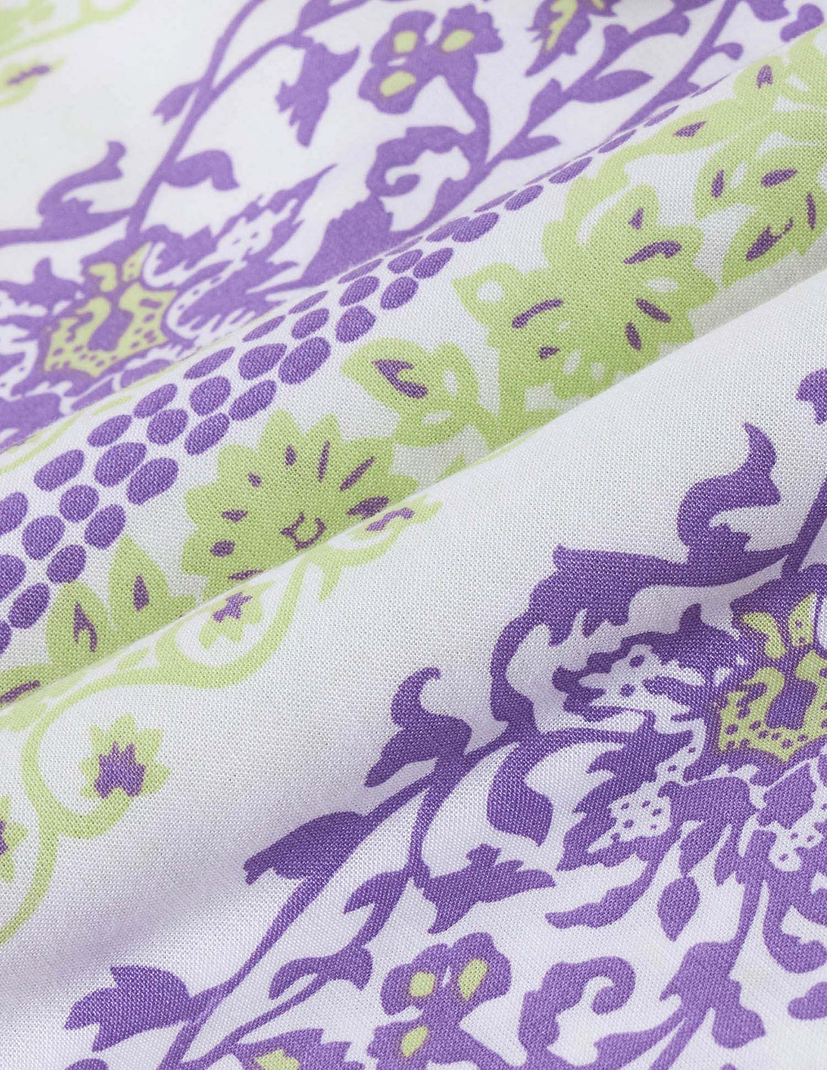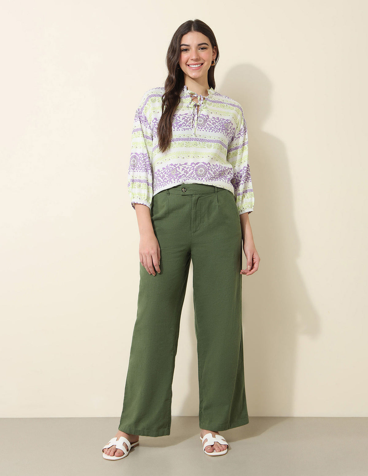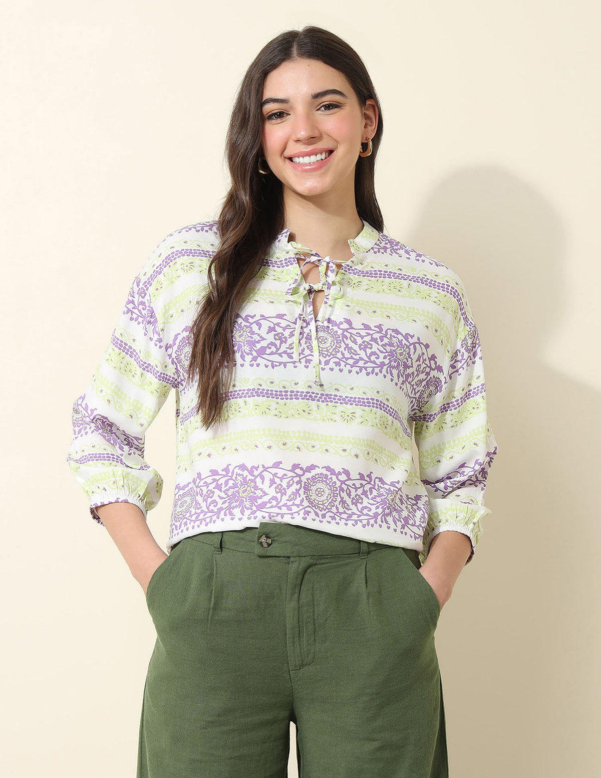 | Mandarin collar | Tie-up at front | Three-quarter sleeves with elasticized hems | Straight hemline | All-over printed pattern | Regular fit |