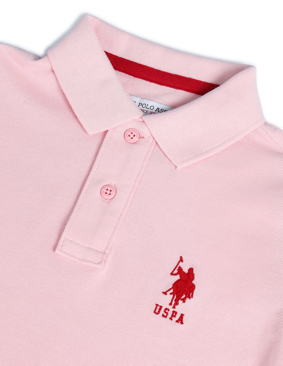 | Polo collar | Short button placket | Short sleeves | Ribbed collar and sleeve hems | Uneven vented hem | Solid pattern | Regular fit |