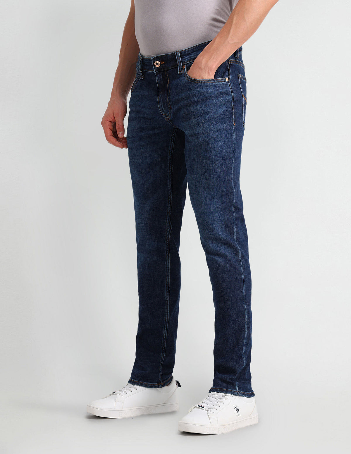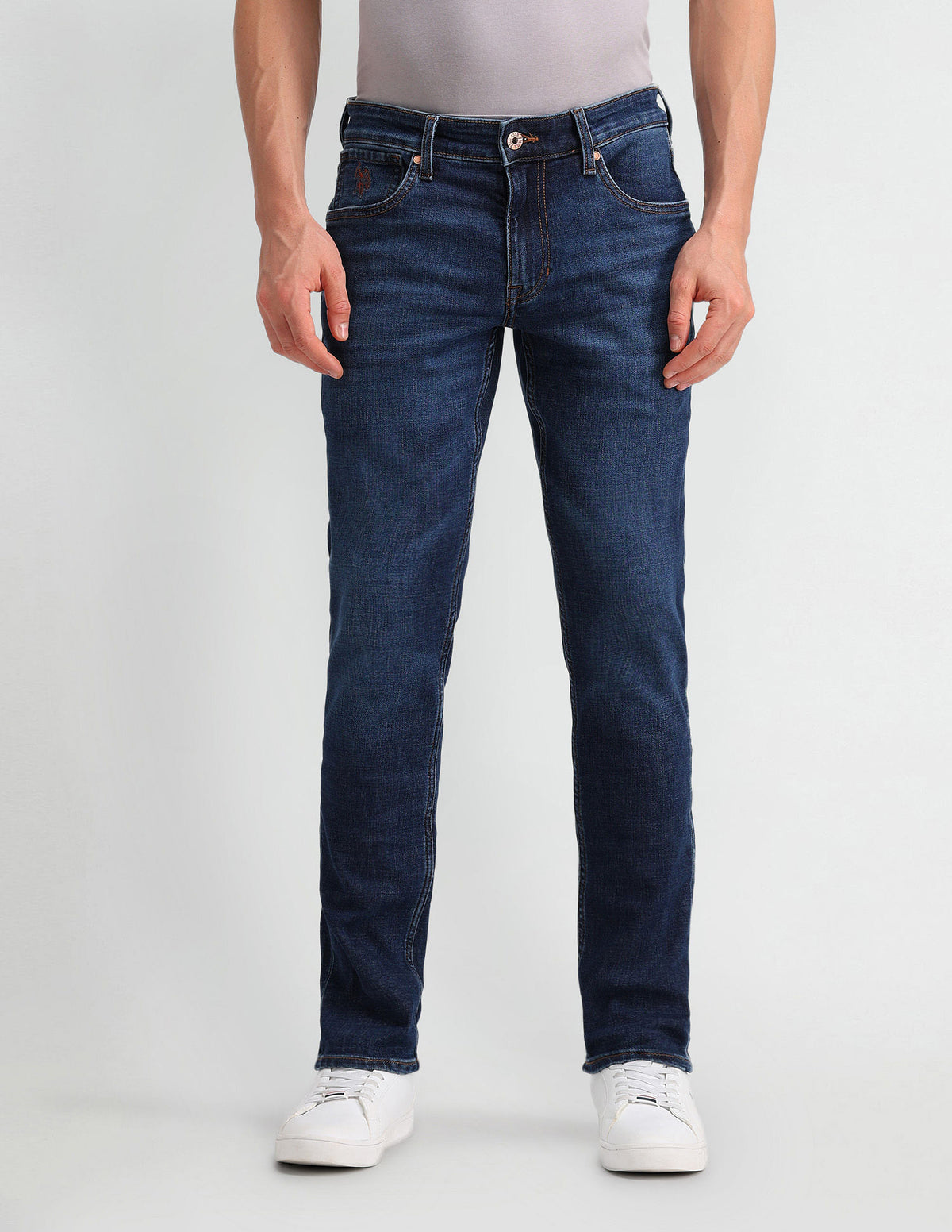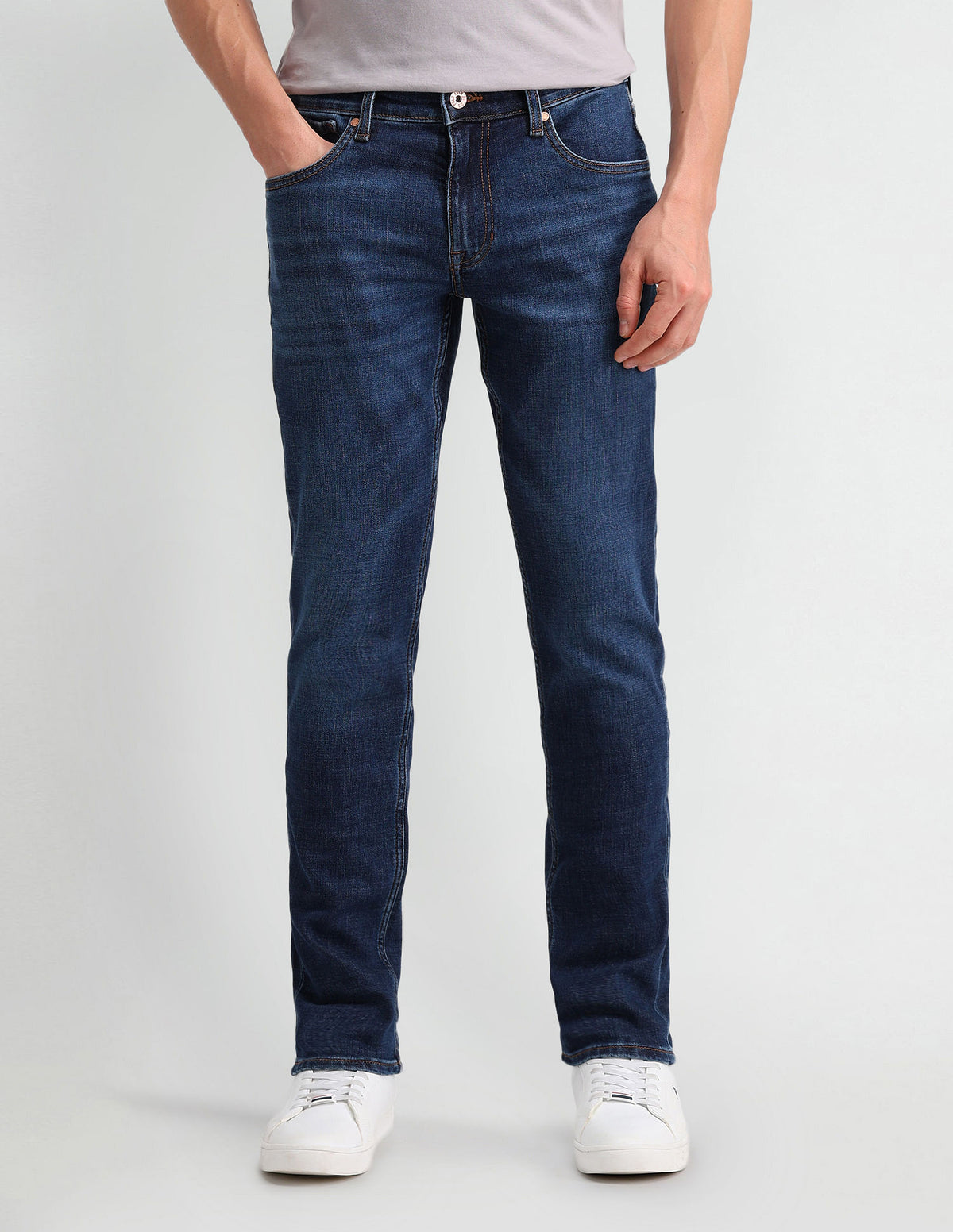 | Mid-rise waist | Button and zip fly closure | Five pockets | Stonewashed and whiskered | Denim weave | Brand fit: Brandon fit | Fit mapping: Slim tapered fit |