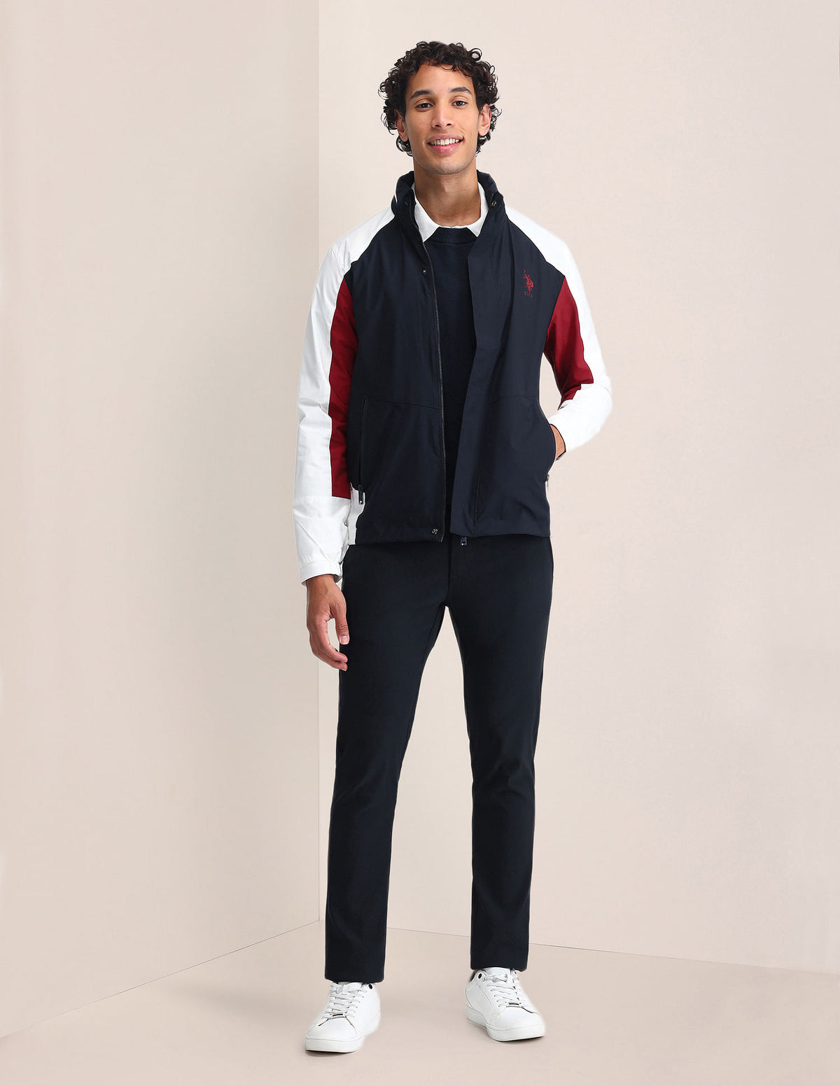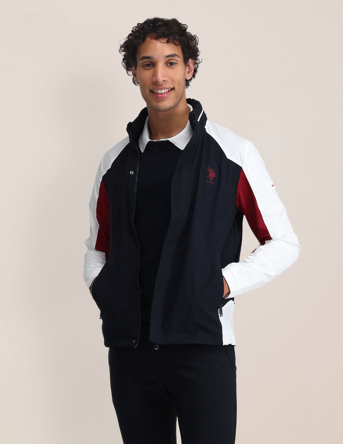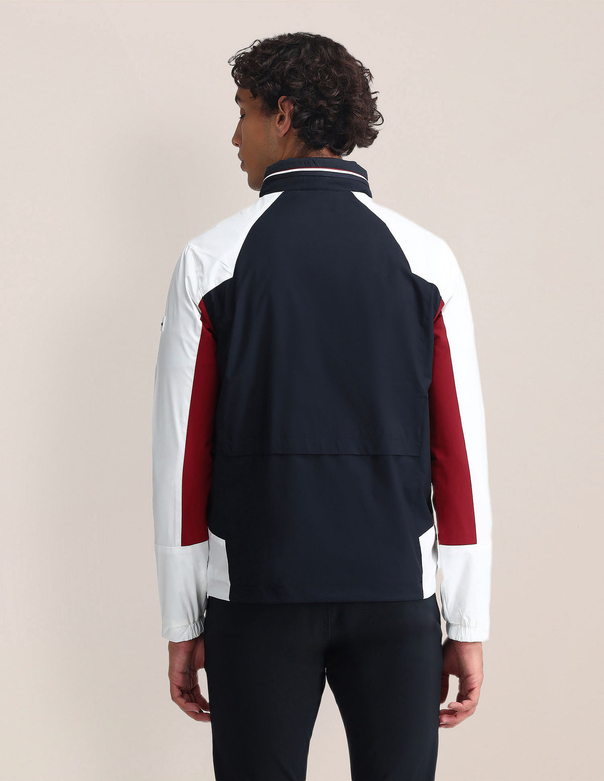 | High neck | Full zipper closure | Long sleeves | Logo at chest | Elasticized sleeve hems and hemline | Two pockets | Color blocked pattern