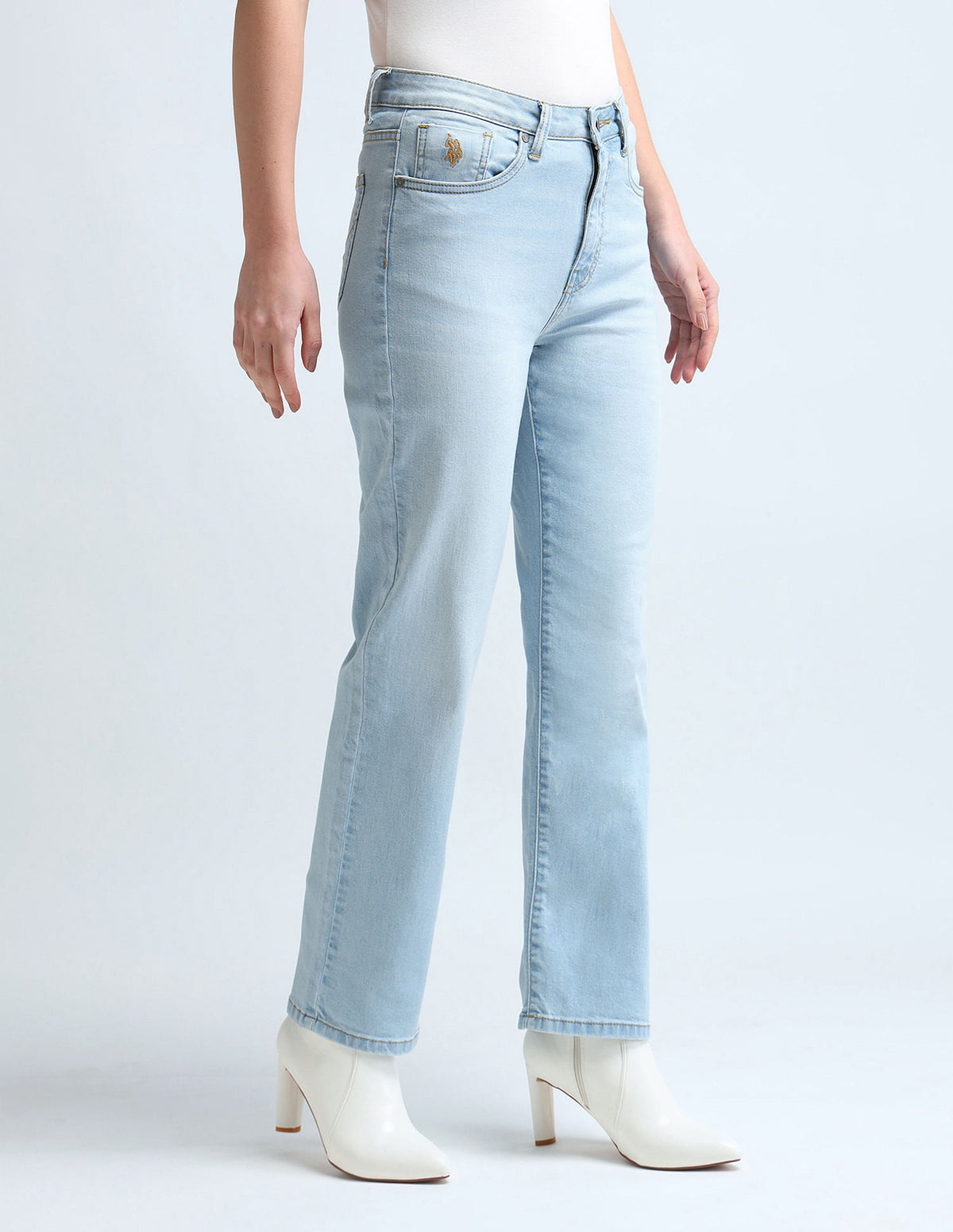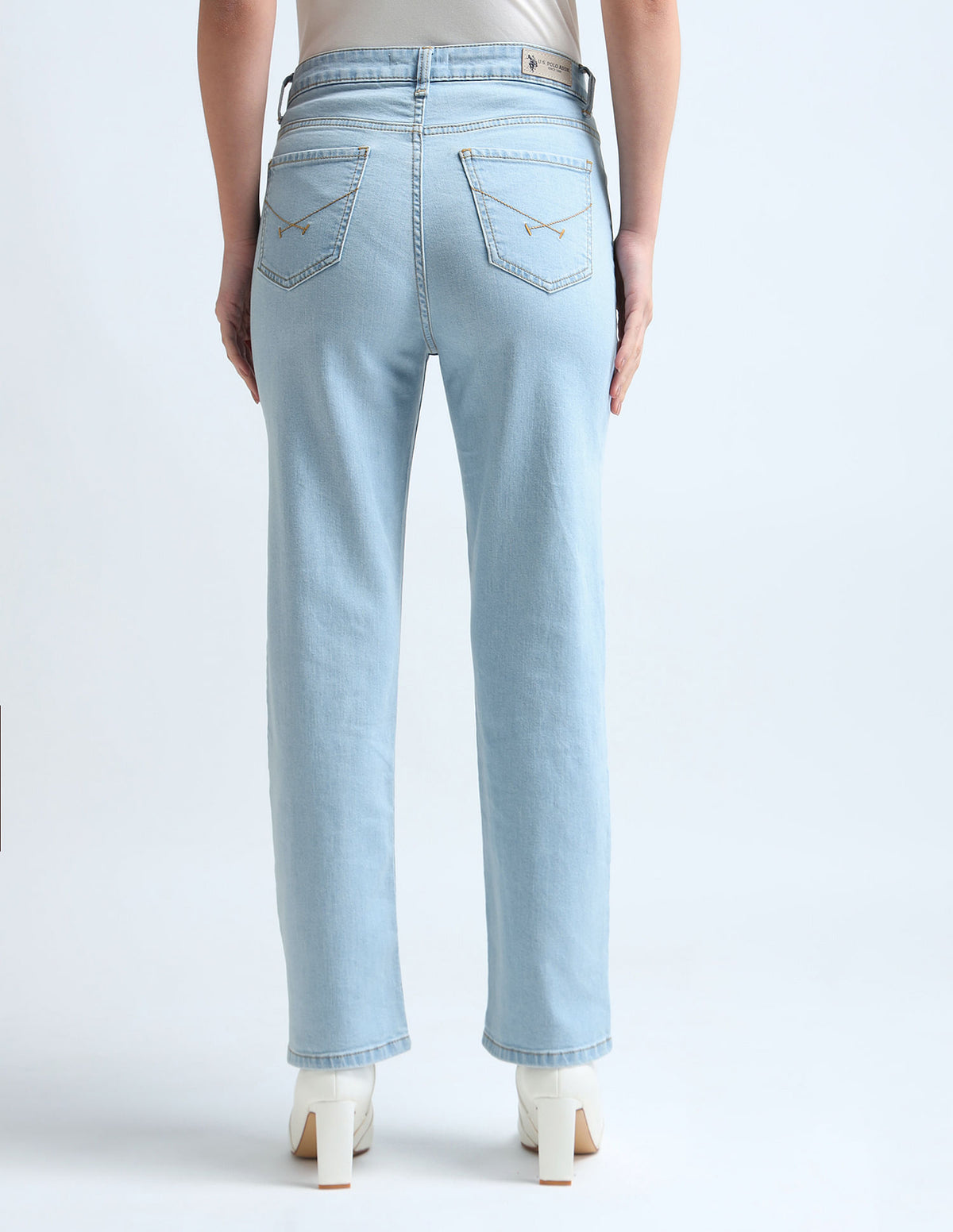 | High-rise | Button and zip fly closure | Five pockets | Stonewashed | Denim weave | Straight fit | Country Of Origin - India