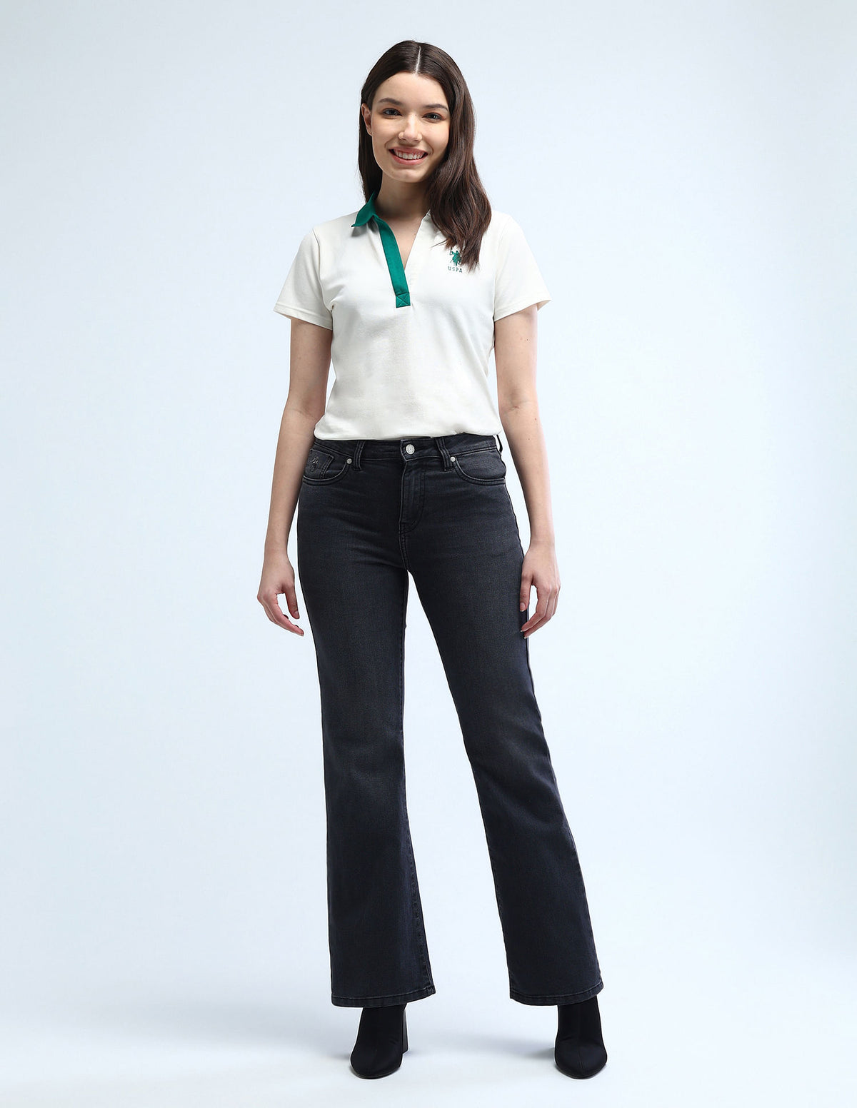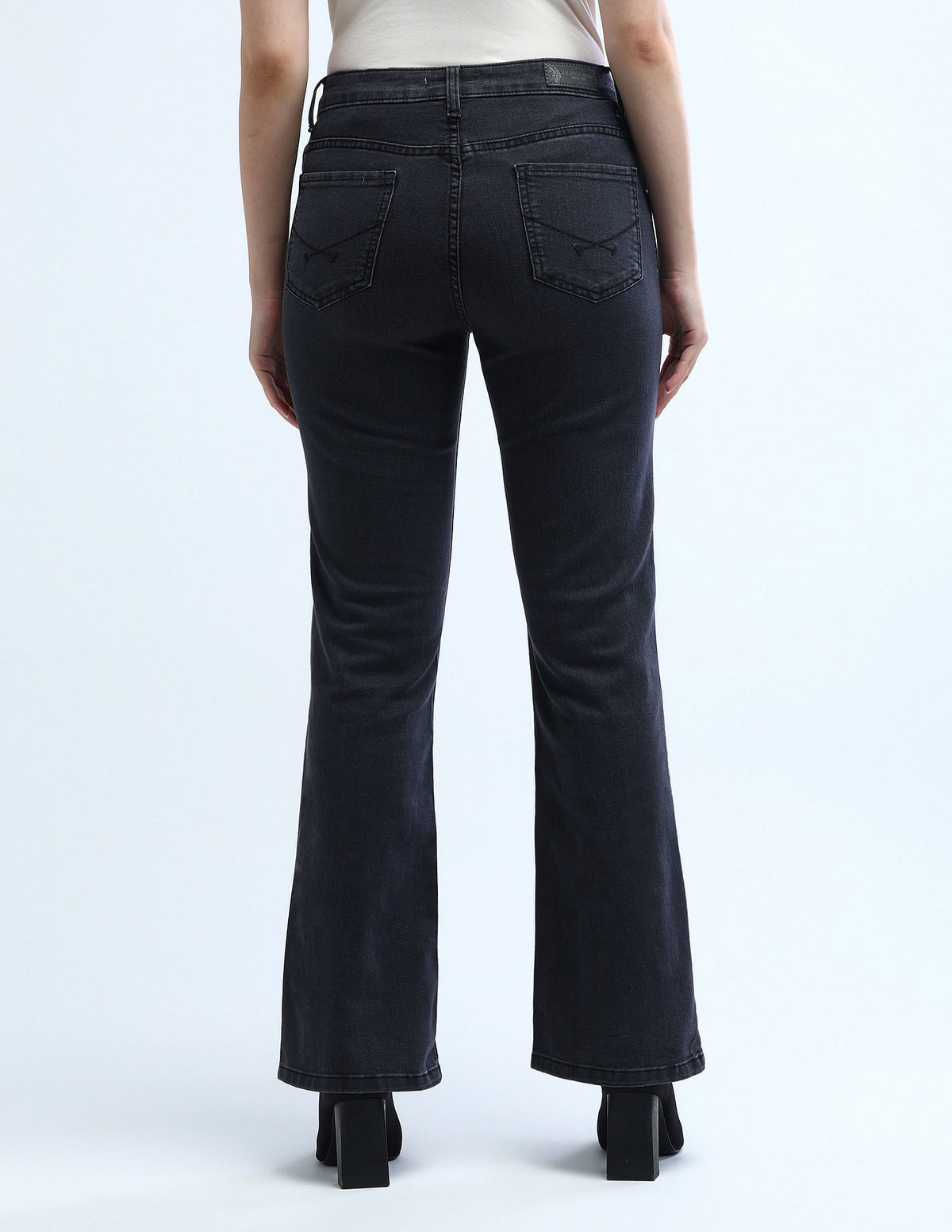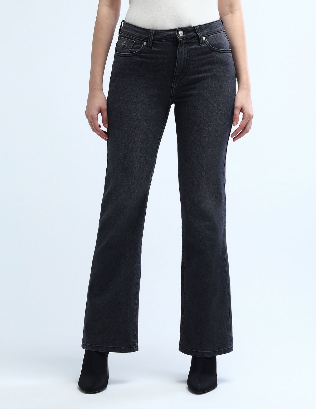 | High-rise waist | Button and zip fly closure | Five pockets | Stonewashed and whiskered | Twill weave | Bootcut