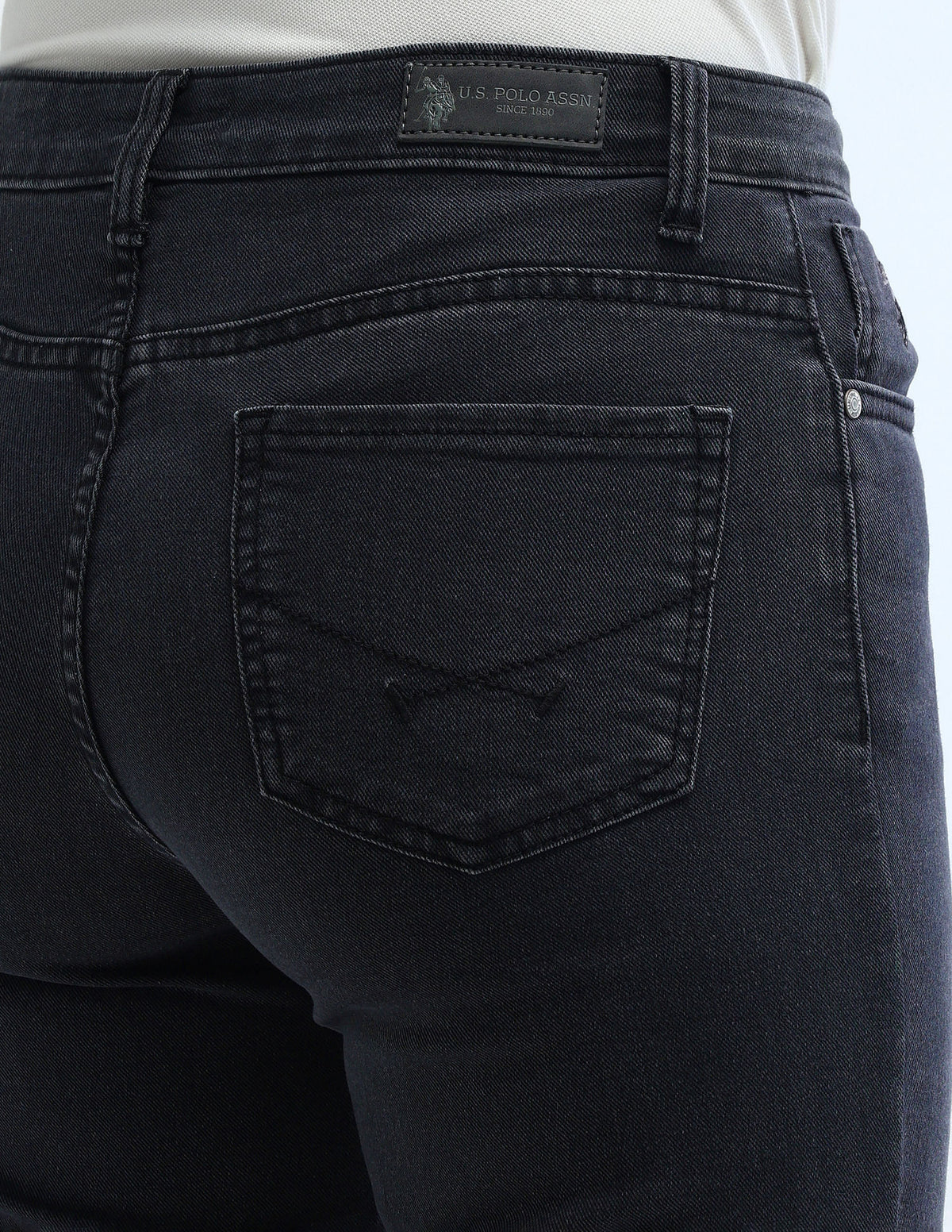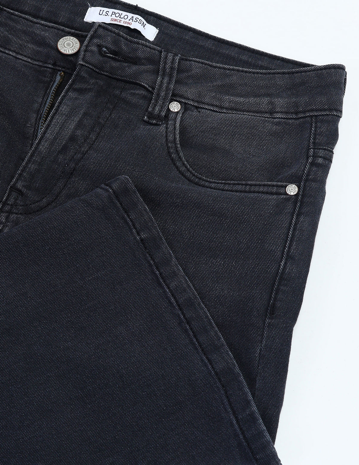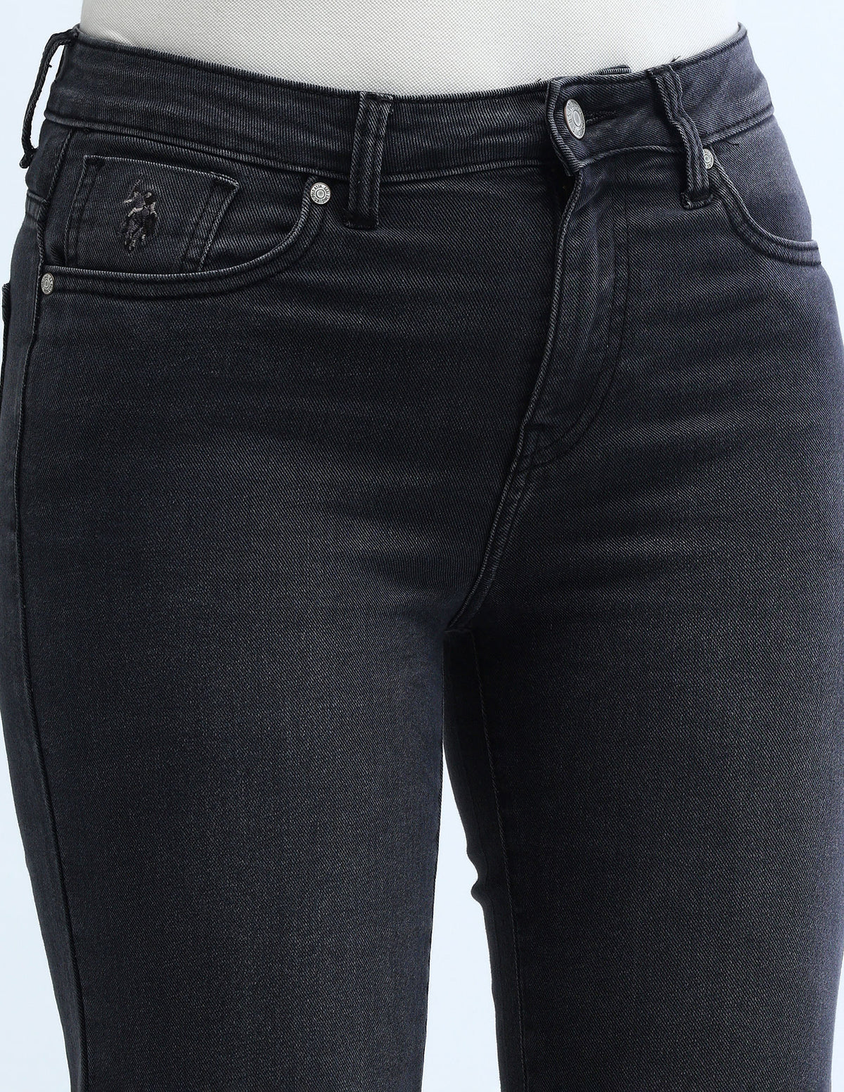 | High-rise waist | Button and zip fly closure | Five pockets | Stonewashed and whiskered | Twill weave | Bootcut