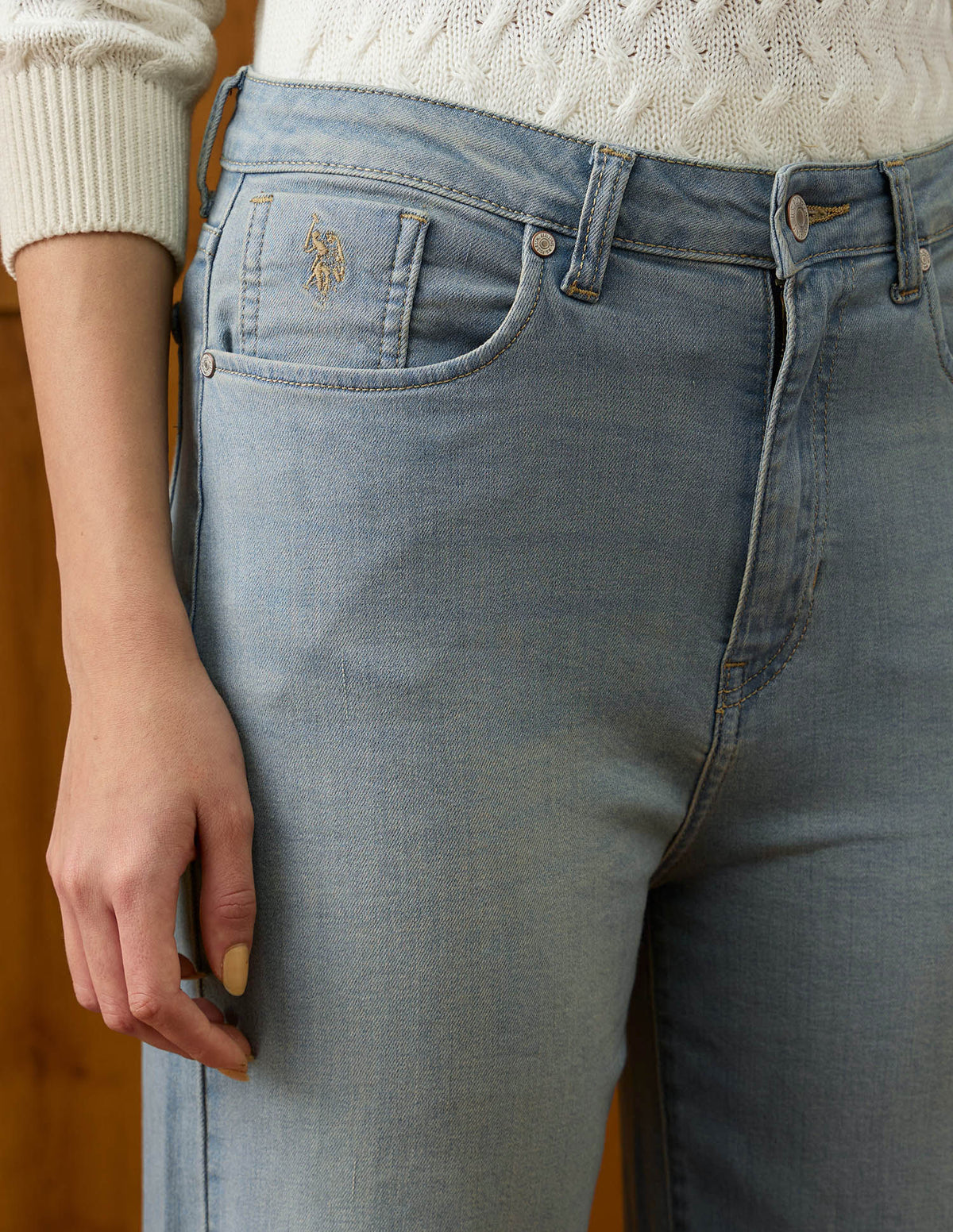 | High-rise waist | Button and zip fly closure | Five pockets | Denim weave | Wide leg fit |