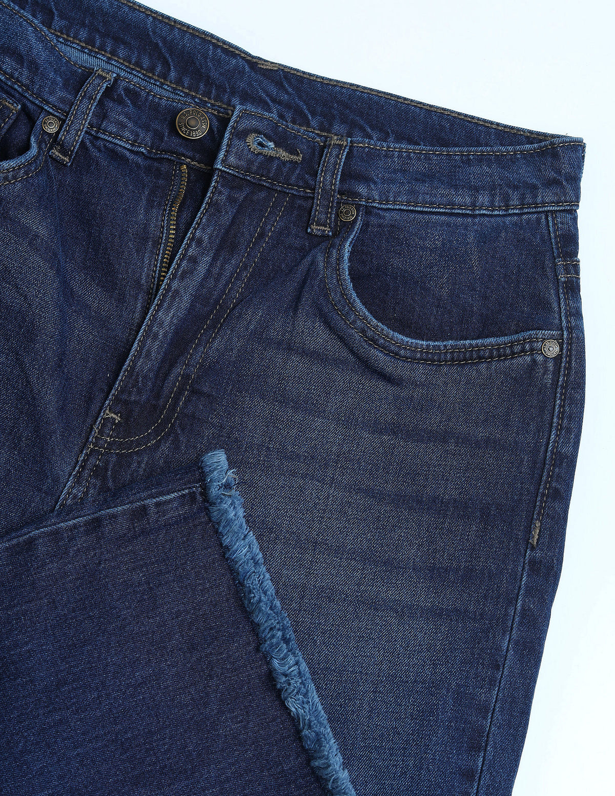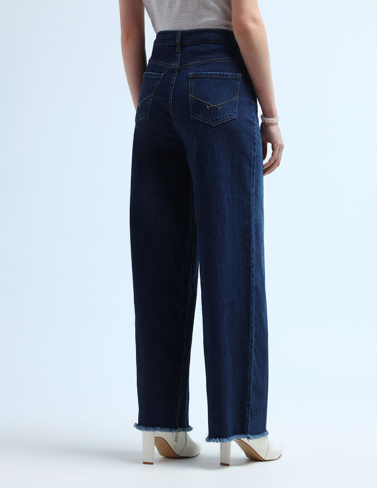 | High-rise waist | Button and zip fly closure | Five pockets | Fringed hems | Stonewashed and whiskered | Denim weave | Wide leg fit