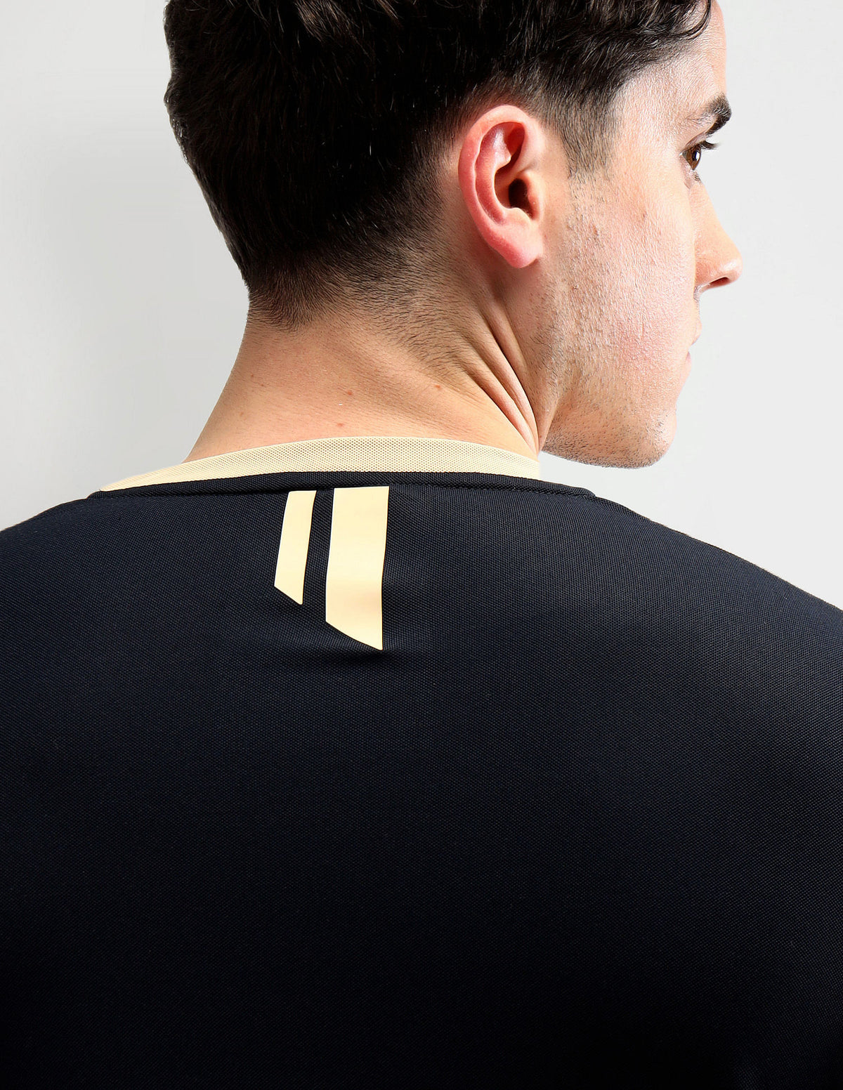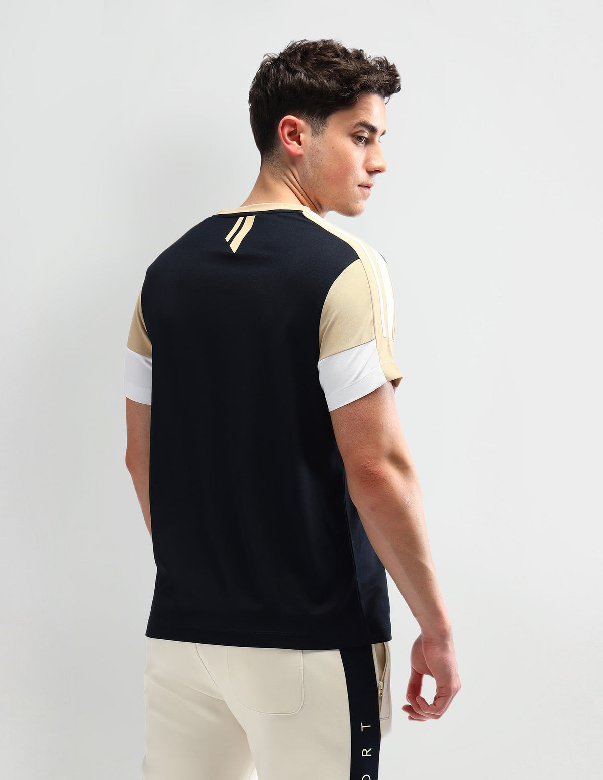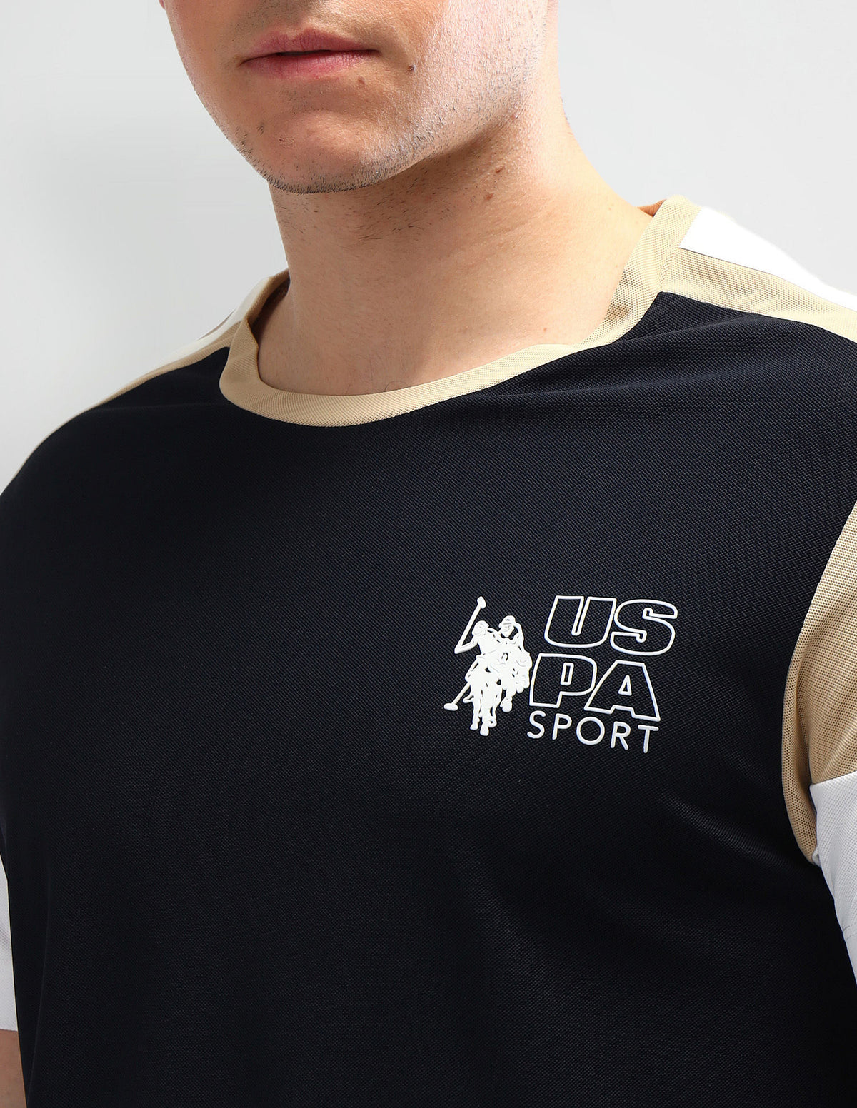 | Ribbed crew neck | Embroidered logo at chest | Short sleeves | Straight hemline | Brand printed pattern | Knitted | Slim fit |
