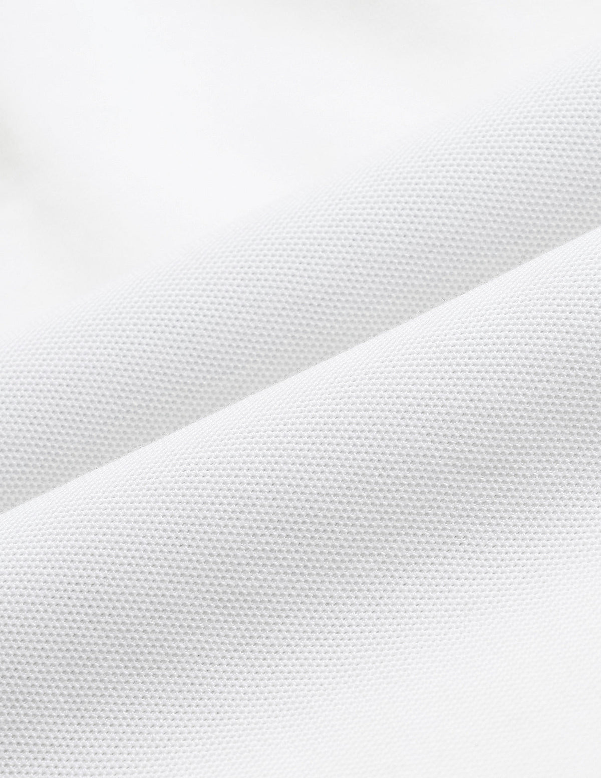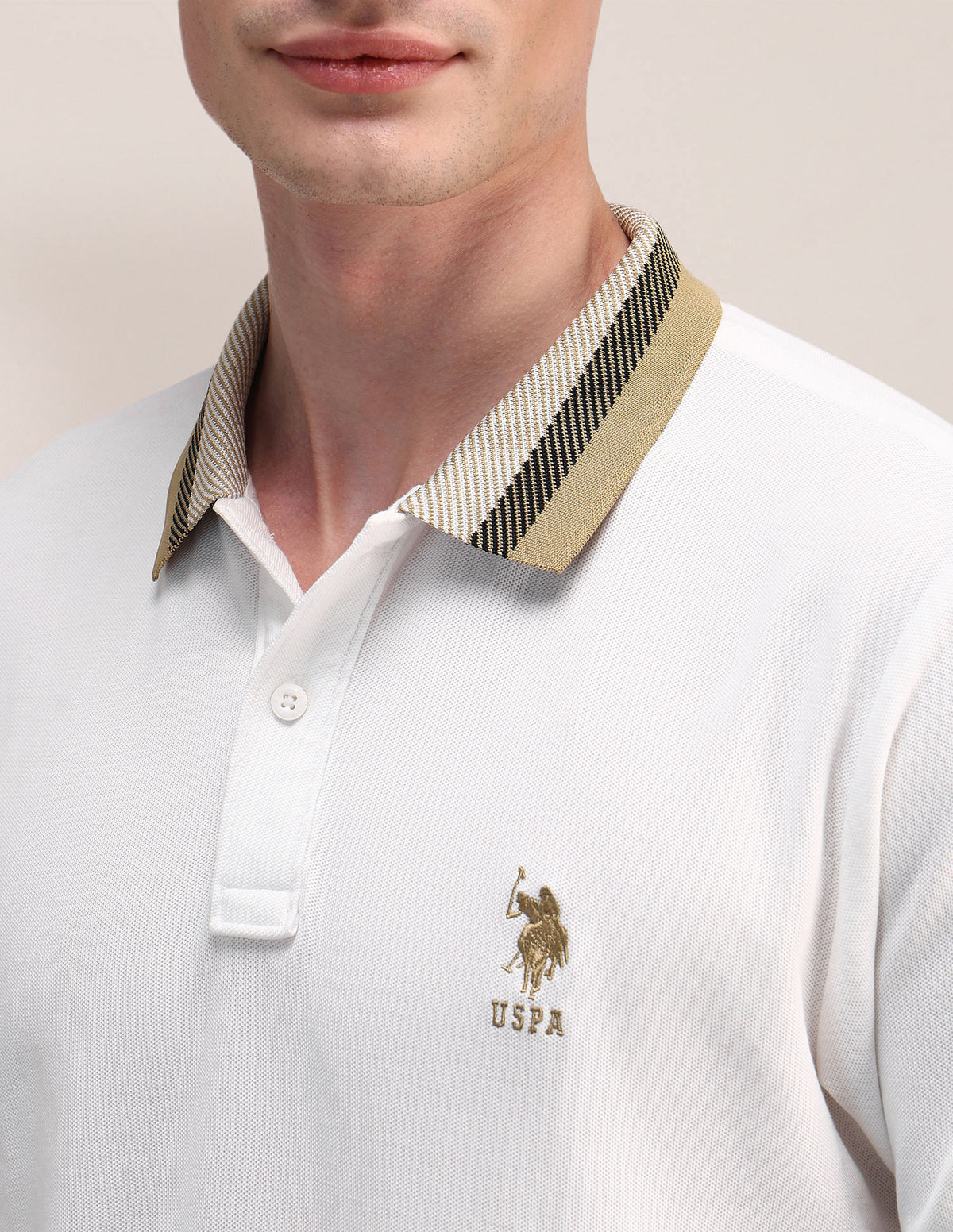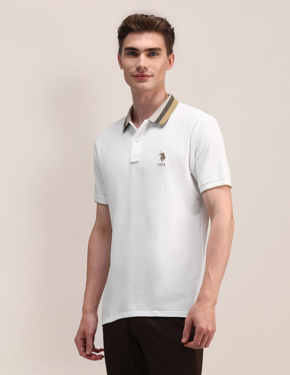 | Patterned polo collar | Logo at chest | Short button placket | Short sleeves | Ribbed collar and sleeve hems | Uneven vented hem | Solid pattern | Pique knit | Slim fit
