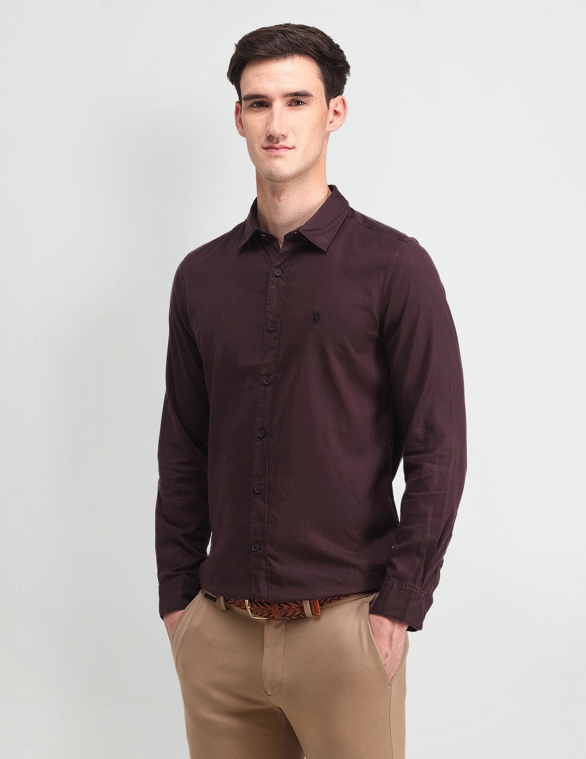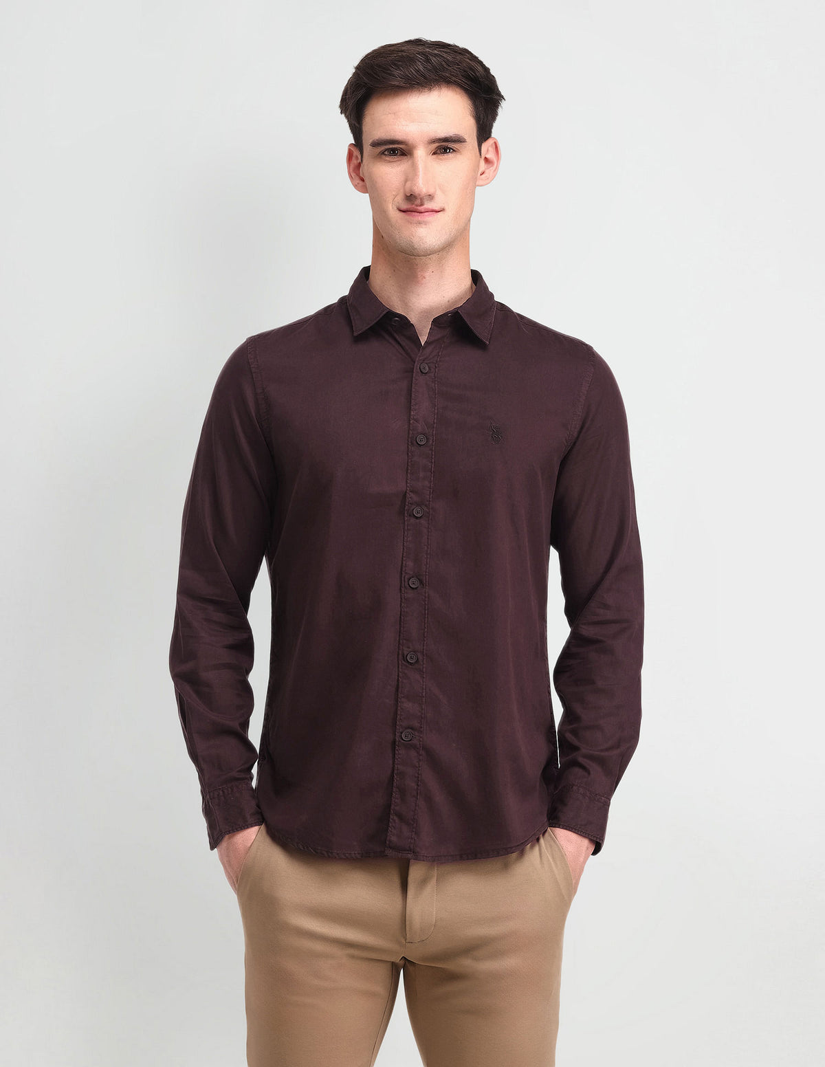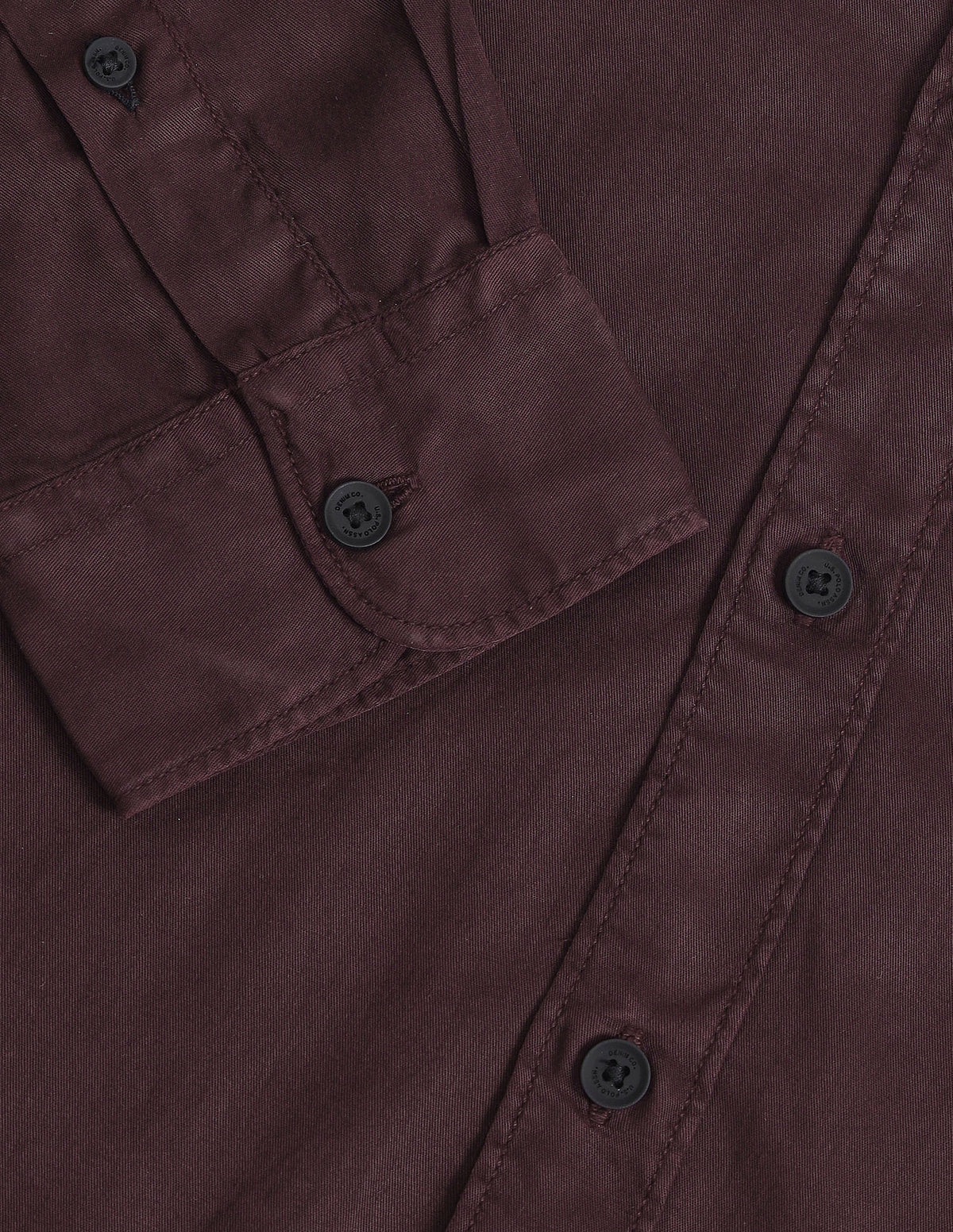| Semi-cutaway collar | Logo at chest | Full button placket | Long sleeves with rounded cuffs | Curved hemline | Solid pattern | Twill weave | Slim fit |
