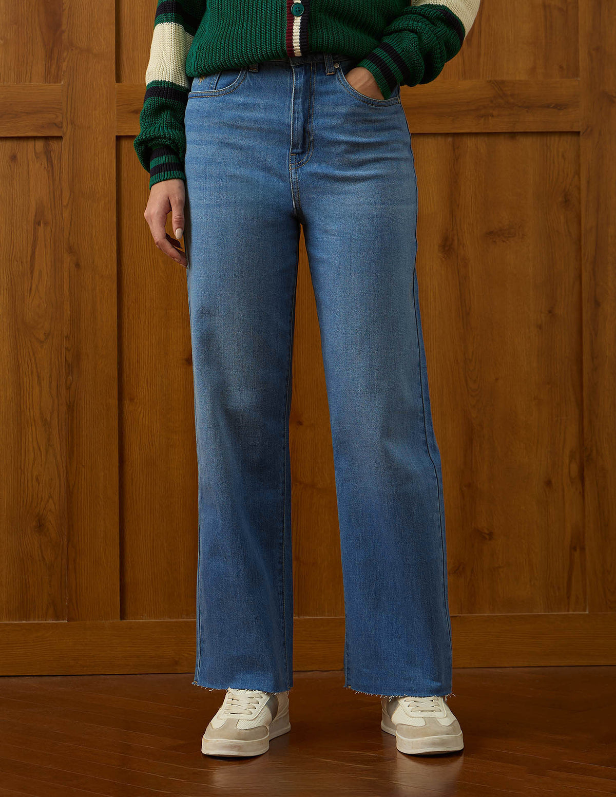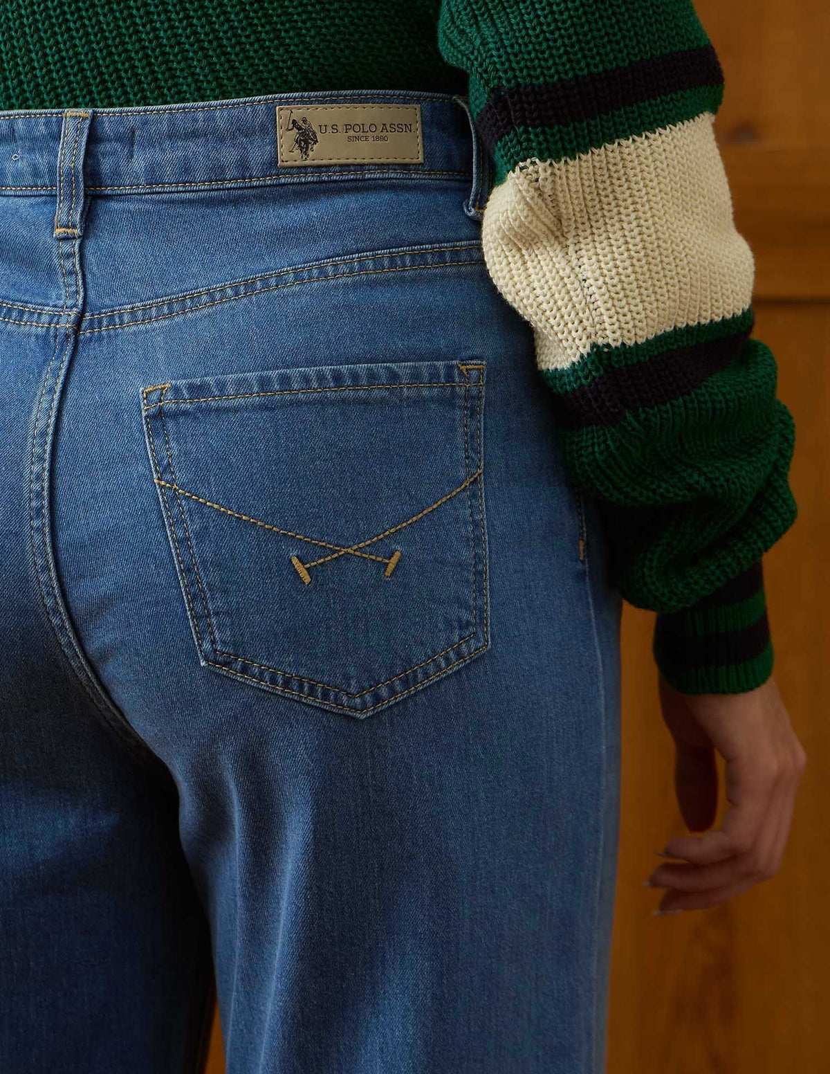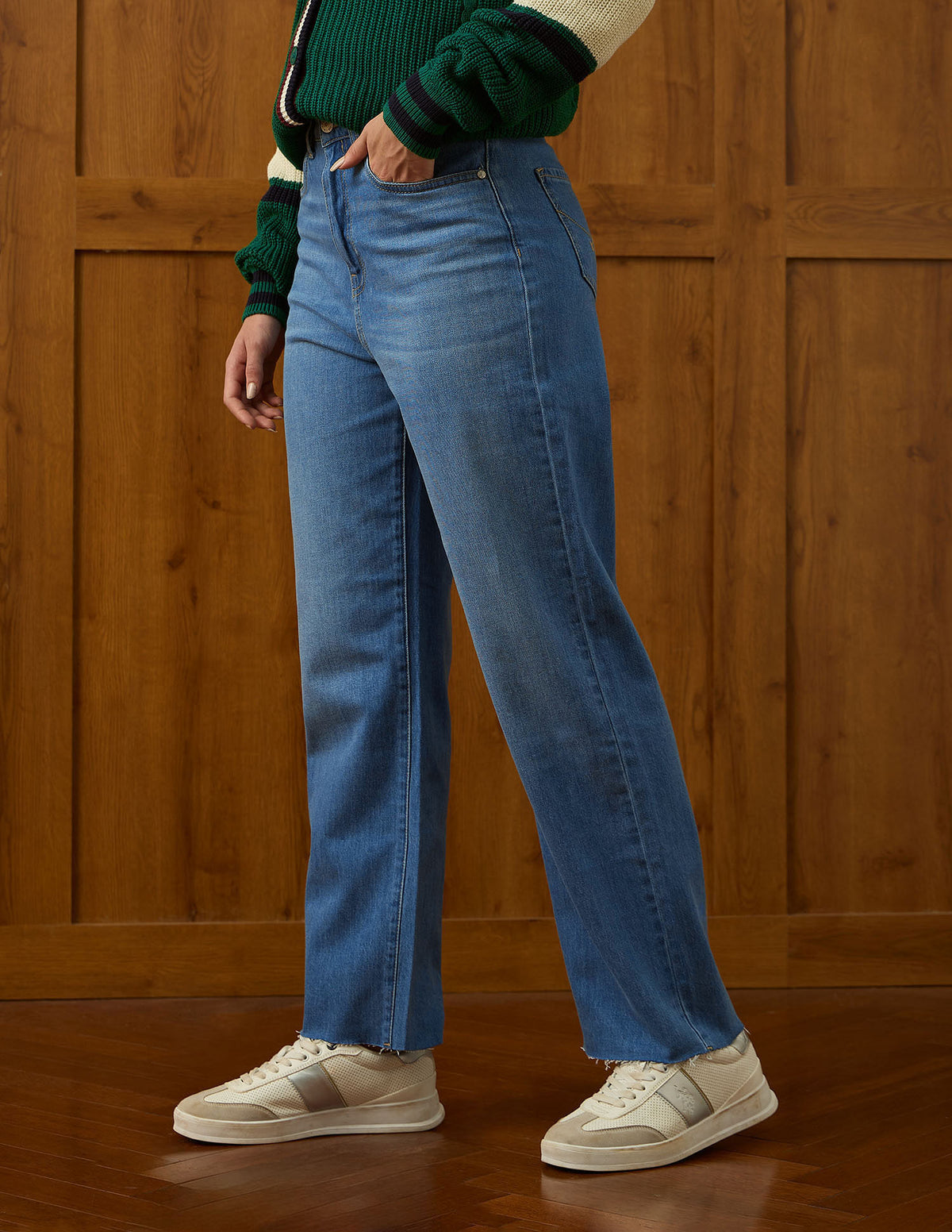 | High-rise waist | Button and zip fly closure | Five pockets | Stonewash | Denim weave | Straight fit |