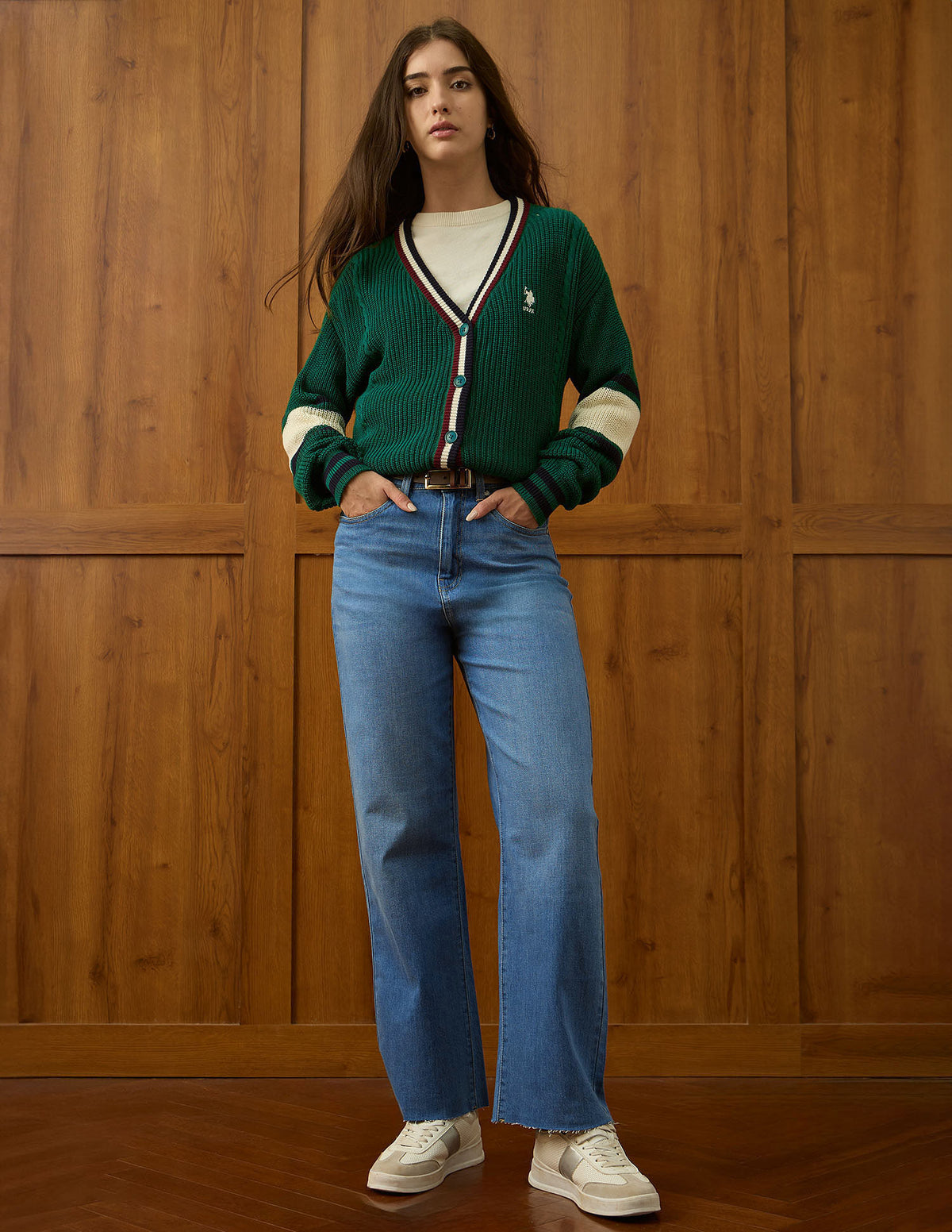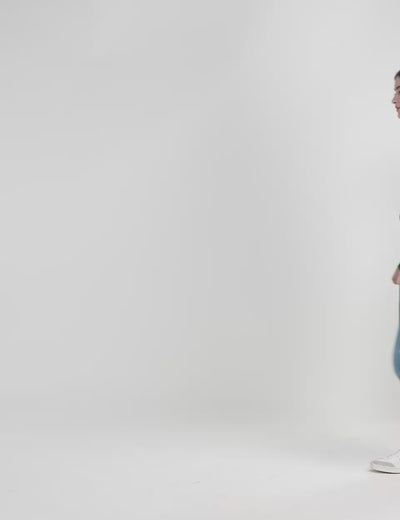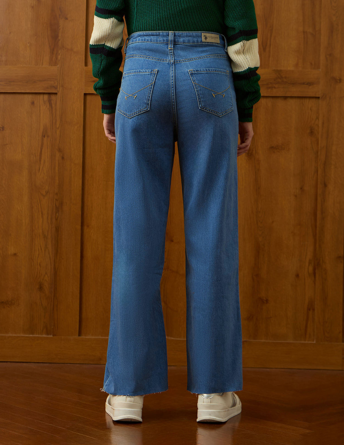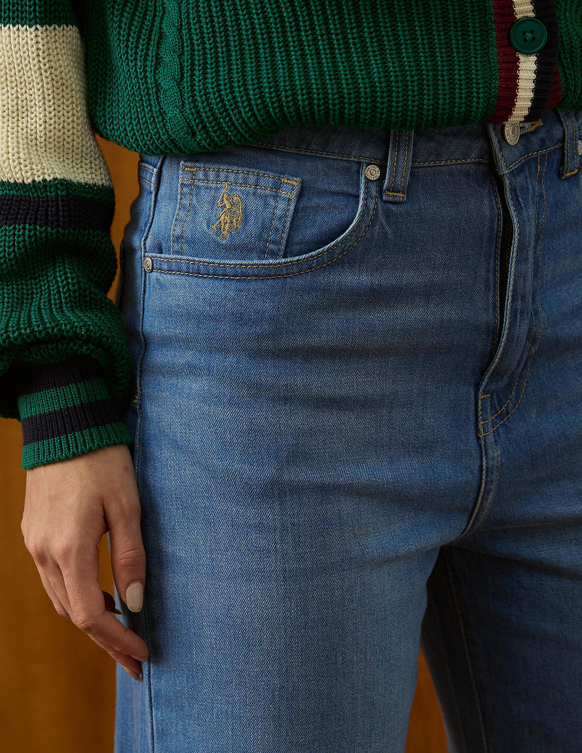 | High-rise waist | Button and zip fly closure | Five pockets | Stonewash | Denim weave | Straight fit |