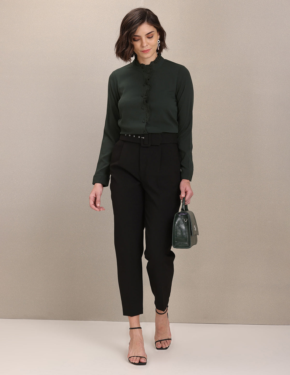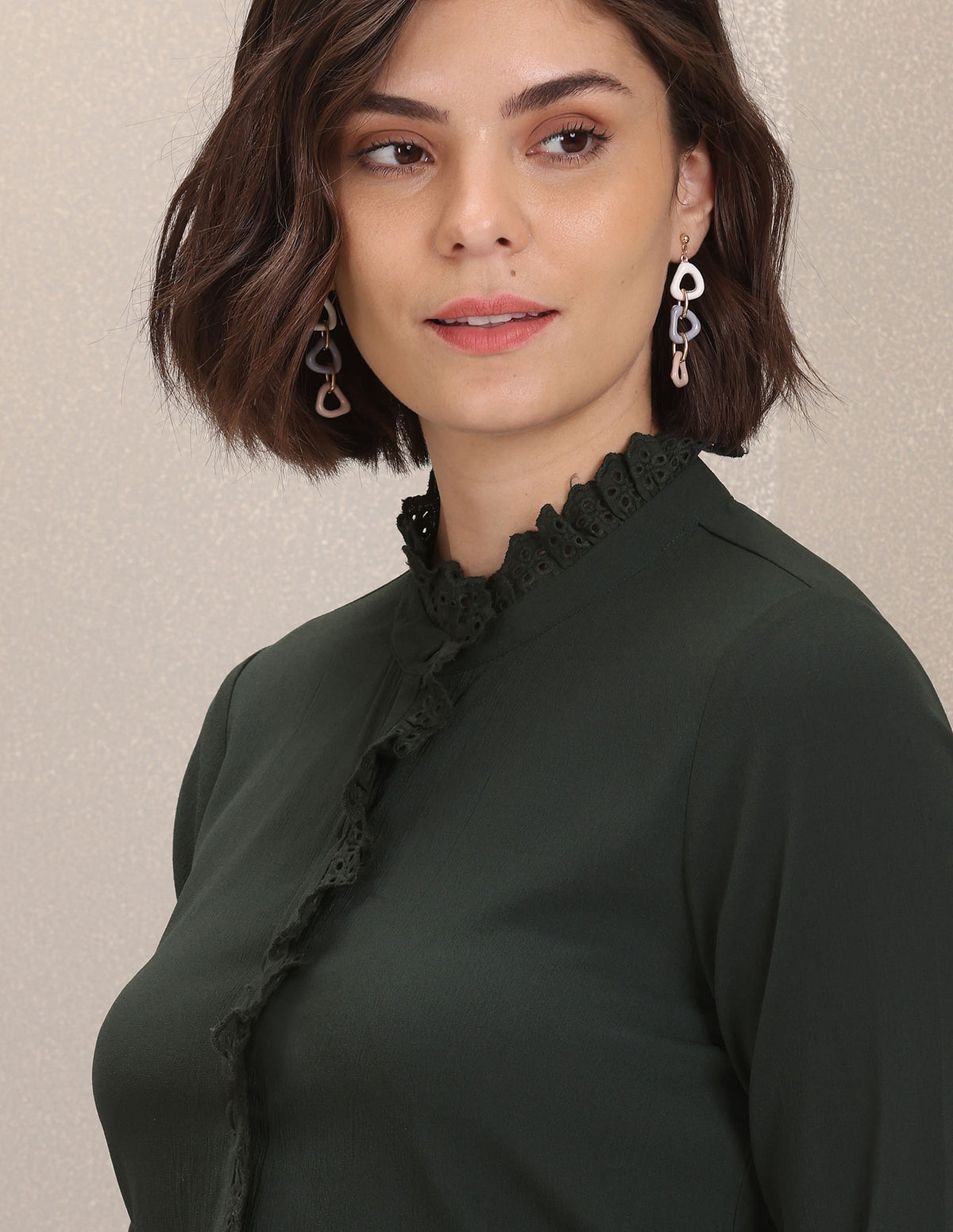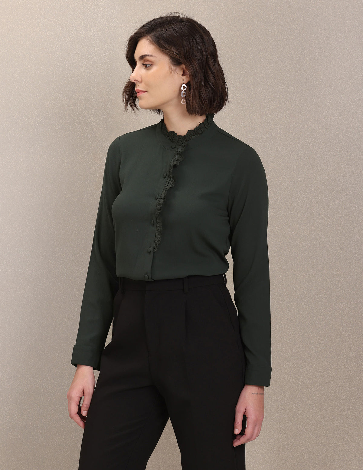 - Stand neck with ruffled detail