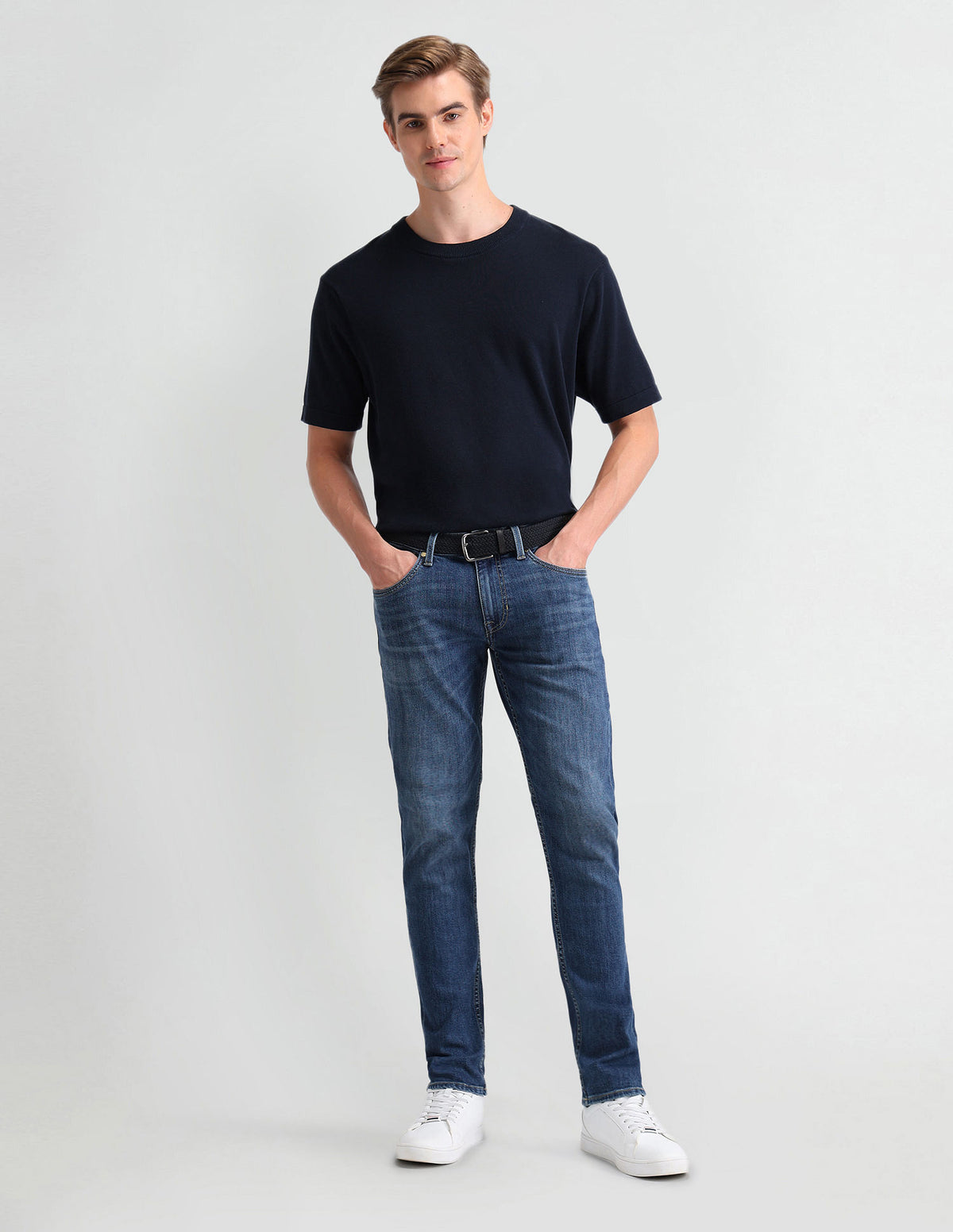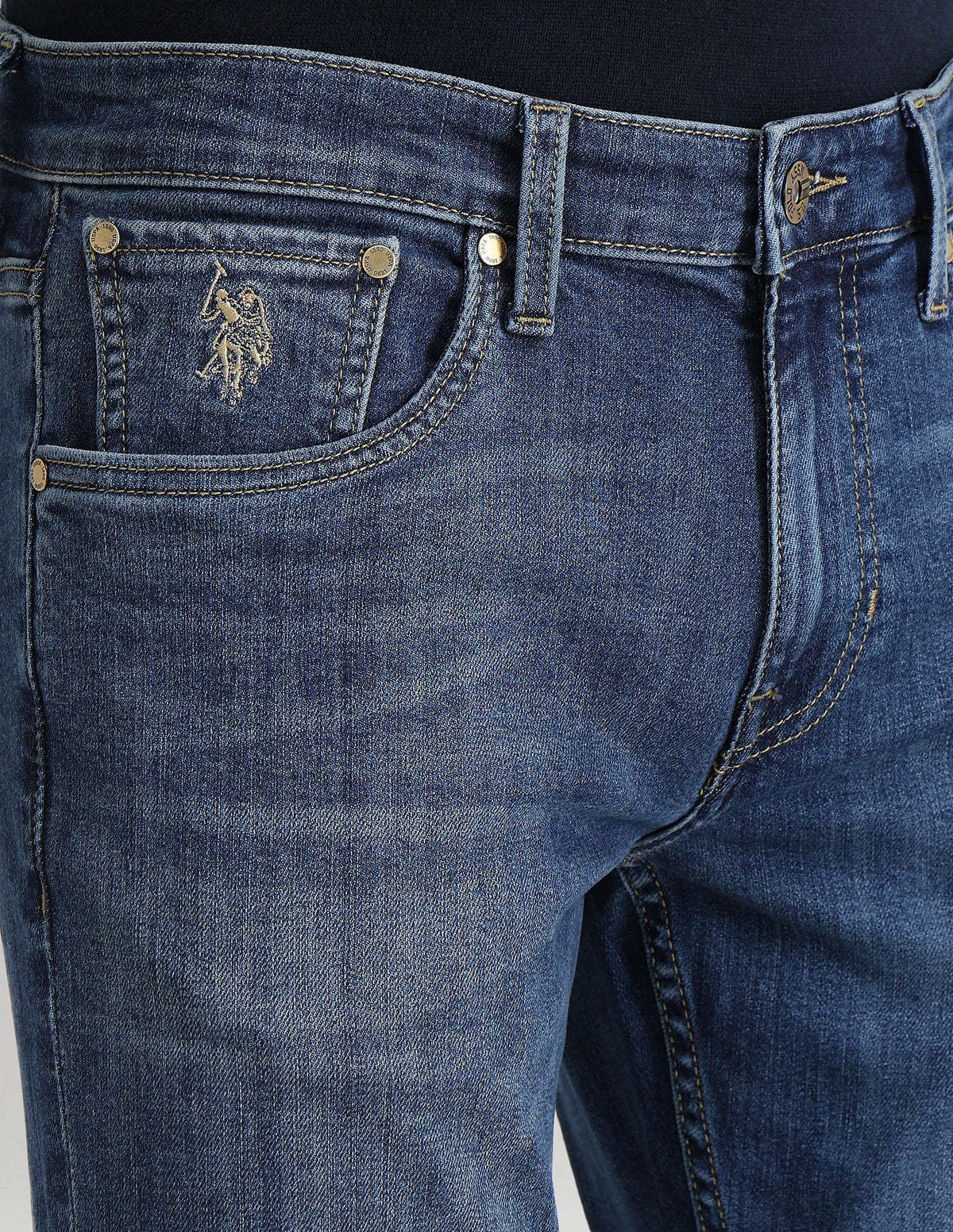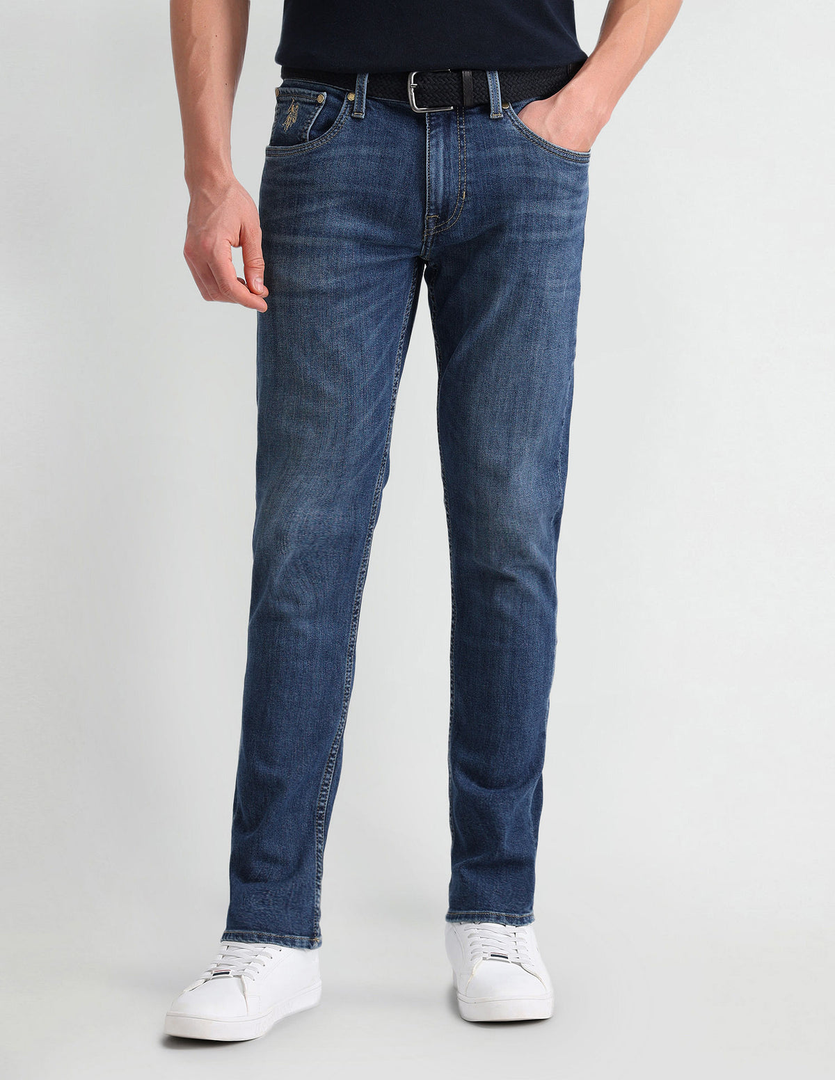 | Mid-rise waist | Button and zip fly closure | Five pockets | Stonewashed and whiskered | Denim weave | Brand fit: Brandon fit | Fit mapping: Slim tapered fit |