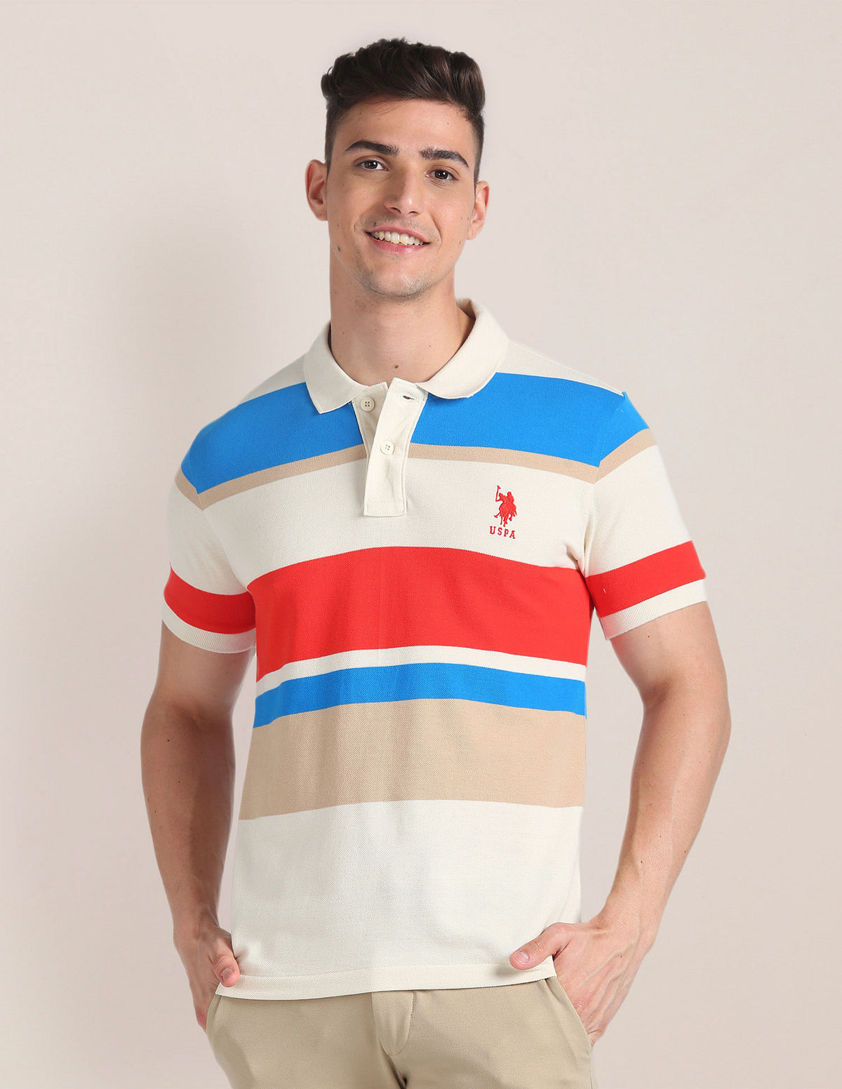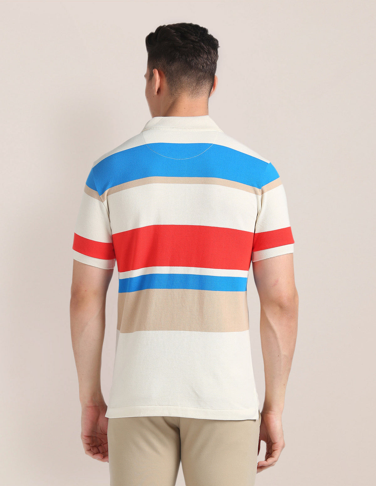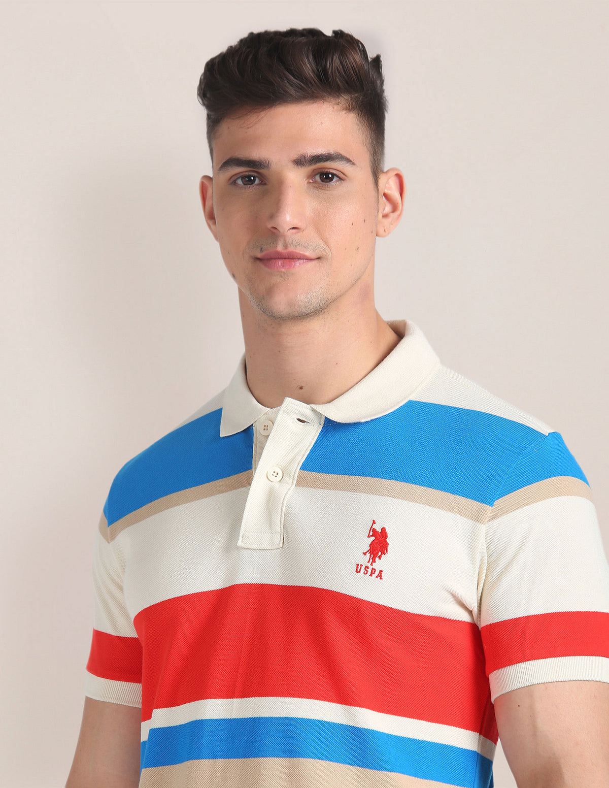 | Polo collar | Logo at chest | Short button placket | Short sleeves | Ribbed collar and sleeve hems | Uneven vented hem | Horizontal striped pattern | Pique knit | Slim fit- New Season - Summer Heroes
