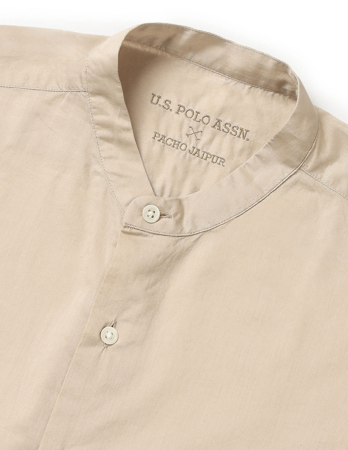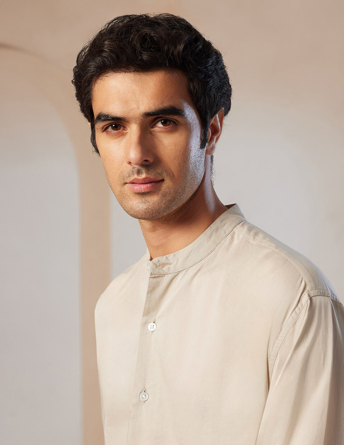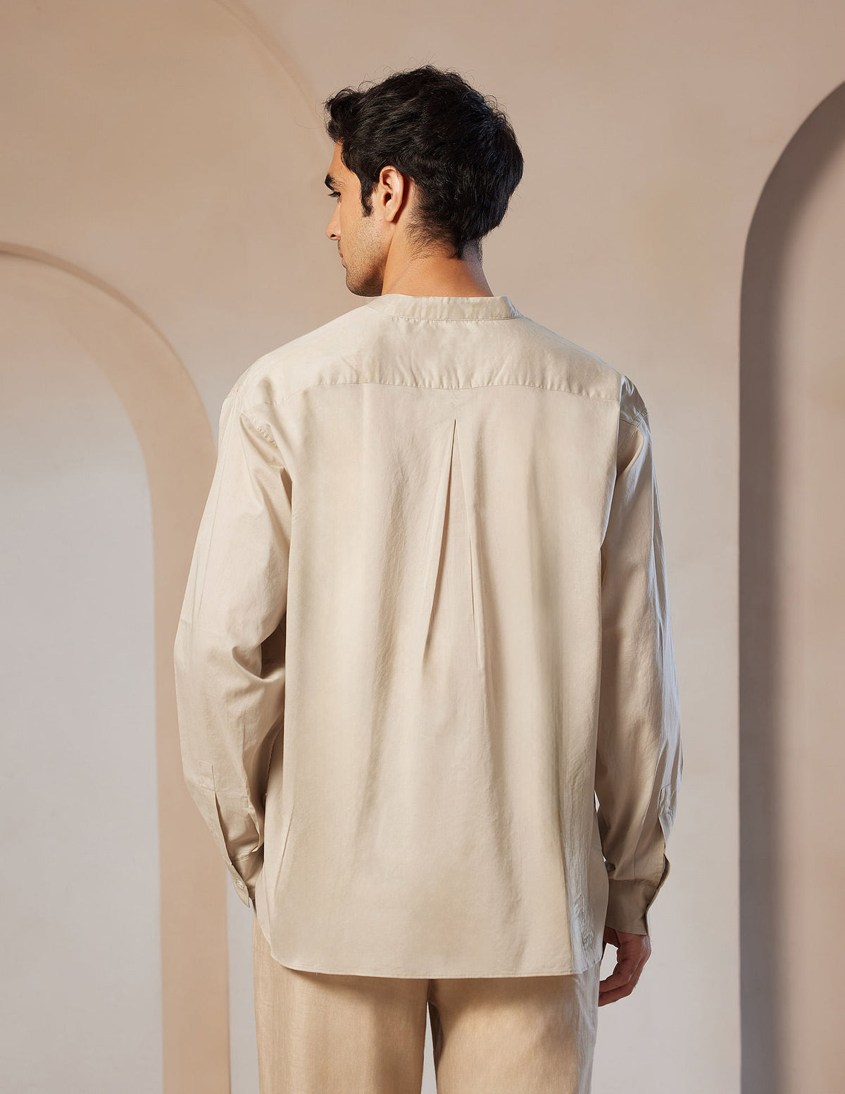 | Mandarin collar | Short button placket with pleat | Long sleeves with barrel cuffs | Curved hemline | Solid pattern | Regular weave | Tailored fit |