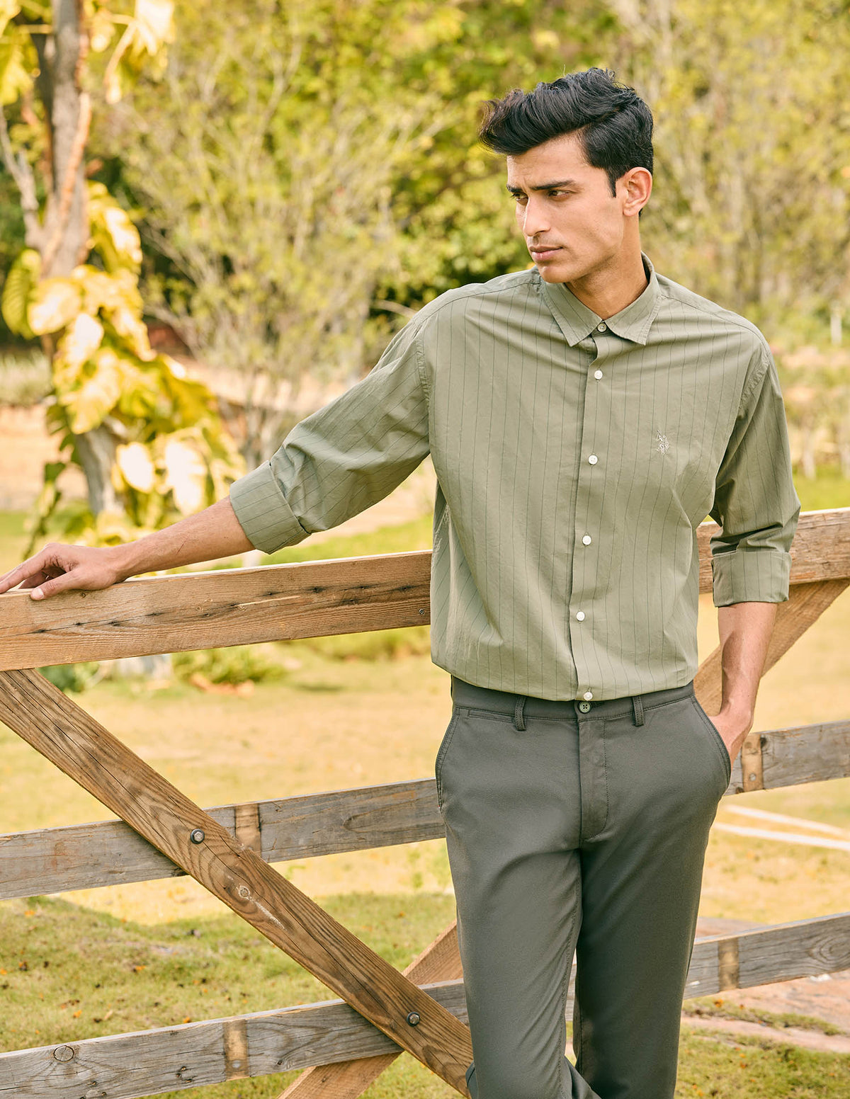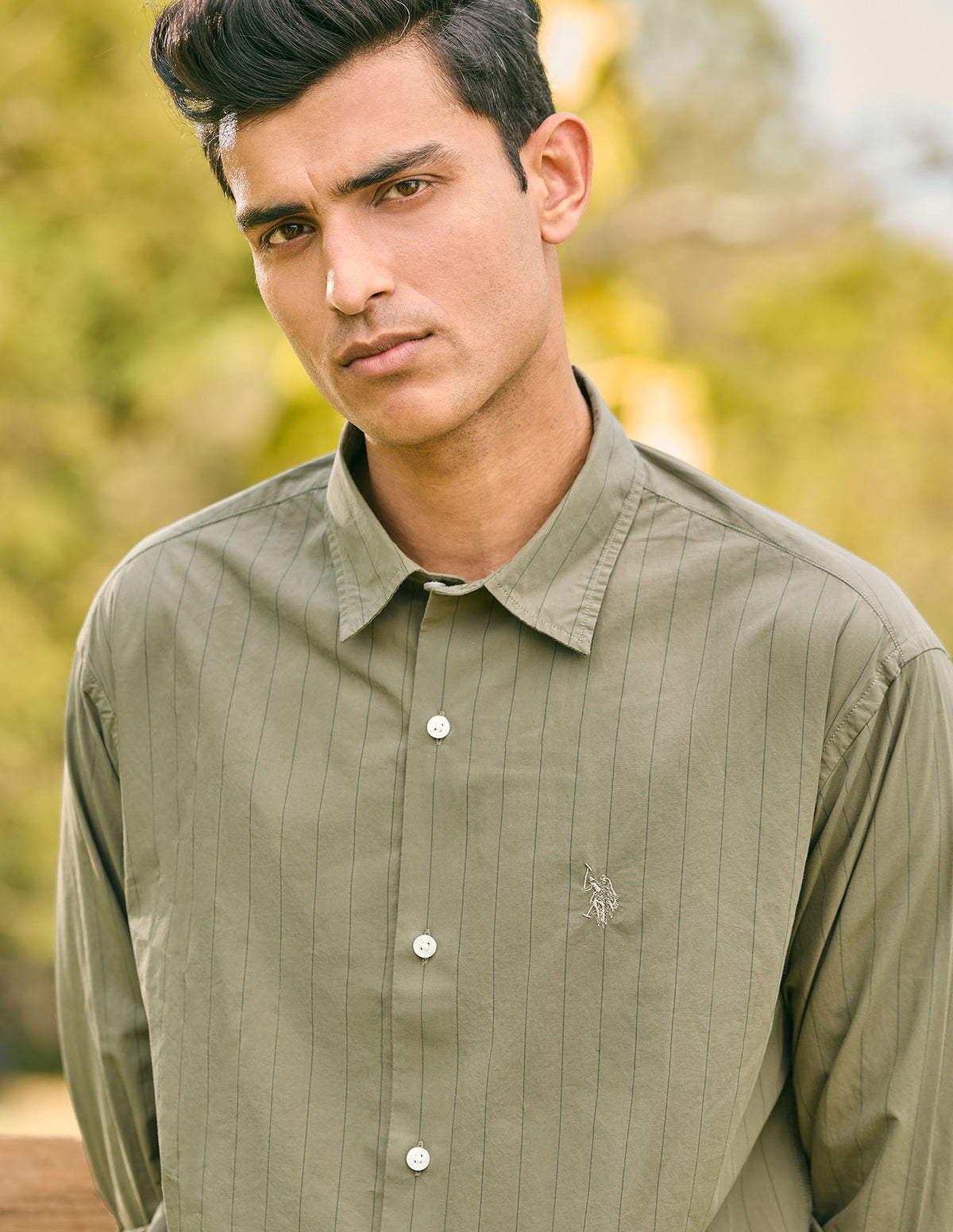 | Spread collar | Embroidered logo at chest | French button placket | Long sleeves with barrel cuffs | Straight vented hemline | Solid pattern | Regular weave | Tailored fit |