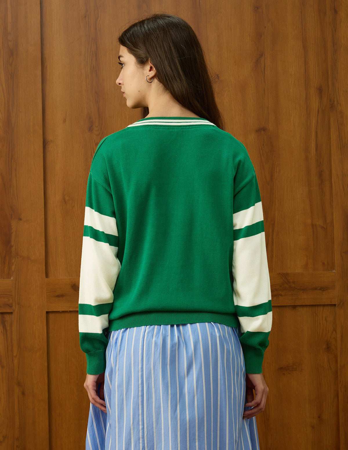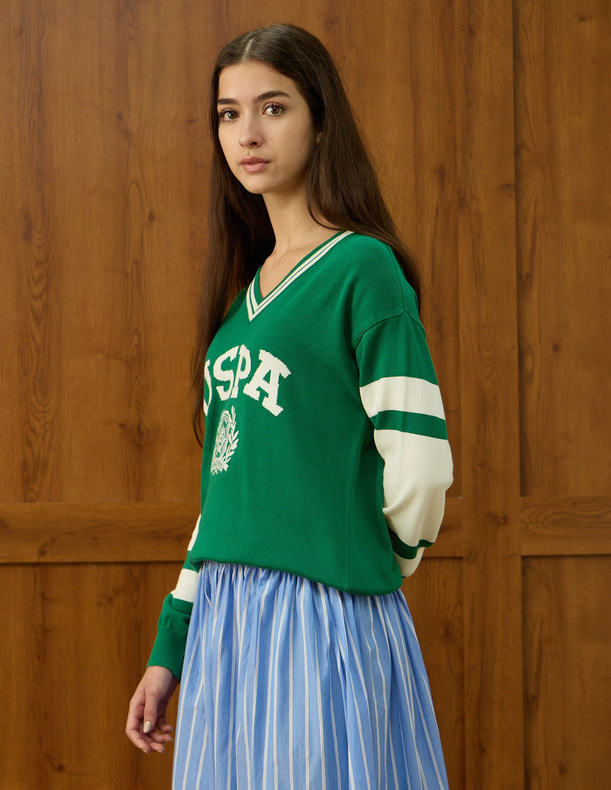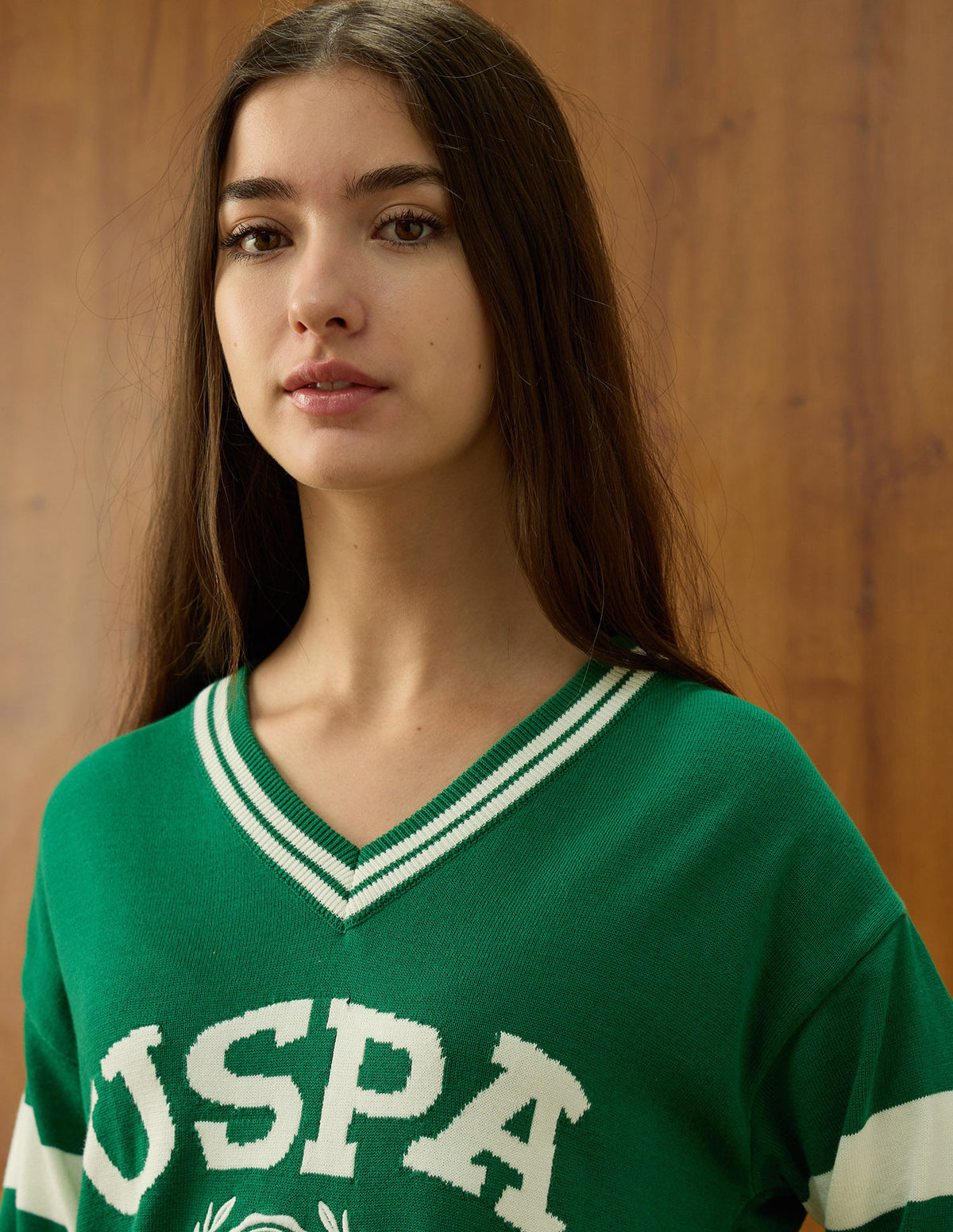 | V- neck | Logo at chest | Long sleeves | Ribbed neck, sleeve hems and hemline | Brand printed pattern | Knitted | Relaxed fit |