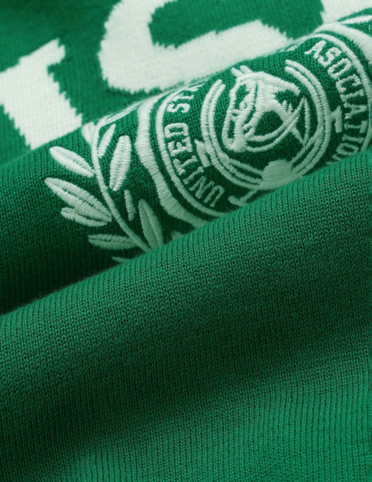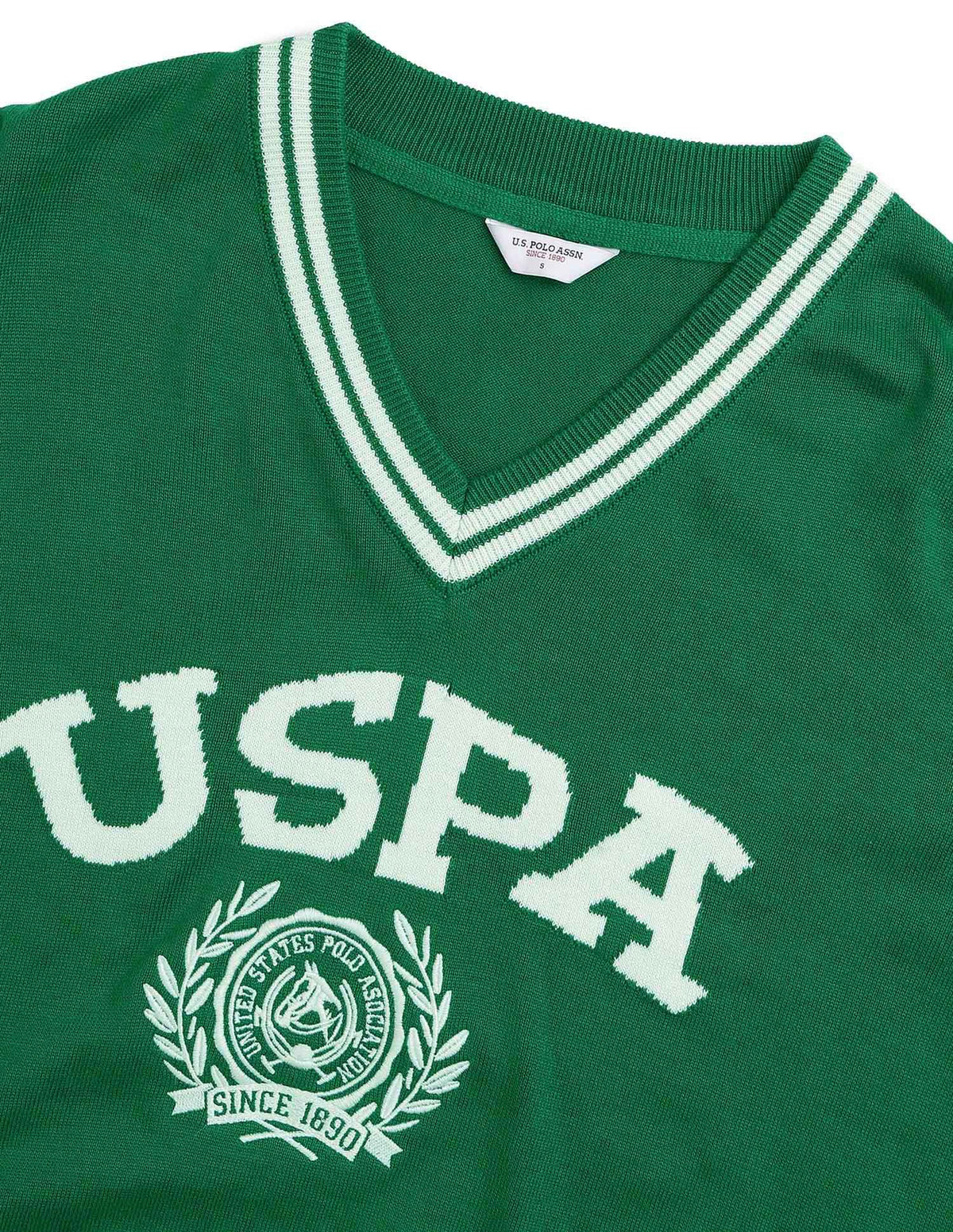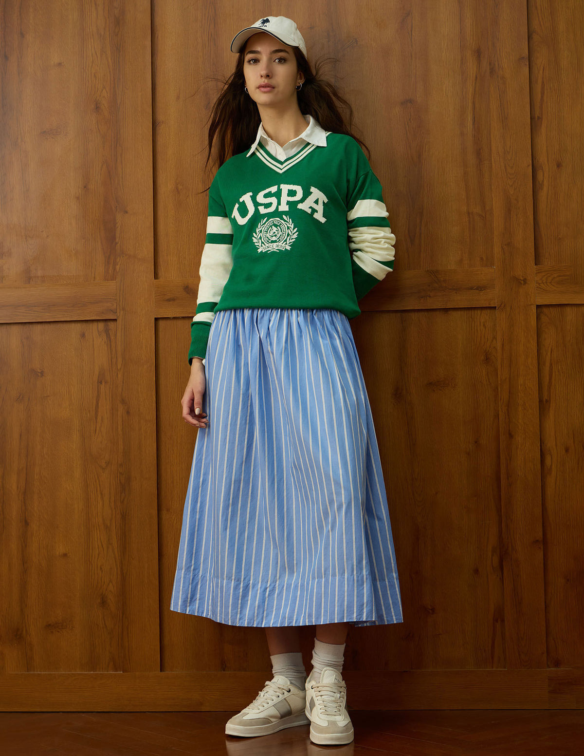 | V- neck | Logo at chest | Long sleeves | Ribbed neck, sleeve hems and hemline | Brand printed pattern | Knitted | Relaxed fit |