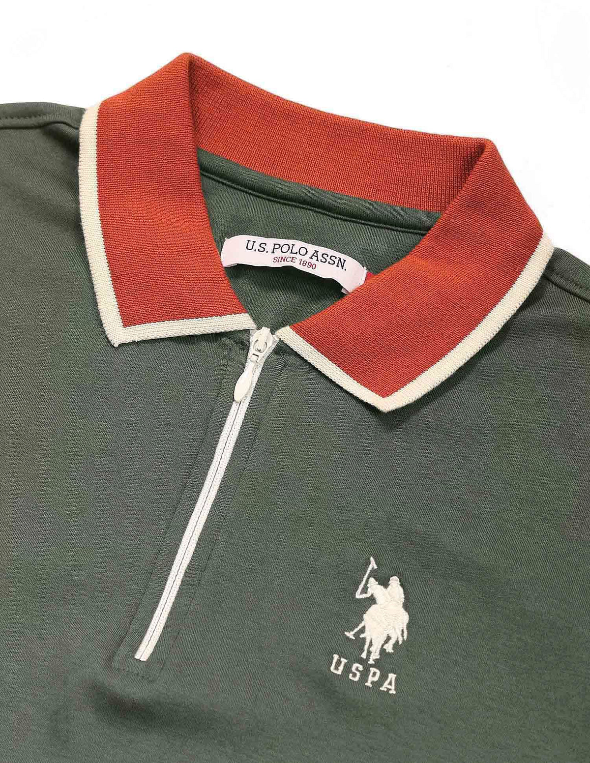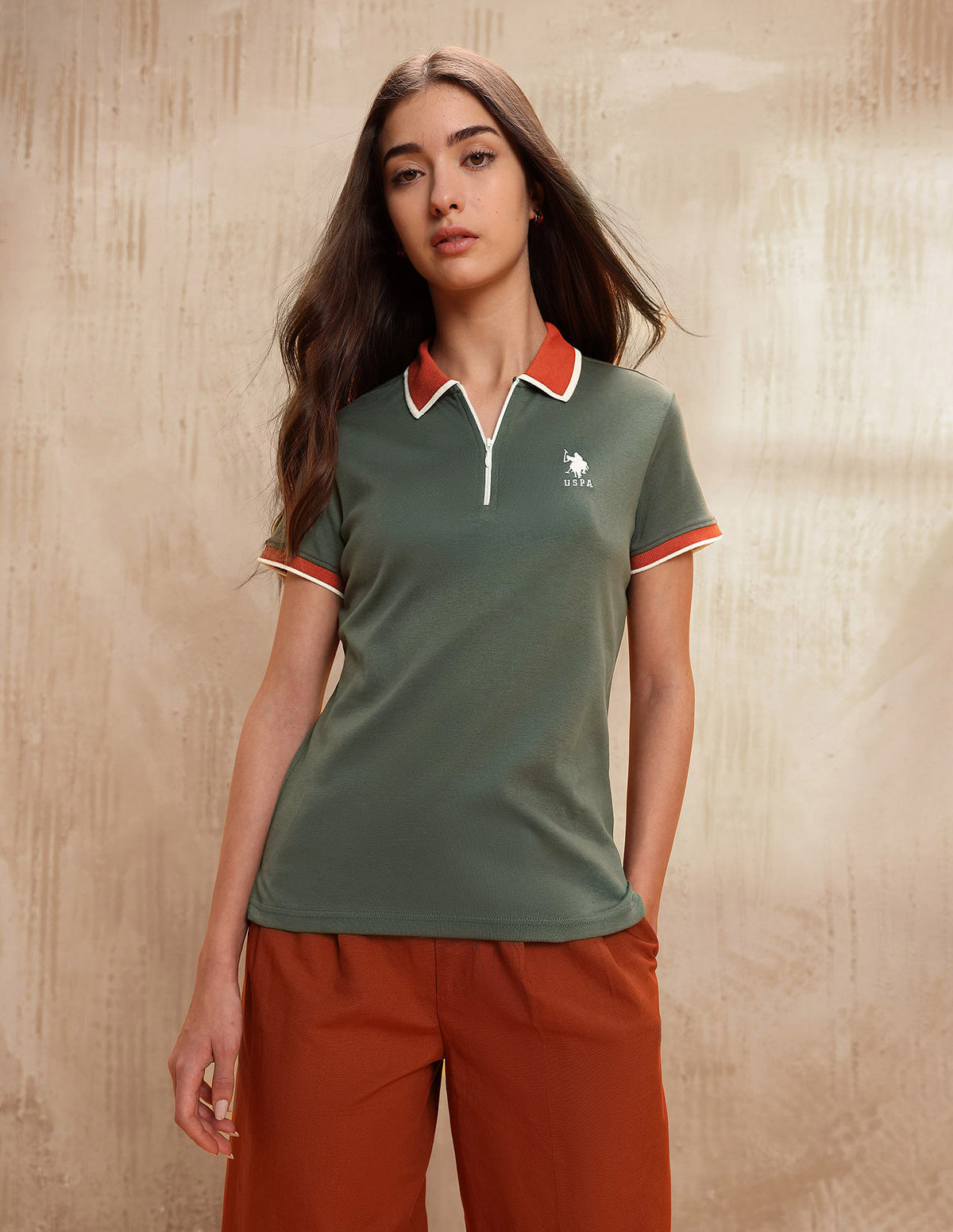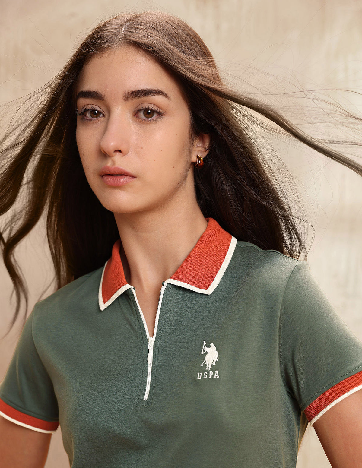 | Polo collar | Logo at chest | Short zip placket | Short sleeves | Ribbed collar and sleeve hems | Uneven vented hem | Solid pattern | Pique knit | Regular fit |