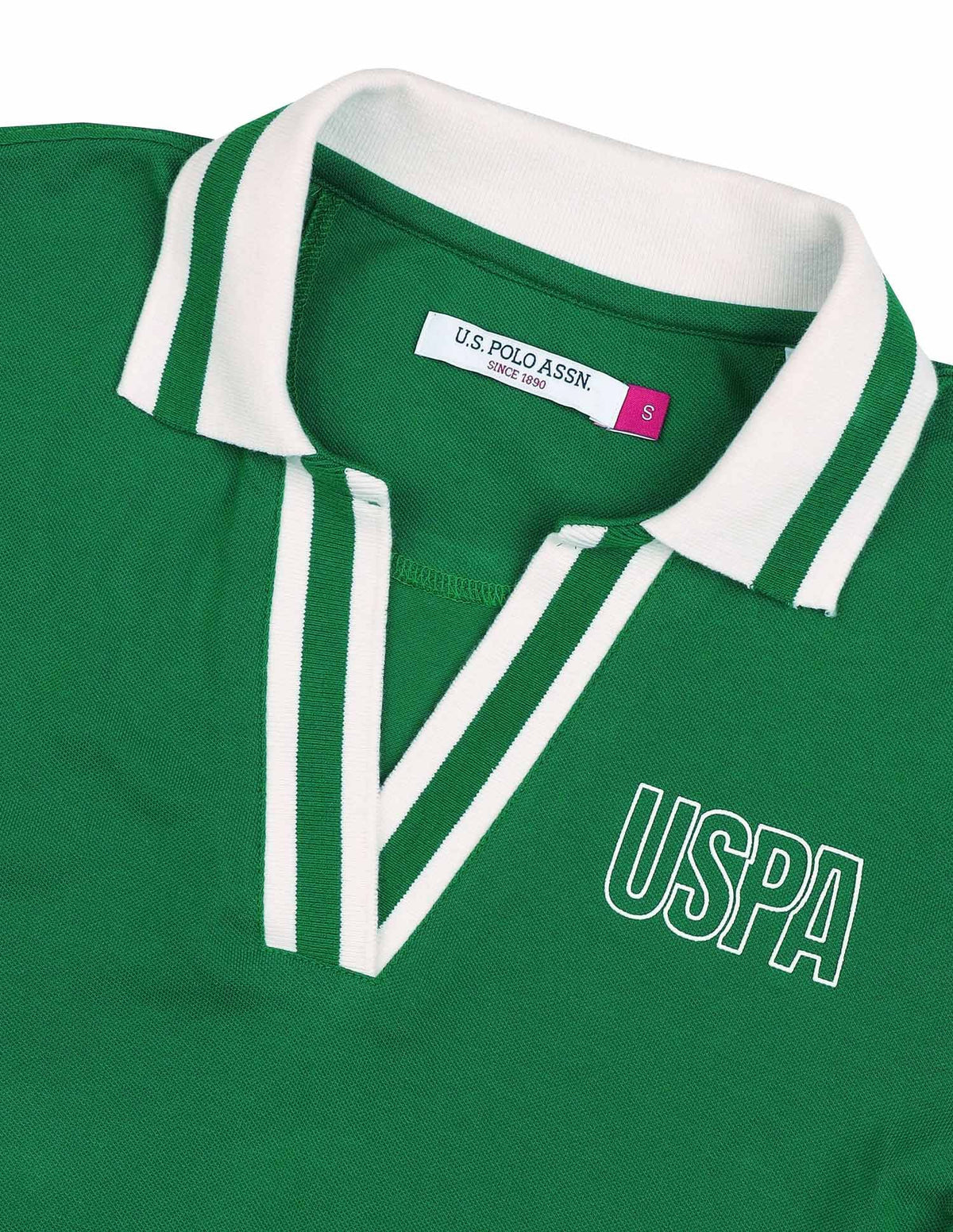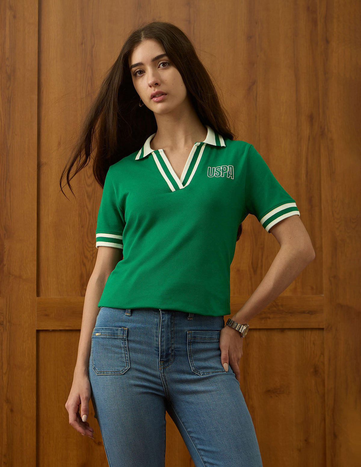 | Polo collar | Logo at chest | Open placket | Short sleeves | Ribbed collar and sleeve hems | Uneven vented hem | Solid pattern | Pique knit | Regular fit |