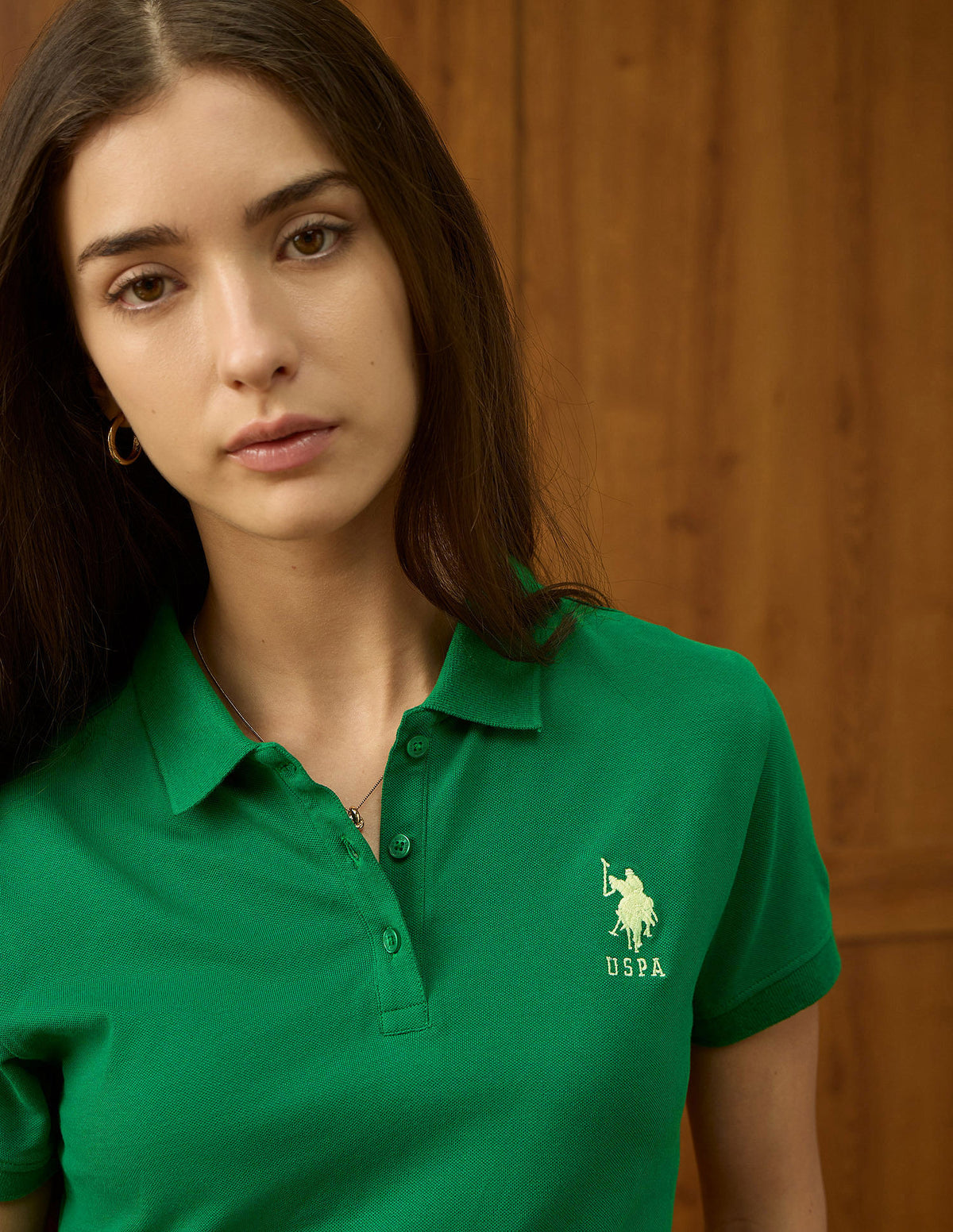 | Polo collar | Logo at chest | Short button placket | Short sleeves | Uneven vented hem | Solid pattern | Pique knit | Regular fit |