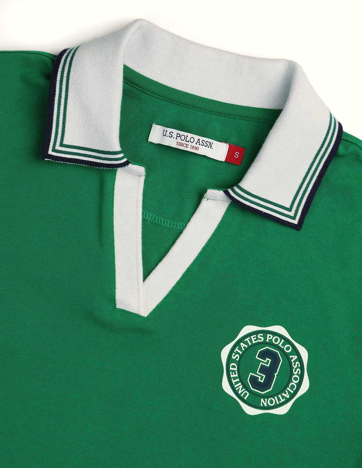 | Polo collar | Logo at chest | Open placket | Short sleeves | Uneven vented hem | Solid pattern | Pique knit | Regular fit |