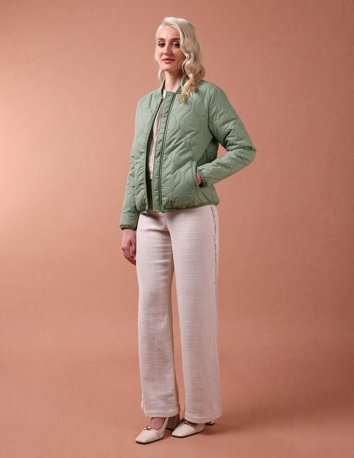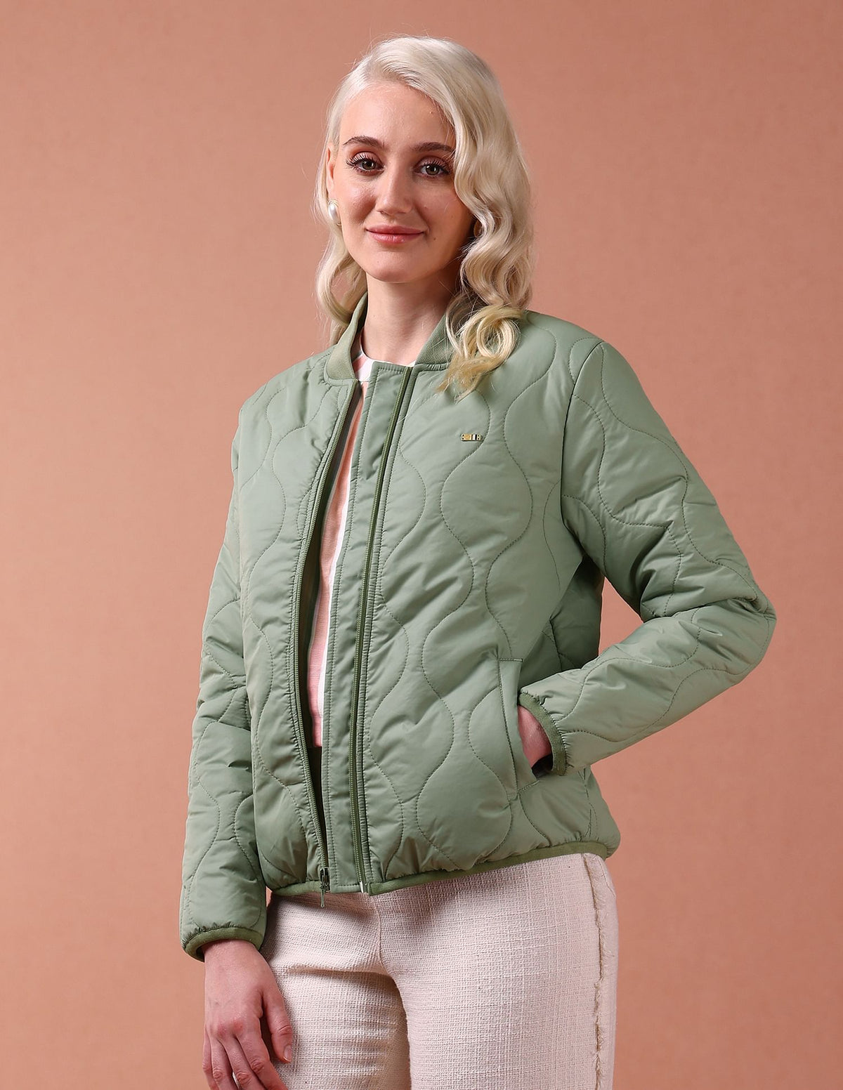 | Stand collar | Logo at chest | Full zipper closure | Long sleeves | Elasticized sleeve hems and hemline | Two pockets | Quilted construction | Solid pattern |