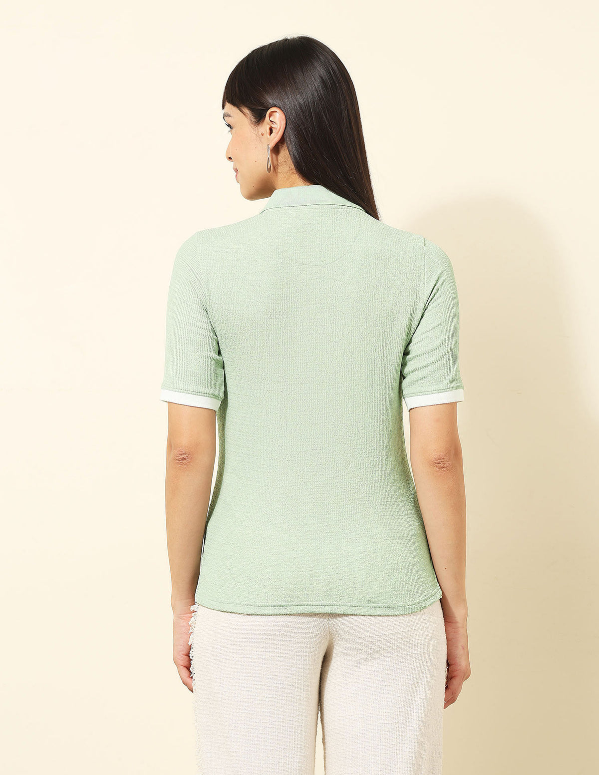 | Polo collar | Logo at chest | Short button placket | Short sleeves | Ribbed collar and sleeve hems | Uneven vented hem | Textured pattern | Pique knit | Regular fit |