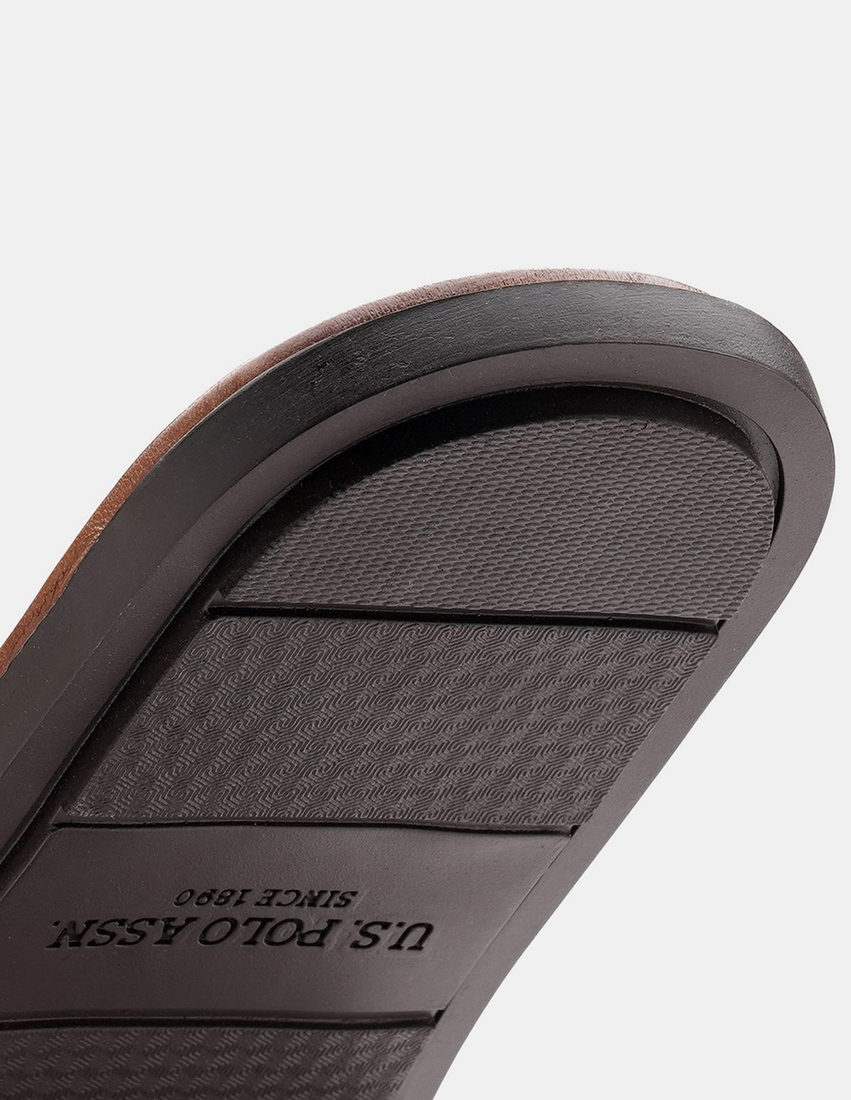 | Toe separator | Broad V-strap with buckle | Cushioned footbed with logo | Textured outsole | Solid pattern |