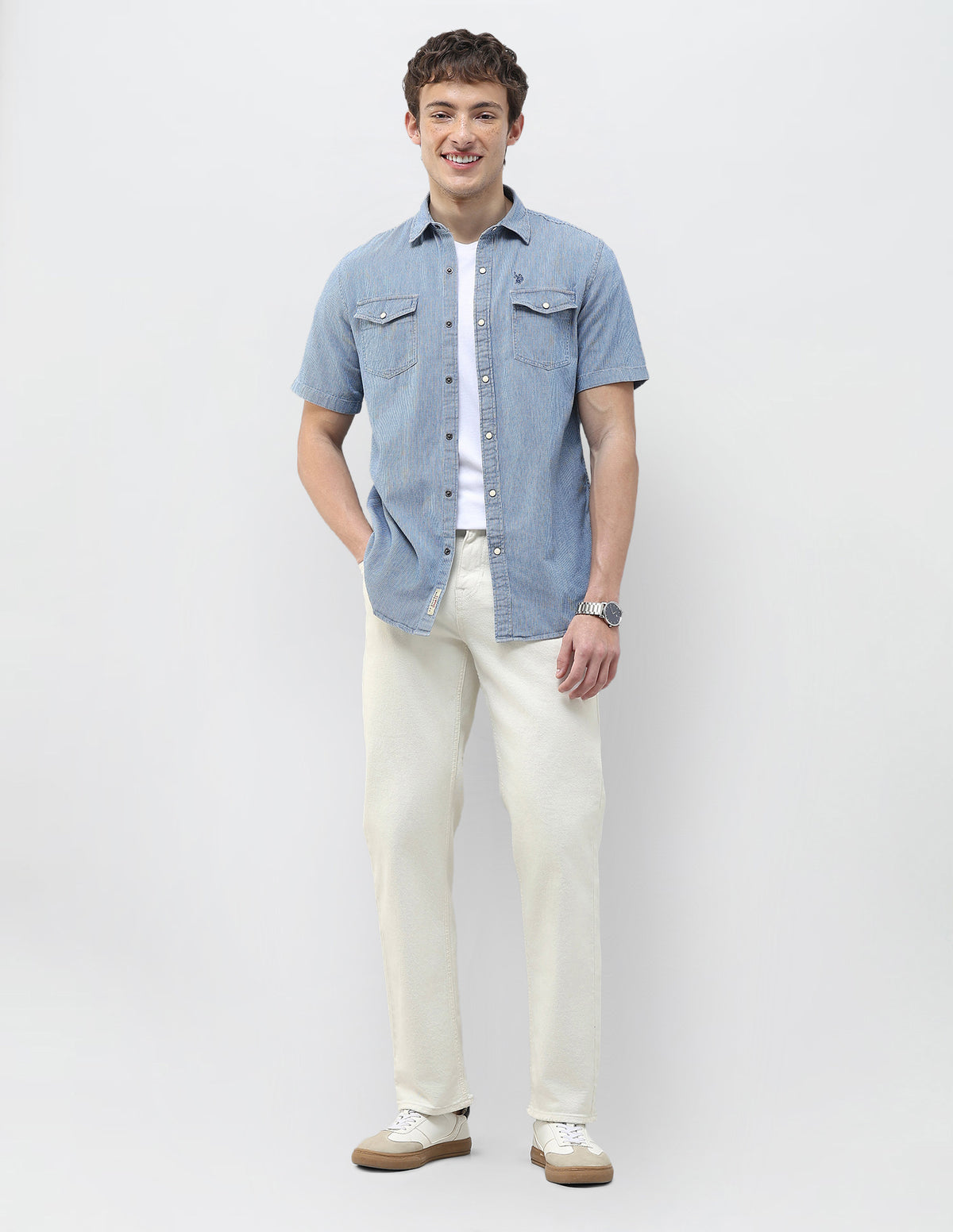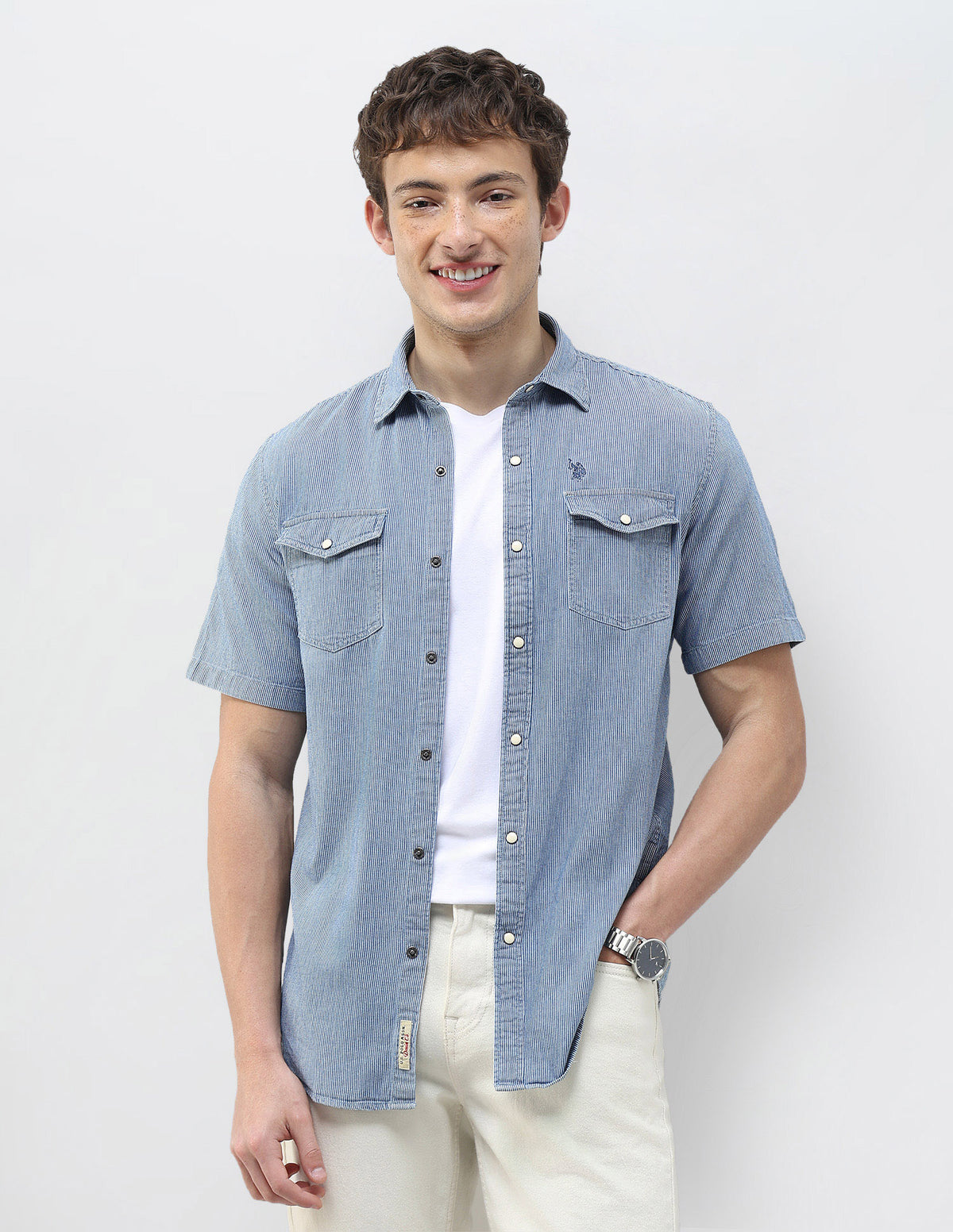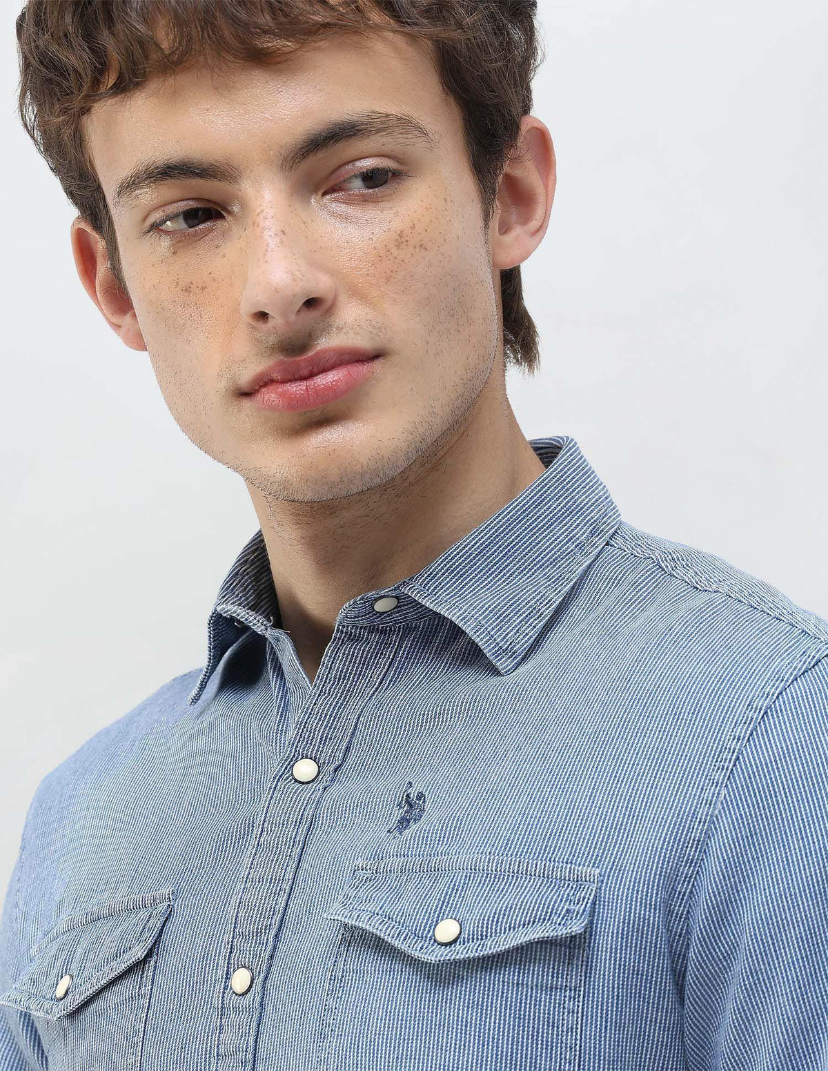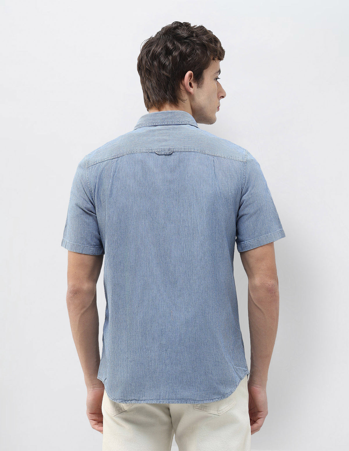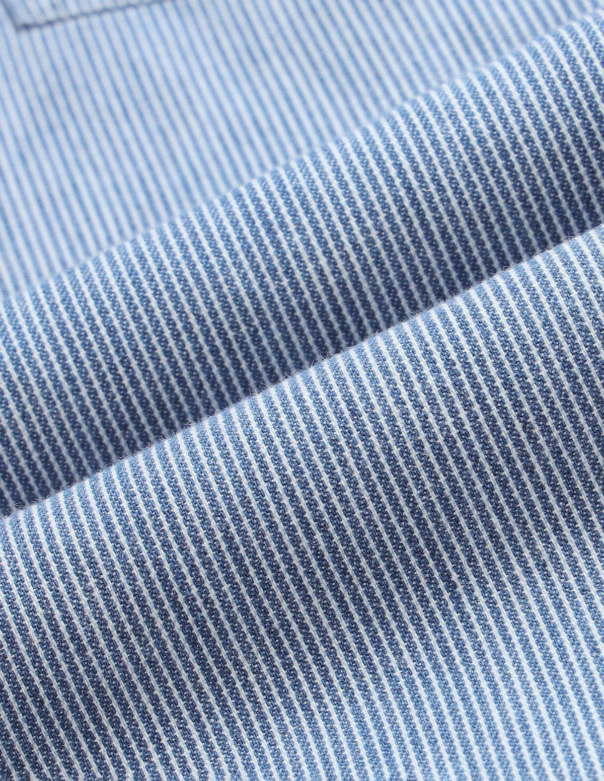 Story: This men's shirt from the Summer House collection features vertical pinstripes in yds indigo dobby, blending casual sophistication with refined comfort.