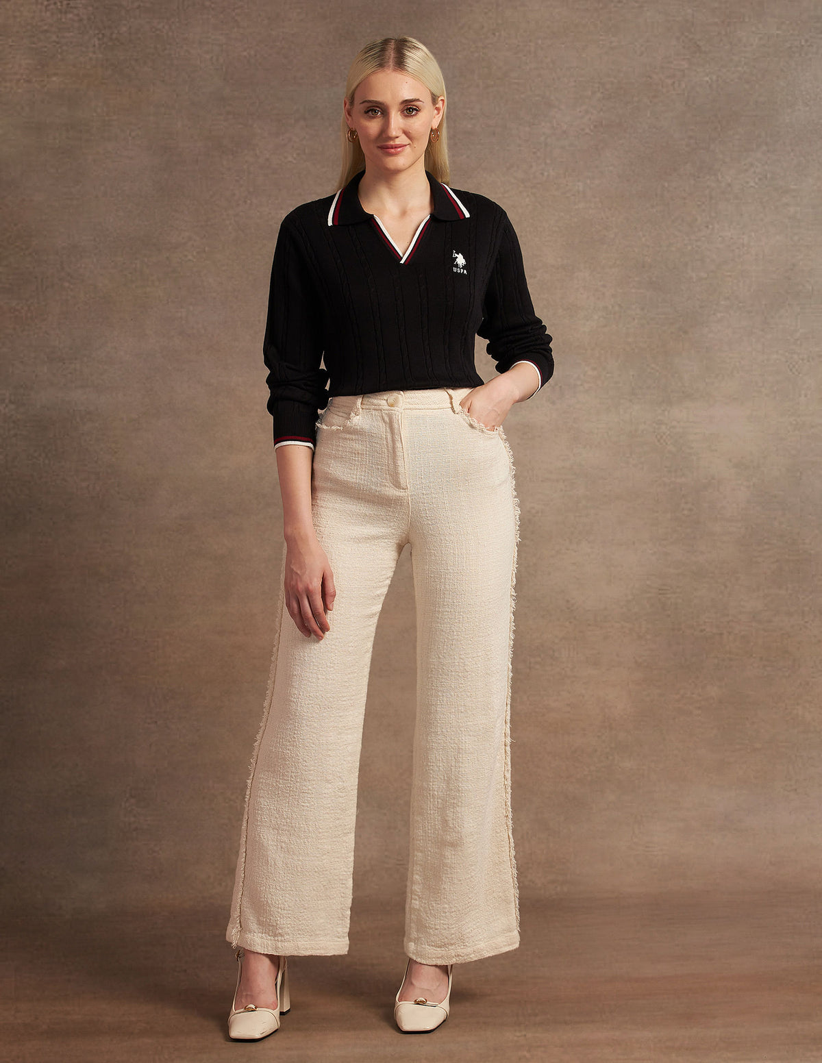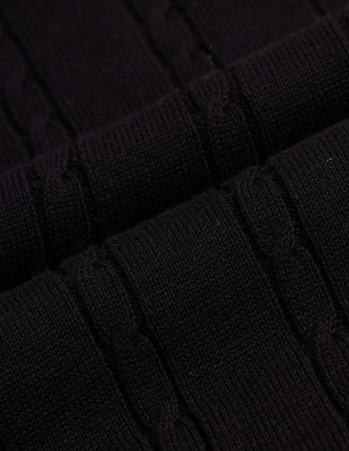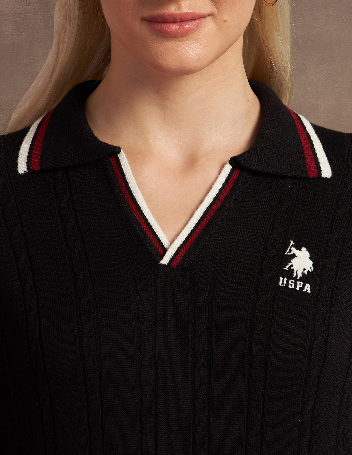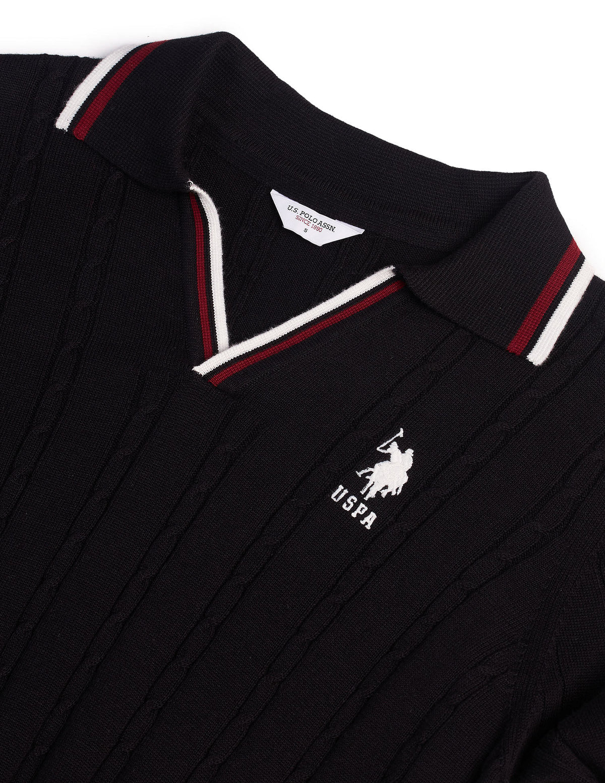 | Polo collar | V-neck | Logo at chest | Long sleeves | Ribbed and tipped neck, sleeve hems and hemline | Cable knit pattern | Regular fit |