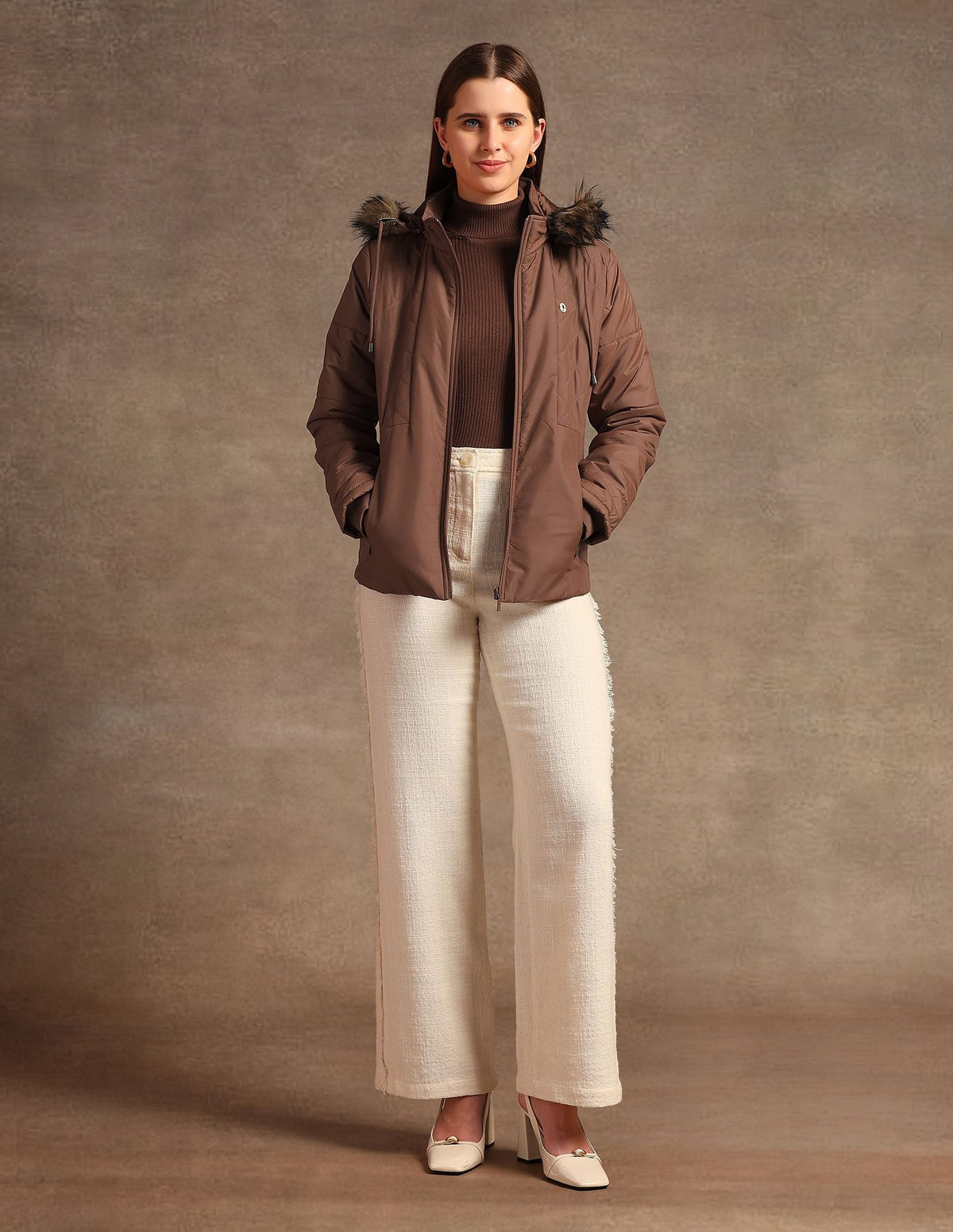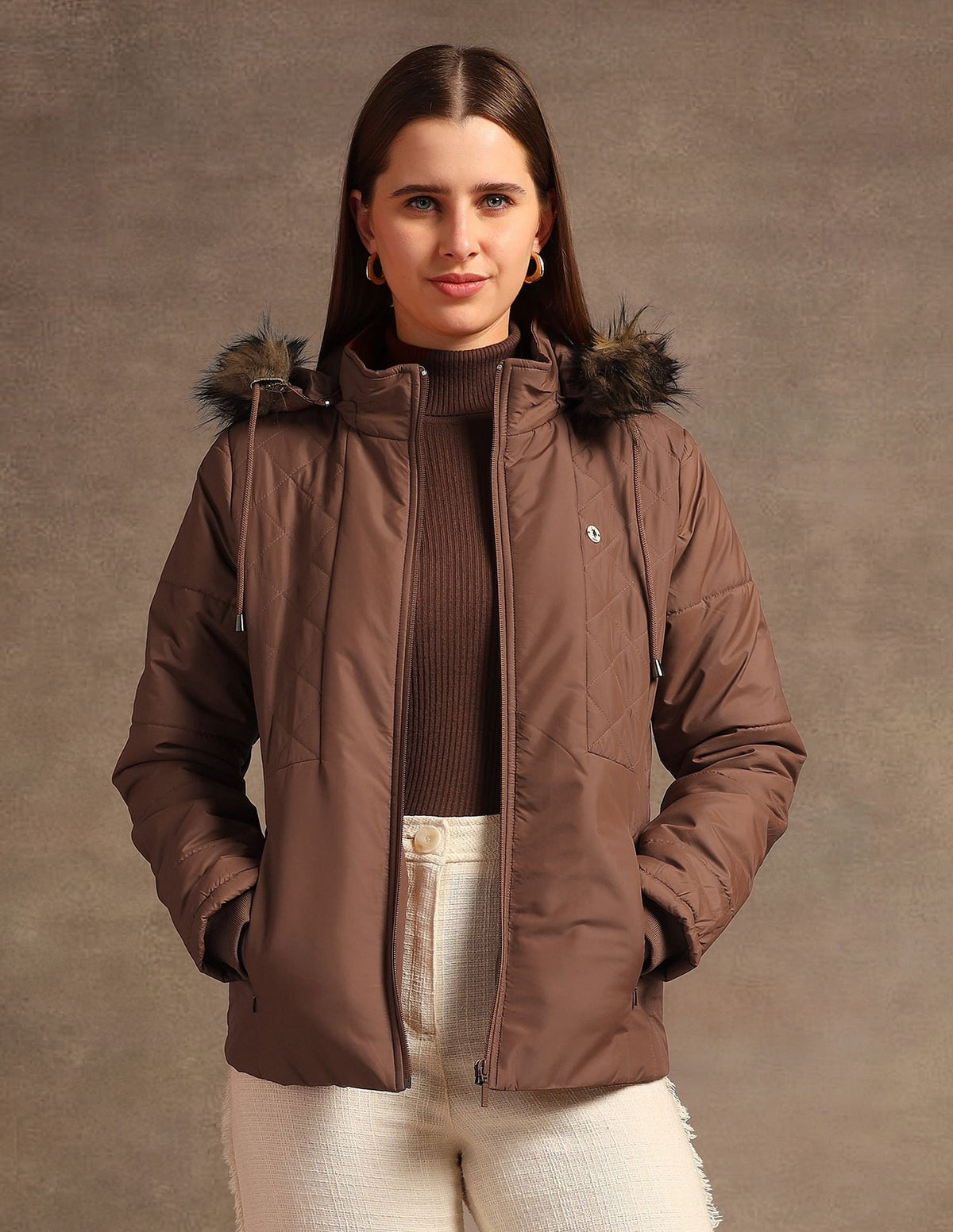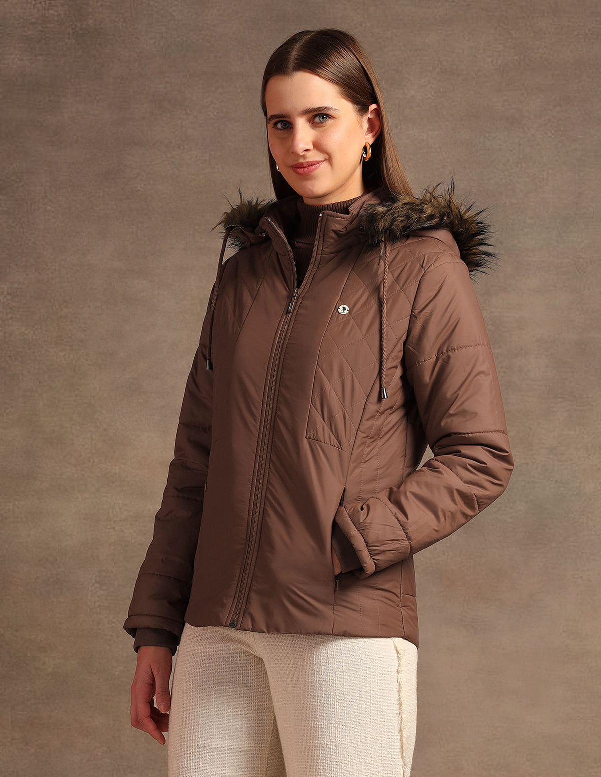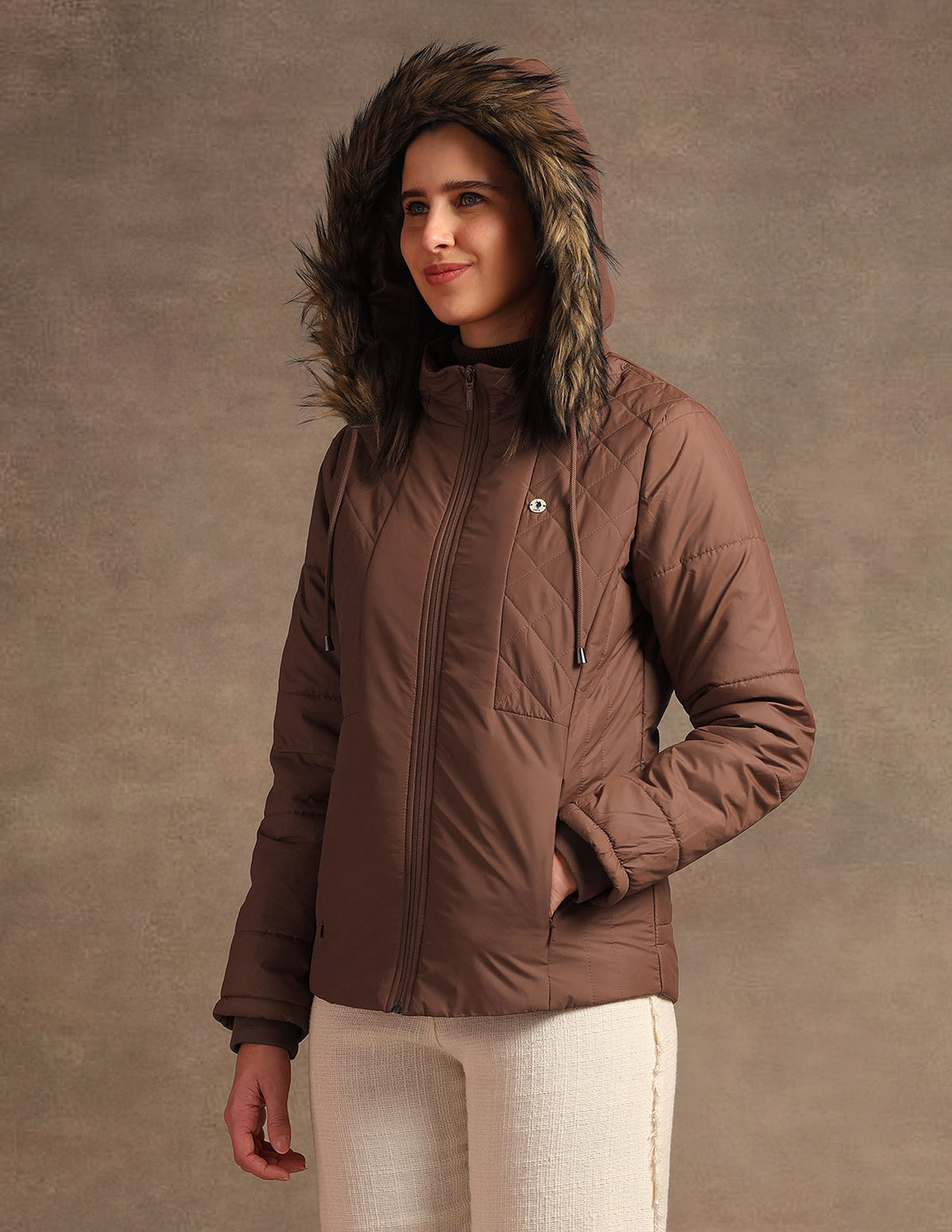 | Hooded with fur detail | Logo at chest | Full zip-up closure at front | Long sleeves | Two waist pockets with button closure | Padded construction | Straight hemline | Solid pattern | Regular weave | Regular fit |