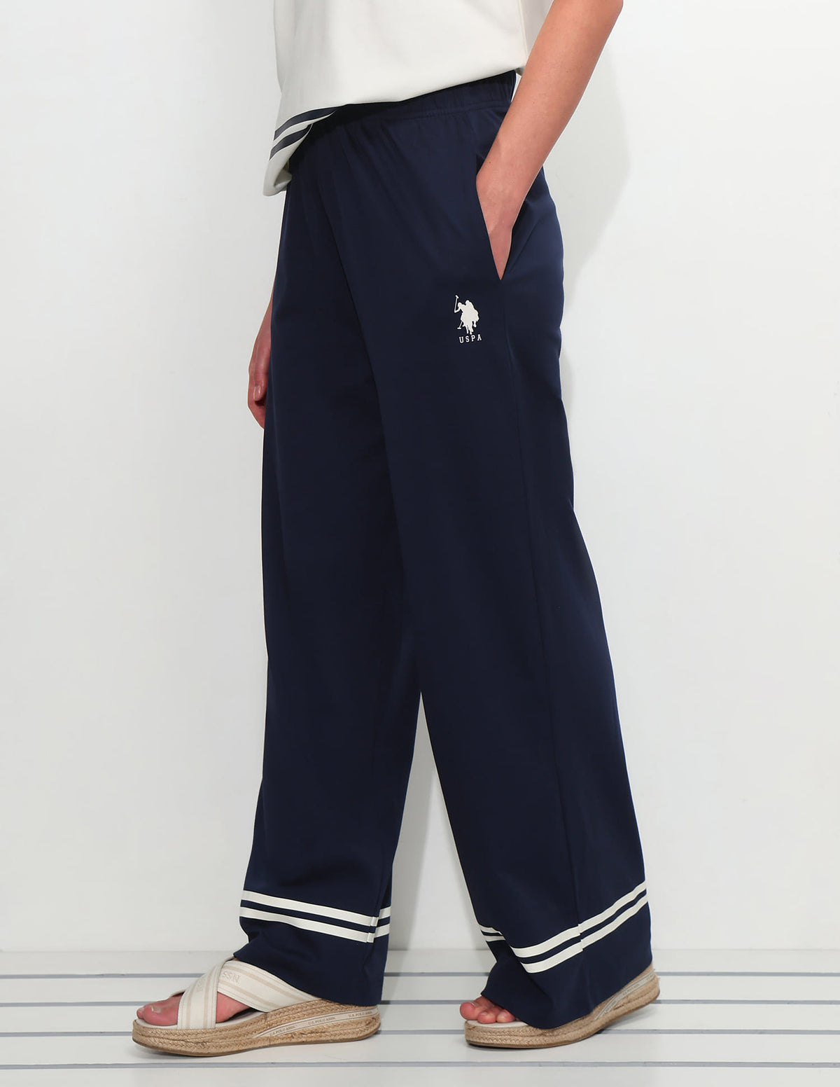 | High-rise waist | Slip-on closure | Two pockets | Flat front | Solid pattern | Regular weave | Wide leg fit |