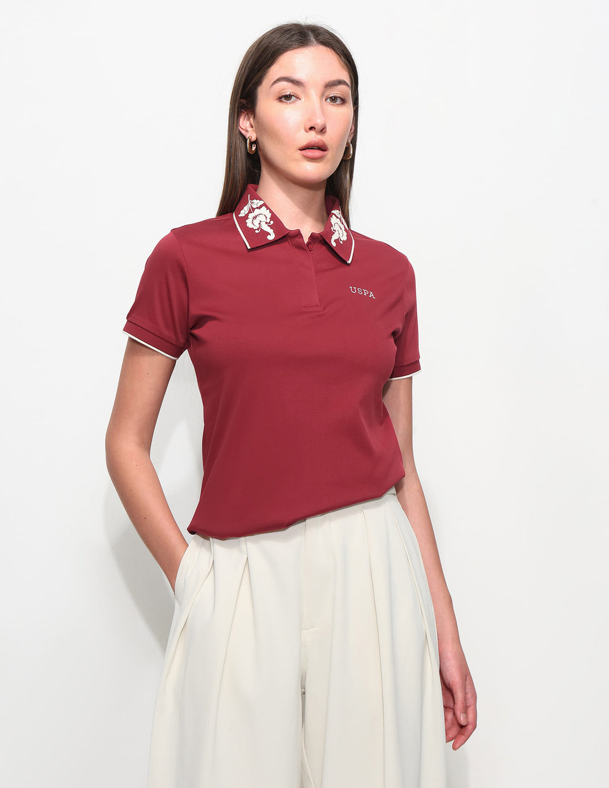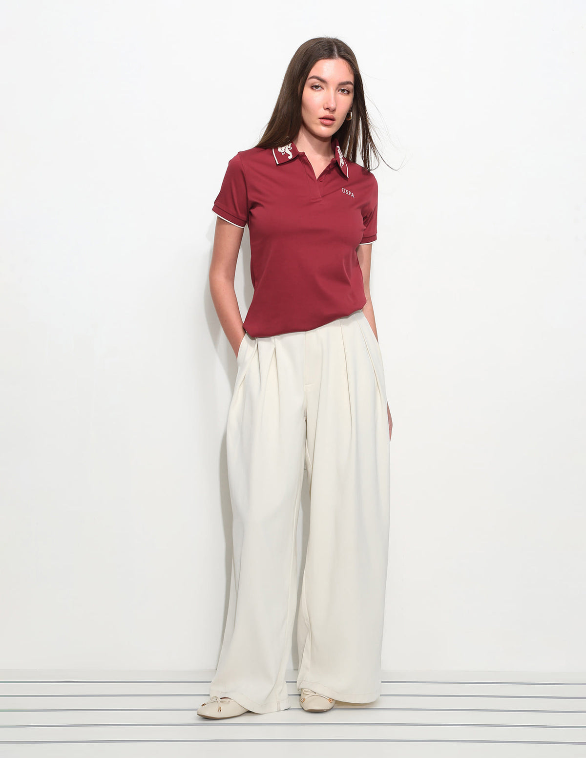 | Jacquard polo collar | Short button placket | Short sleeves | Ribbed collar and sleeve hems | Uneven vented hem | Solid pattern | Pique knit | Regular fit |